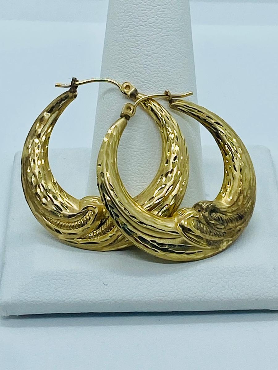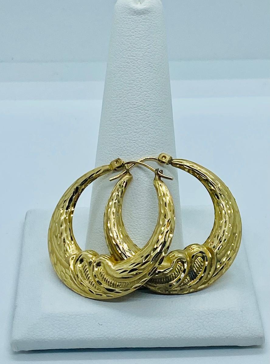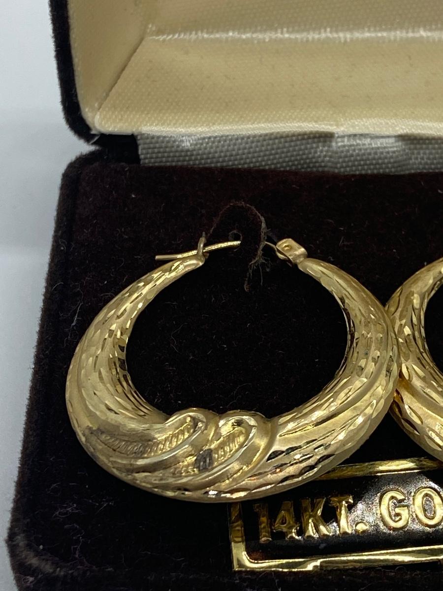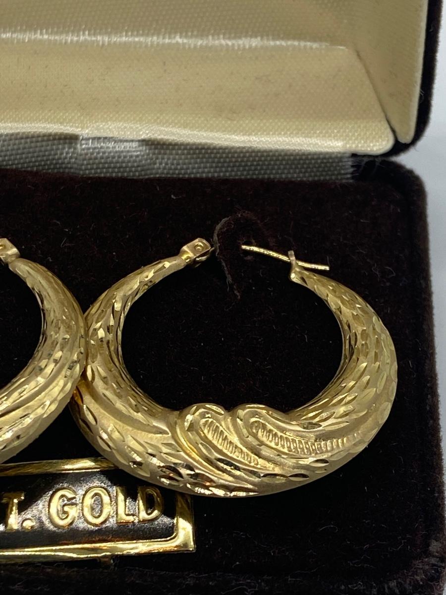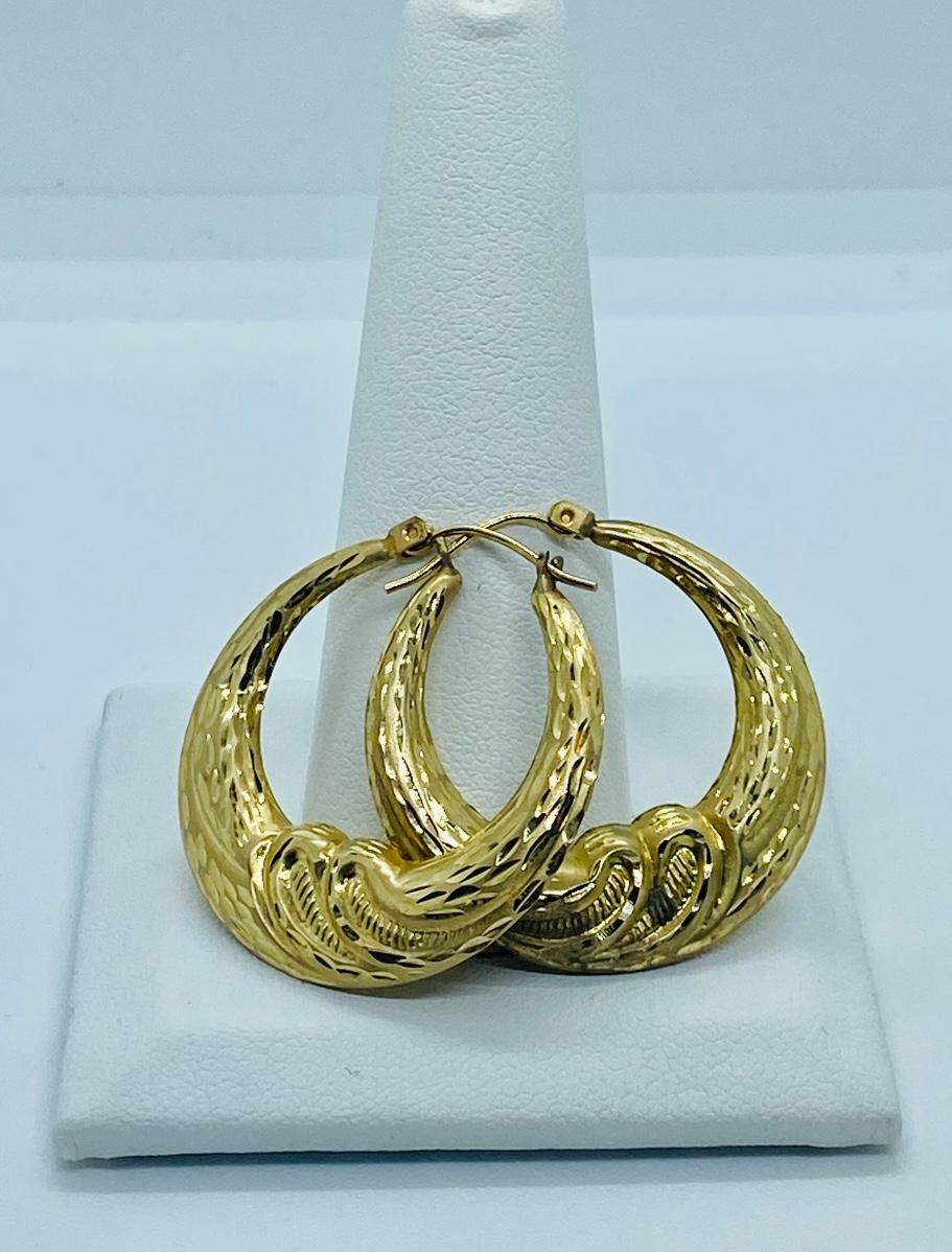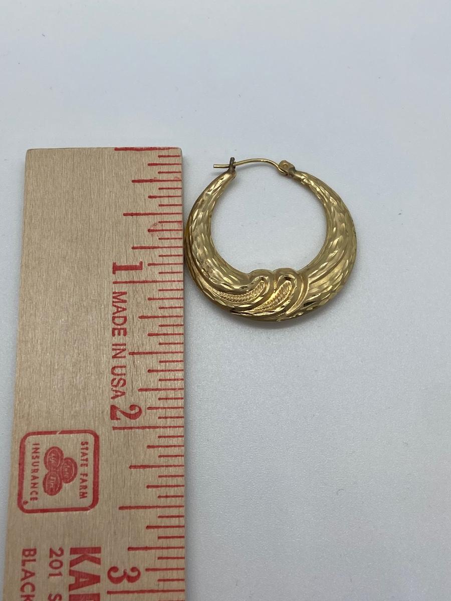 14k Gold Hoop Earrings with delicate details for pierced ears. Please see all pictures as they are the best representation of the items. The pictures show condition, measurements if taken, and what is included in the lot. Due to the large amount that we photograph and the time frame, we are not always able to take measurements. All items unless noted, are pre-owned and have been used.