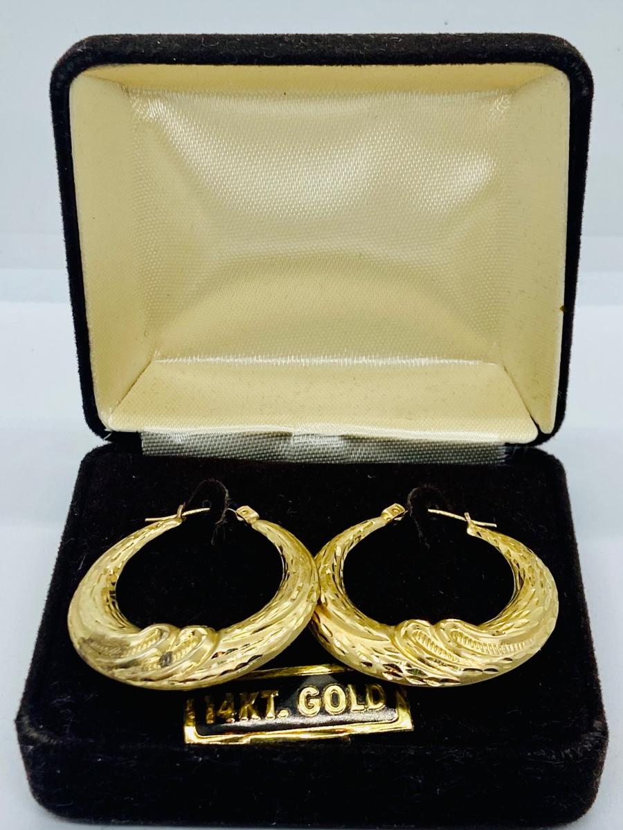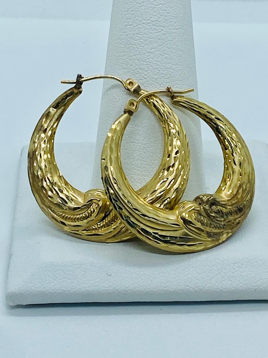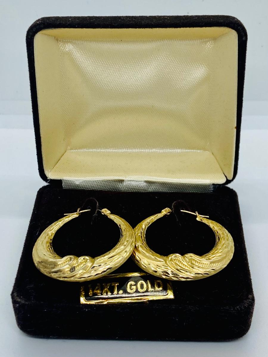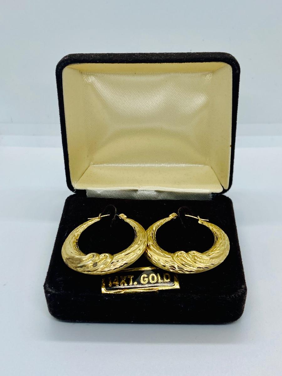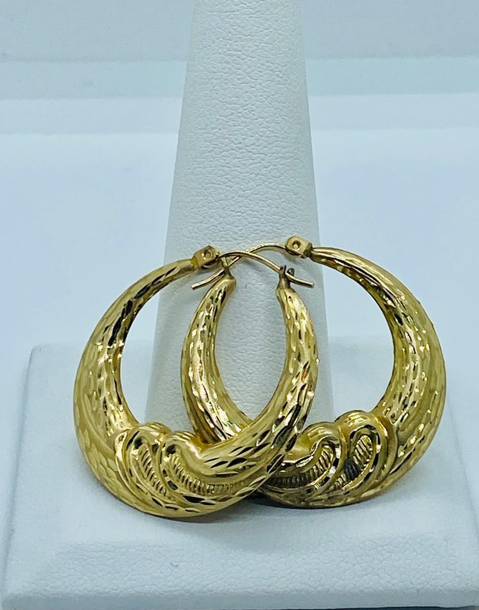 14k Gold Hoop Earrings with delicate details for pierced ears. Please see all pictures as they are the best representation of the items. The pictures show condition, measurements if taken, and what is included in the lot. Due to the large amount that we photograph and the time frame, we are not always able to take measurements. All items unless noted, are pre-owned and have been used.