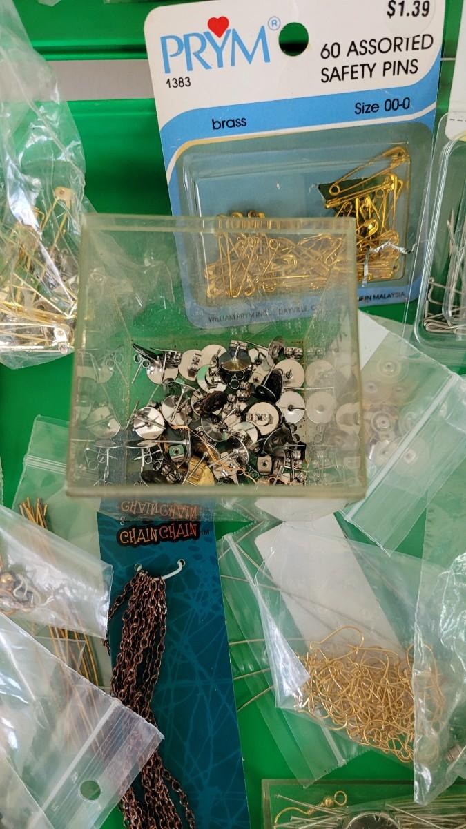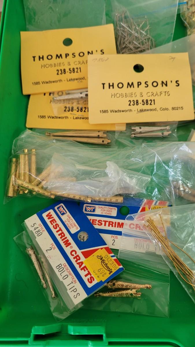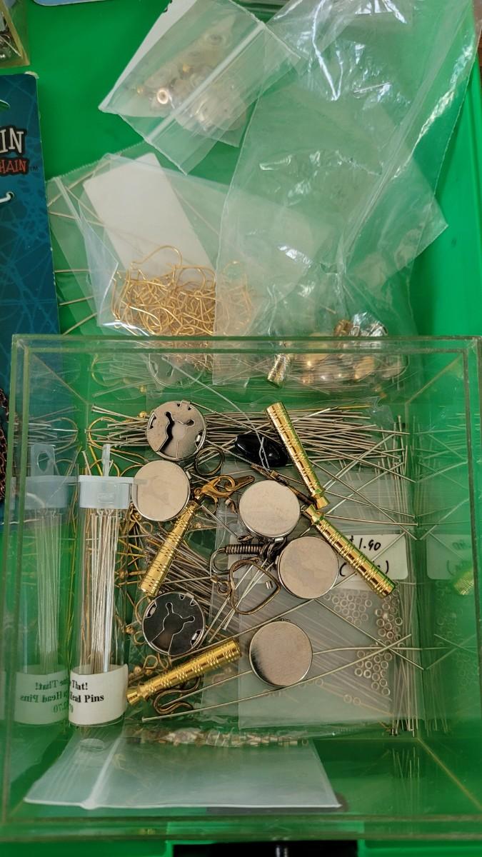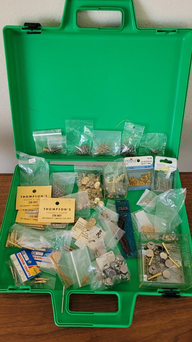 This green carry friendly box is filled with Earring backs/Hooks ect., Necklace/Bracelet Clasps, Bolo Ends and more!