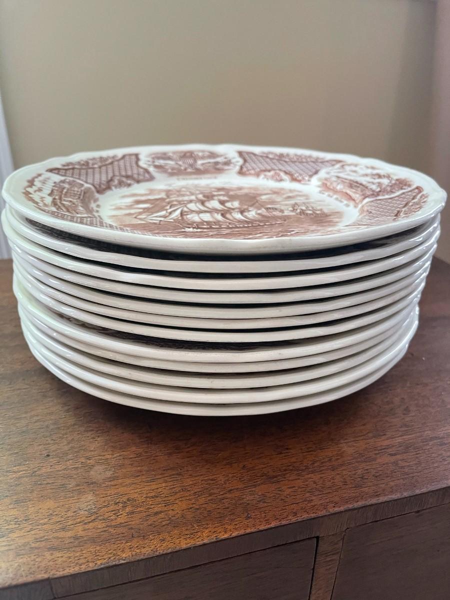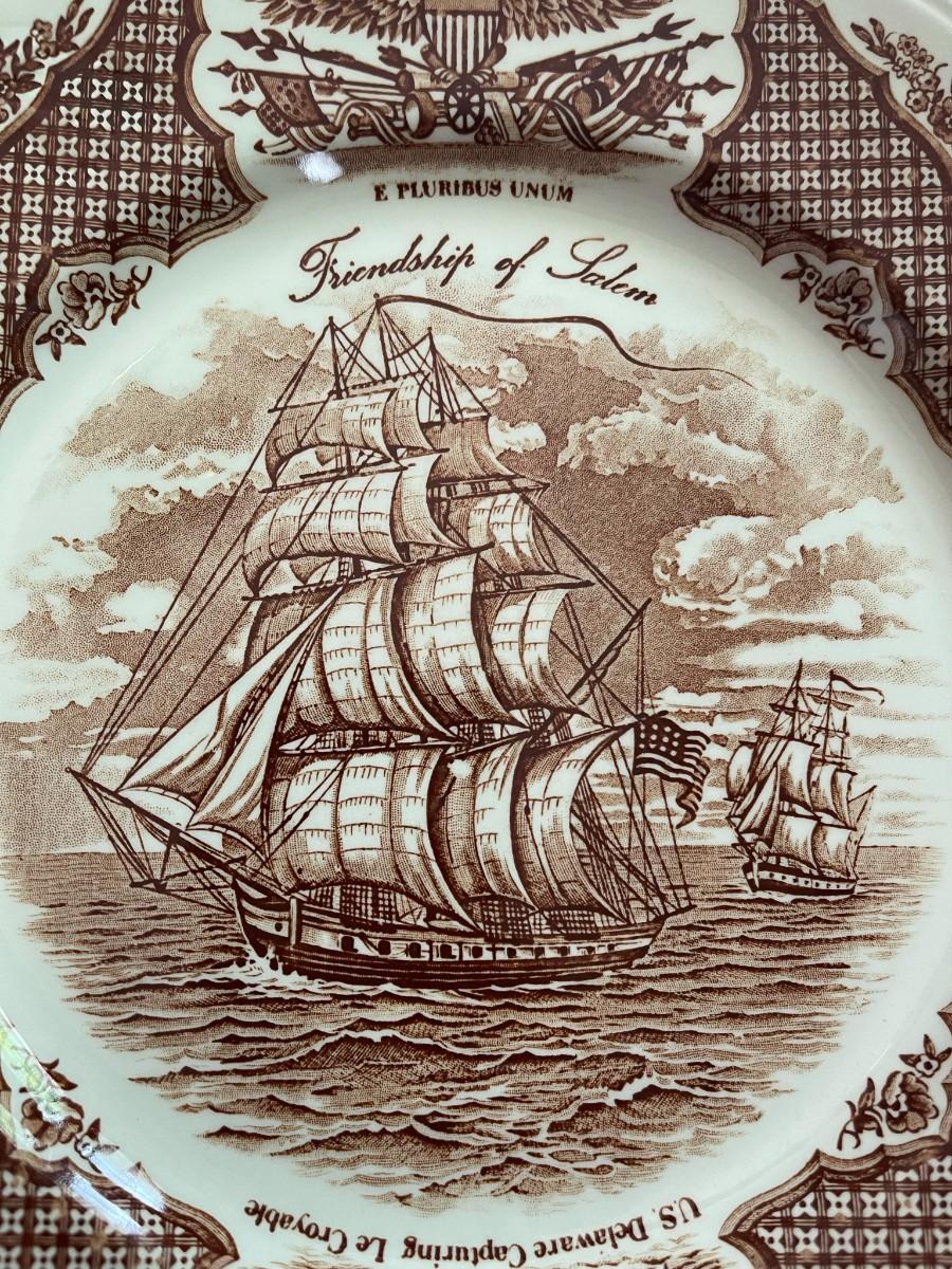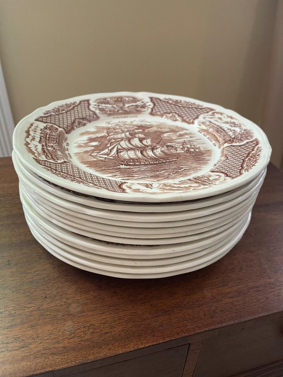 Alfred Meakin Fair Winds, Brown, "Friendship of Salem", Dinner Plates. Staffordshire, England.