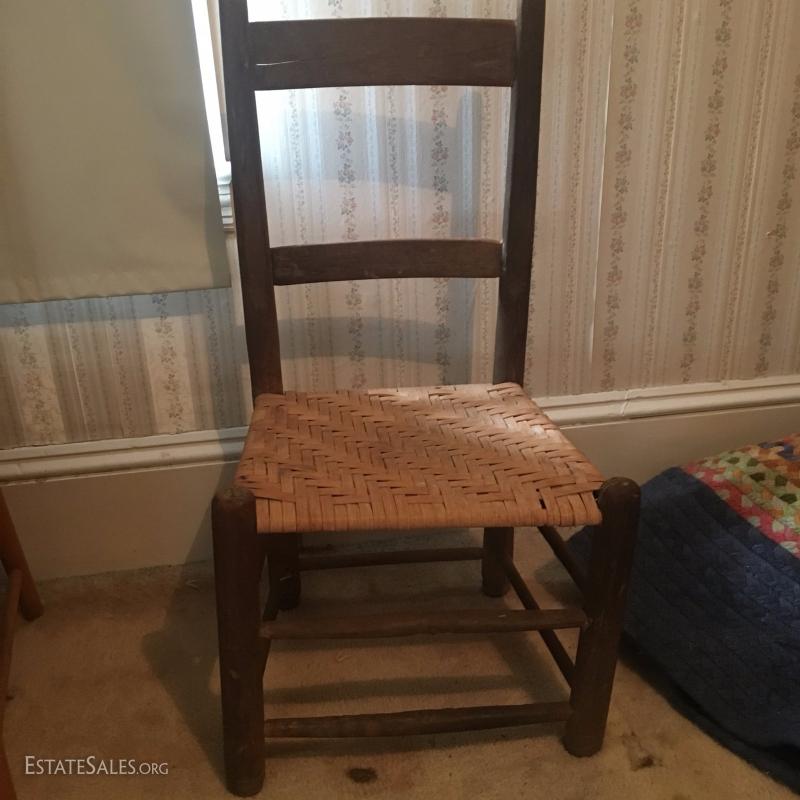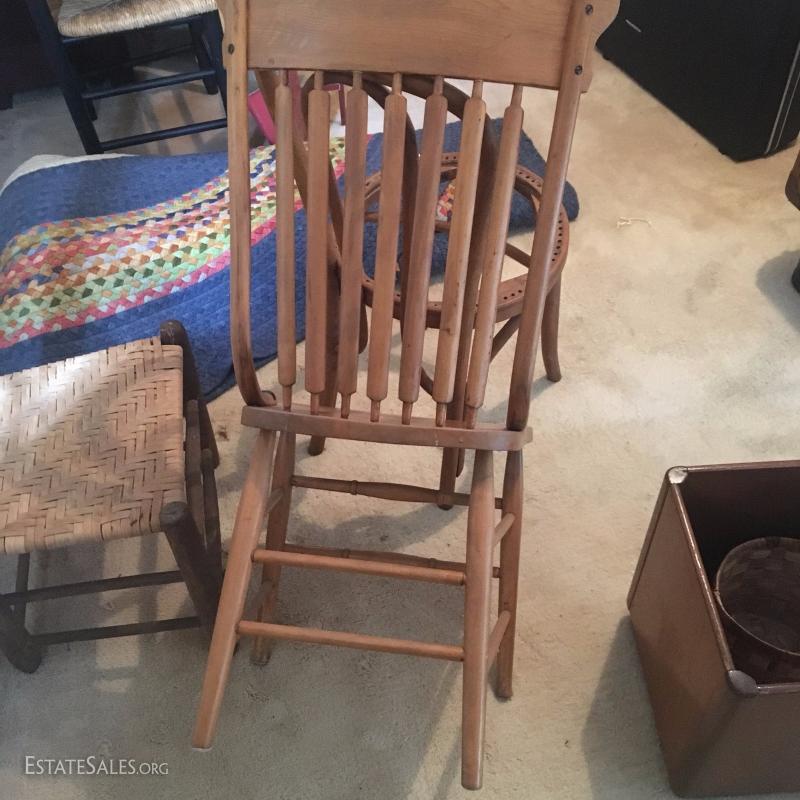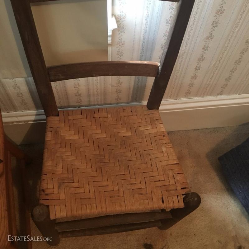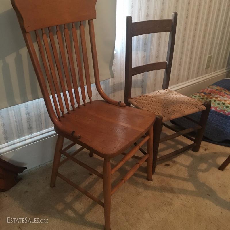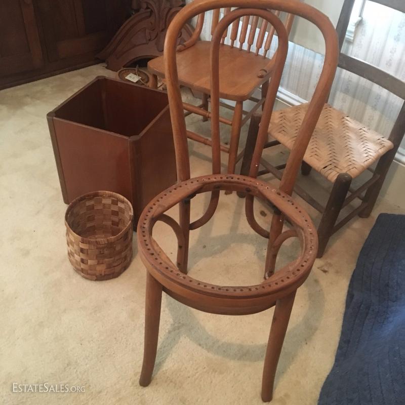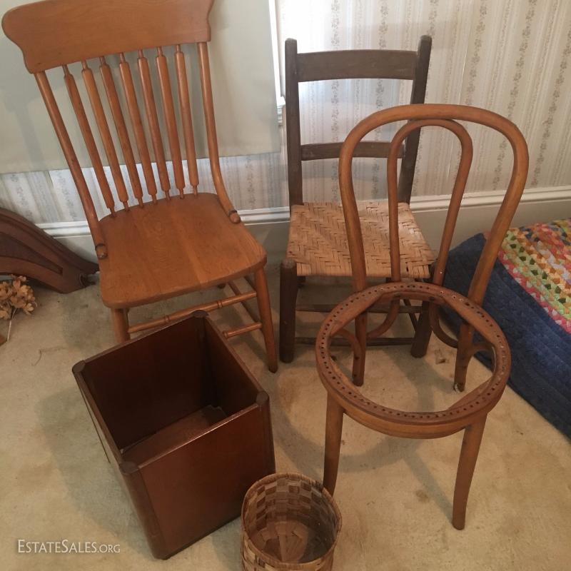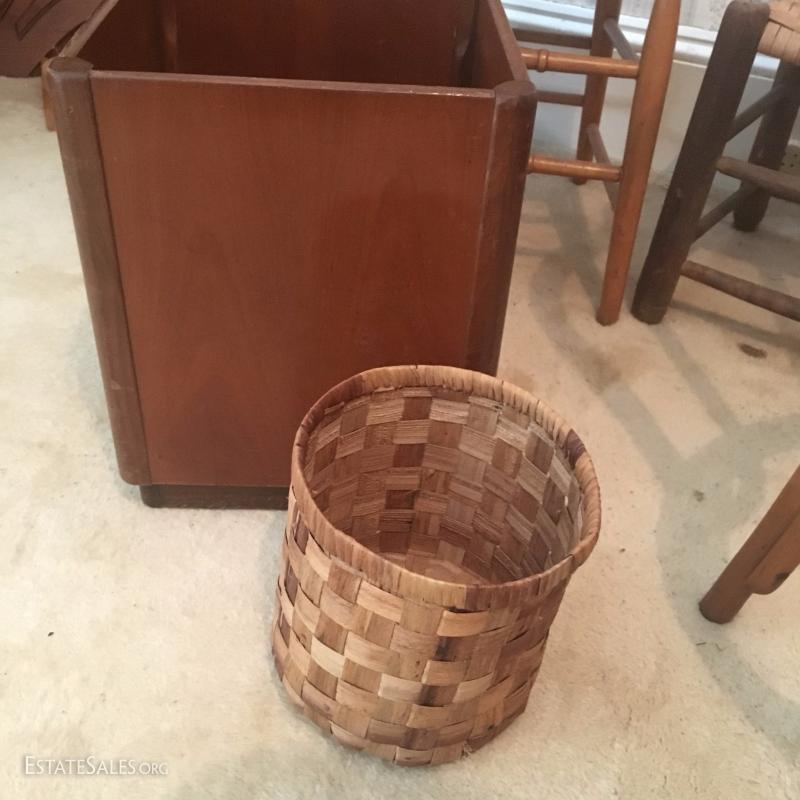 Three assorted wood chairs. Tallest is 38" tall. One missing seat. Wooden trash can is 13"L x 13"w x 16" tall. Also small basket. 9"d x 9" tall.