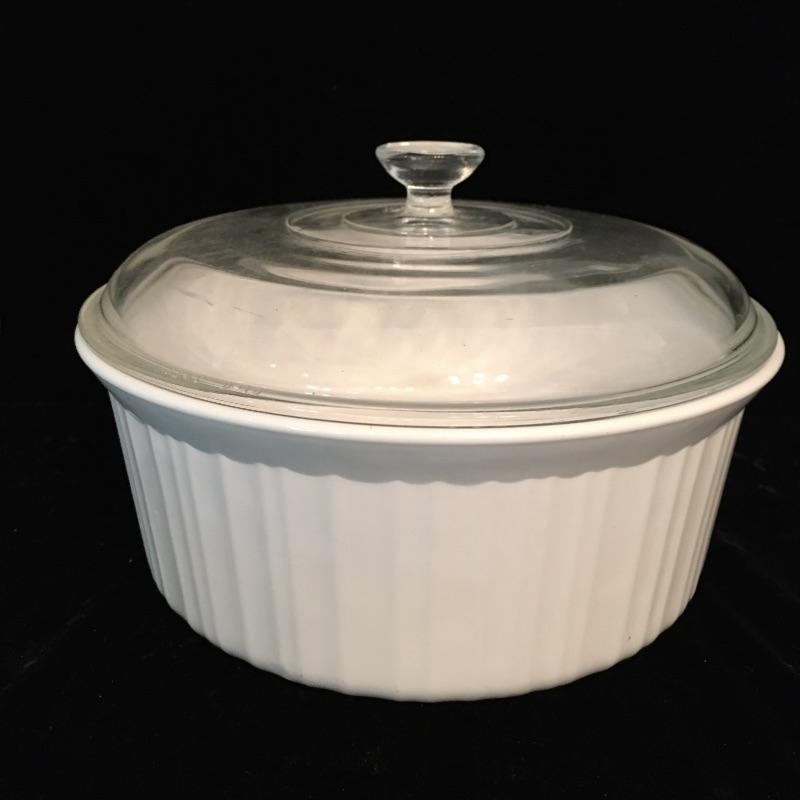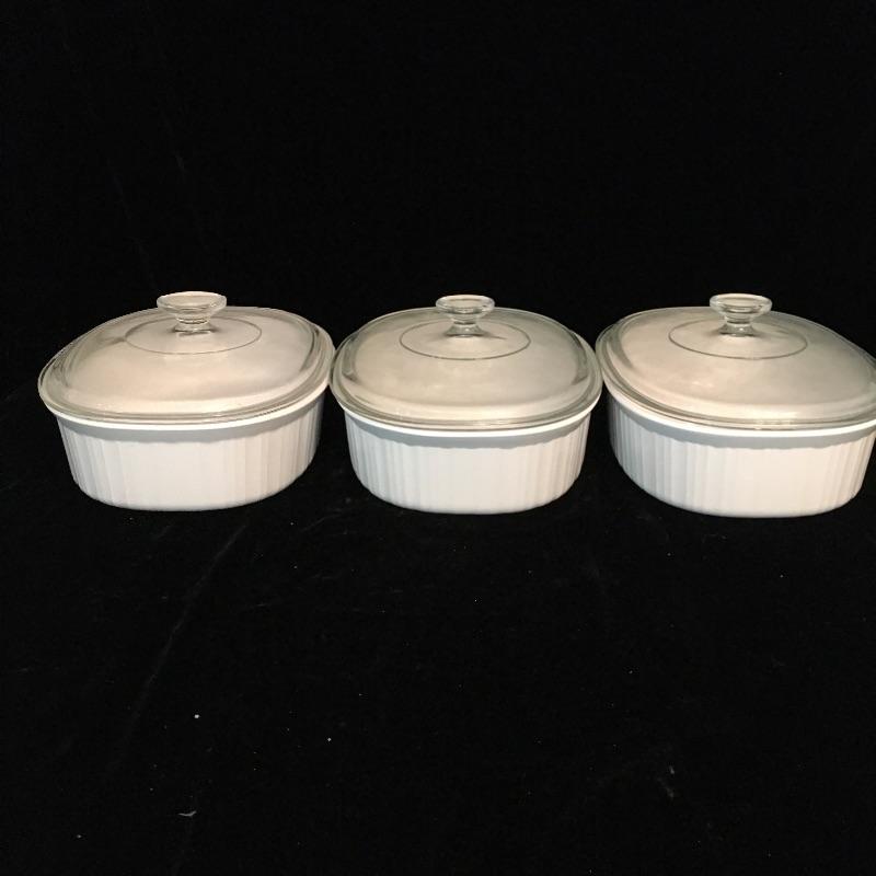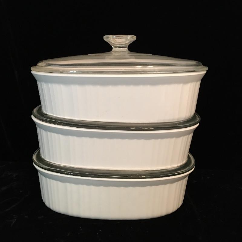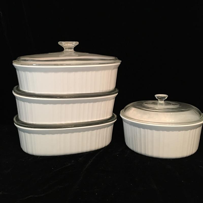 Nice selection of white pieces here with eight pieces of Corning ware, Anchor Hocking pie plate and bowl and Pyrex bowl. Largest Corning Ware 11” x 9” x 3.25”.