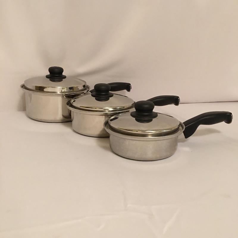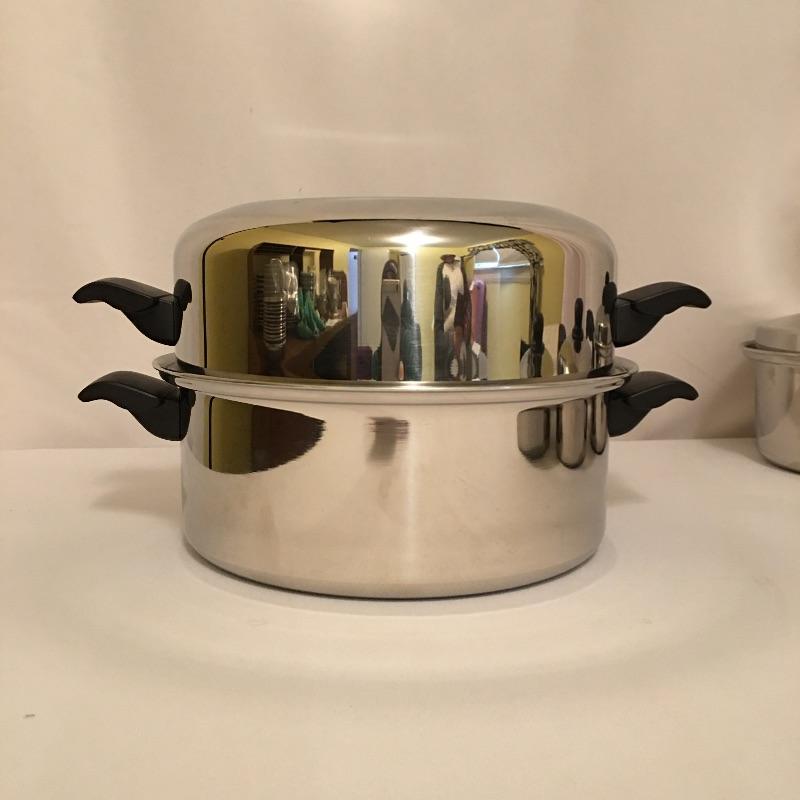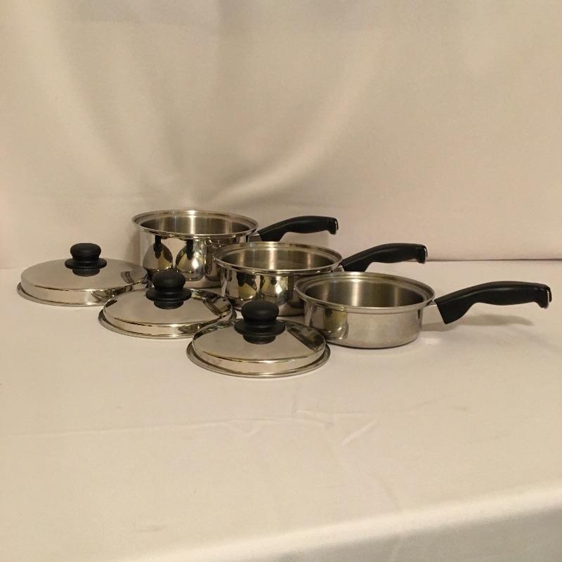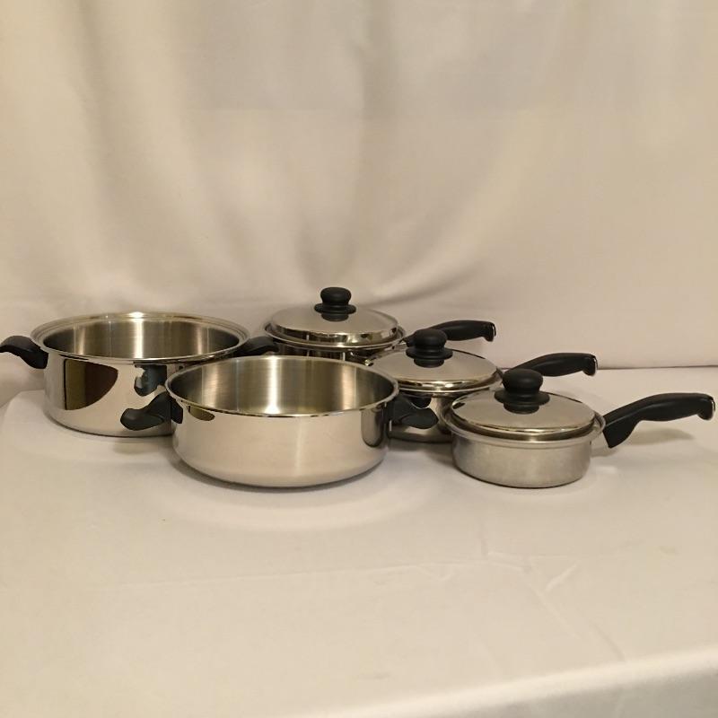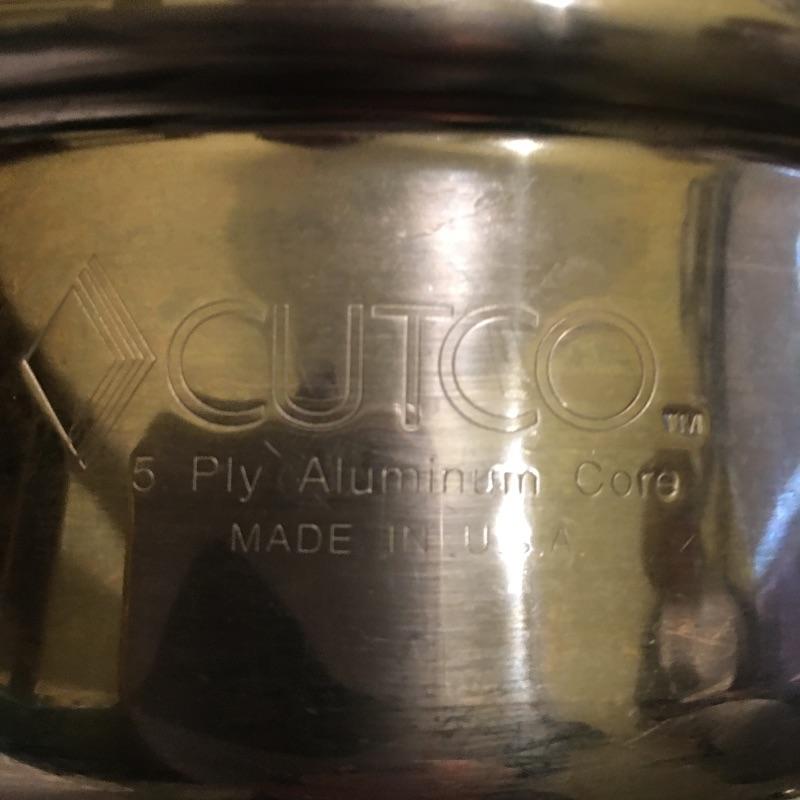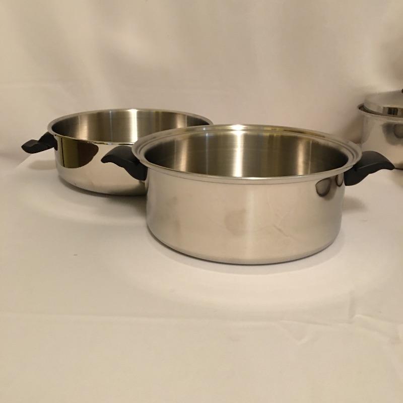 Cutco cookware is an eight piece set that includes three pots with lids and one large pot with lid. Largest pot measures 11.5”D x 8.5” tall.