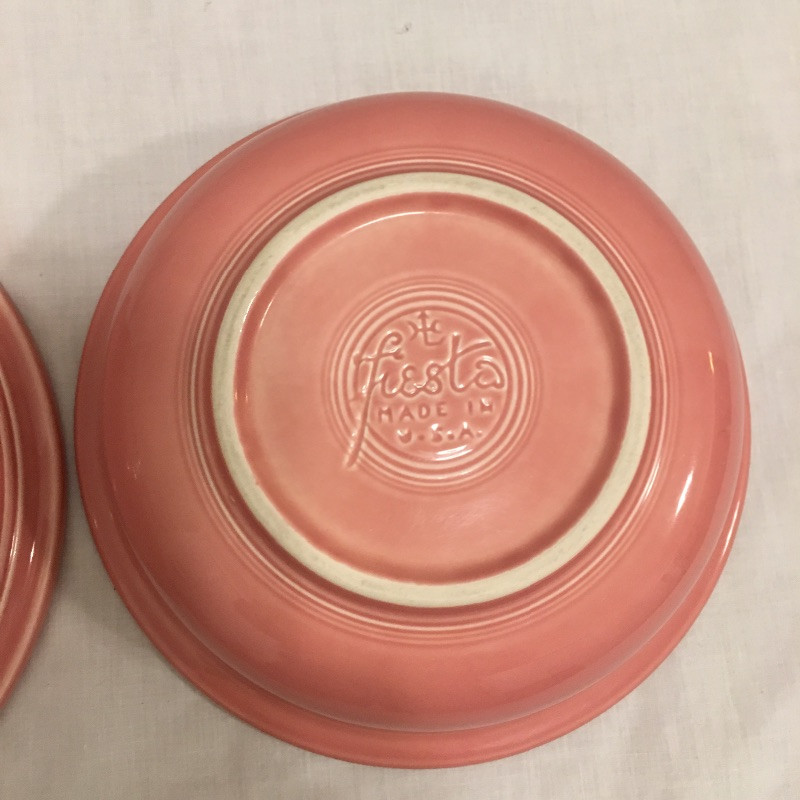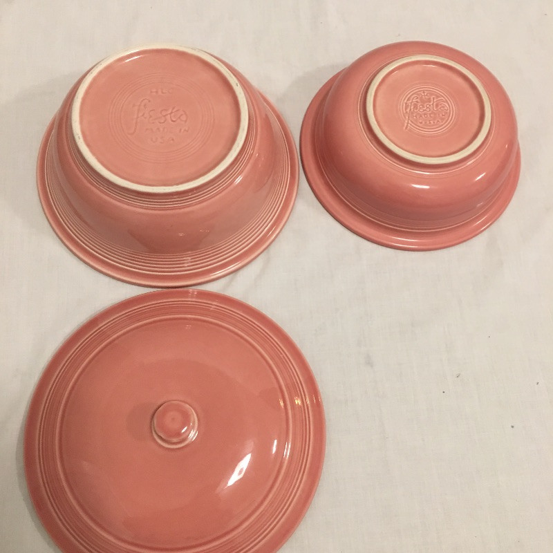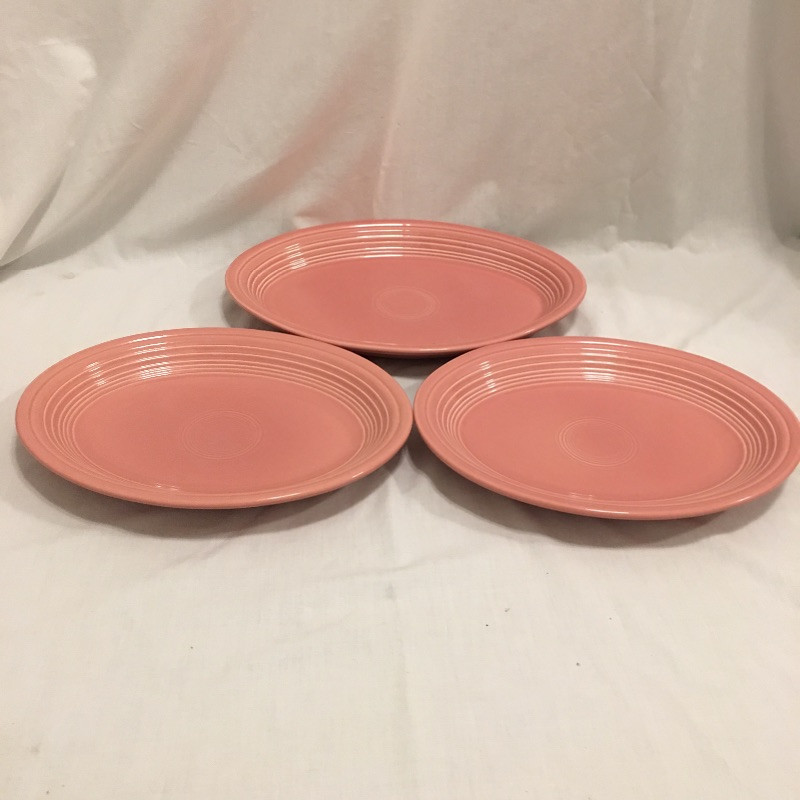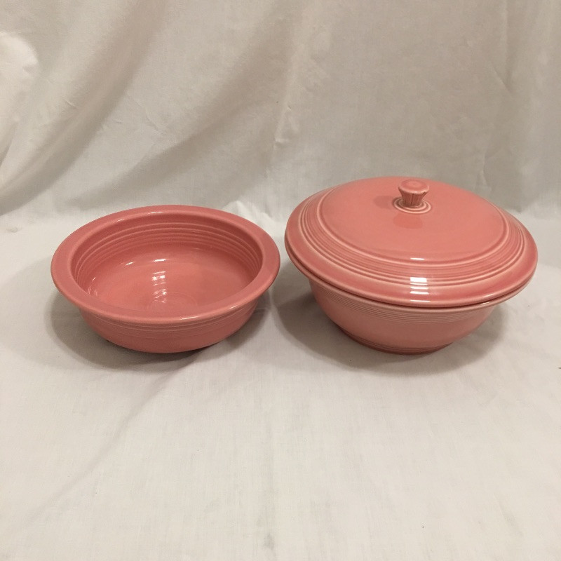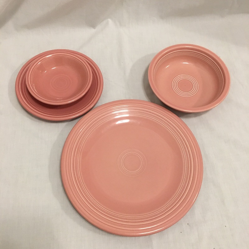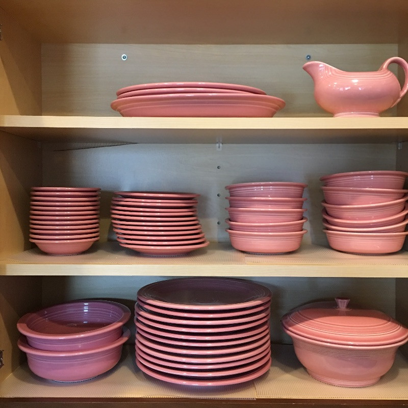 Add color and flair to your table with this large pink collection of matching Fiesta dinnerware with eleven place settings in total. Also included is a gravy boat, three platters, two medium bowls and one covered bowl. Largest platter measures 9.5” x 13.5” x 1.5”. This dish set is sure to add color to your table.