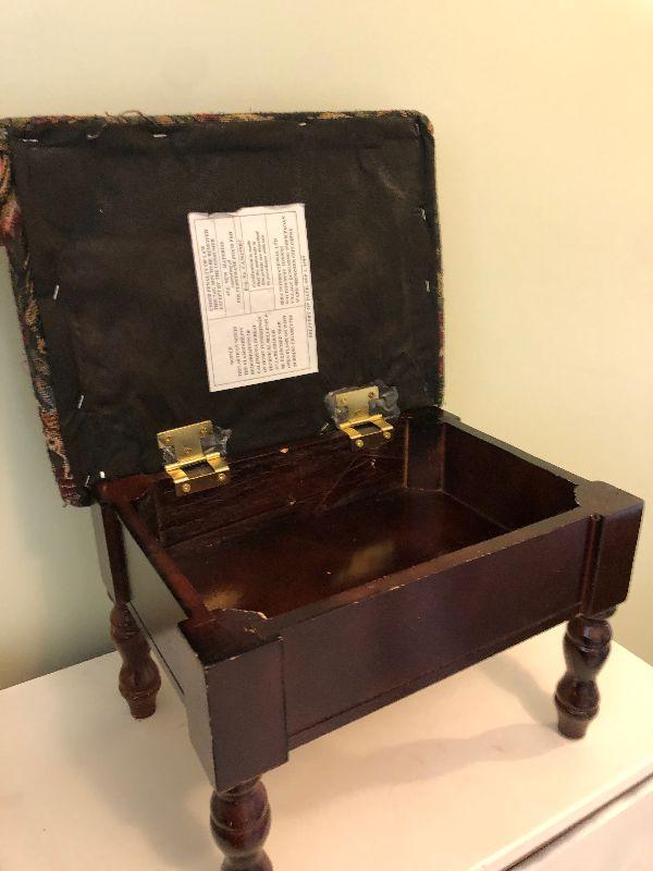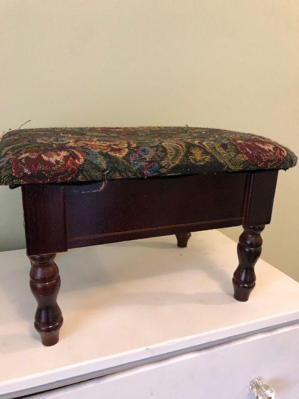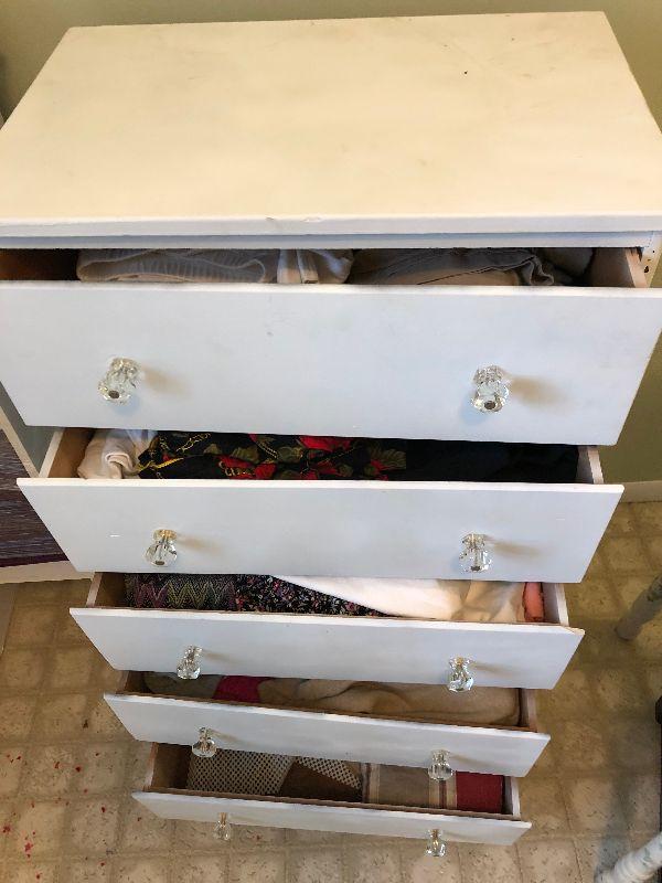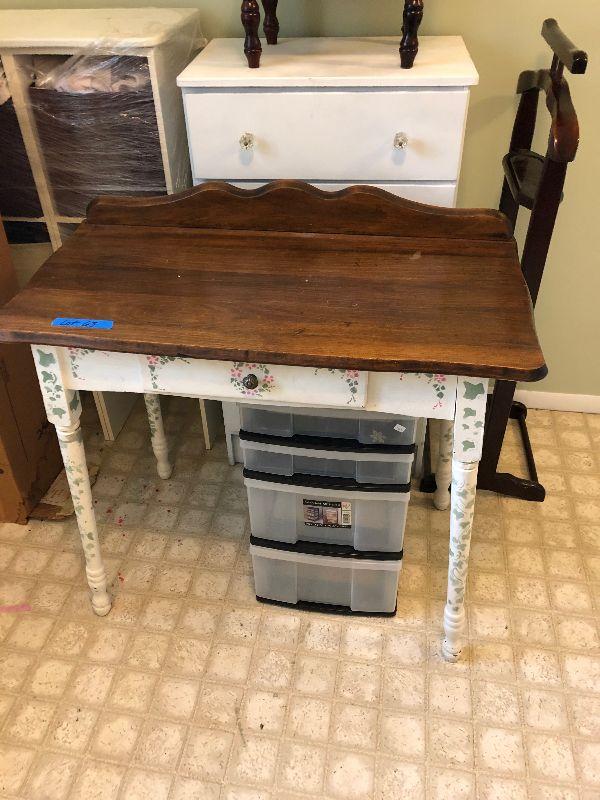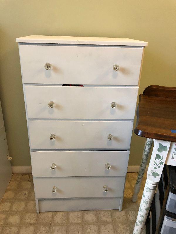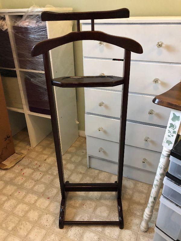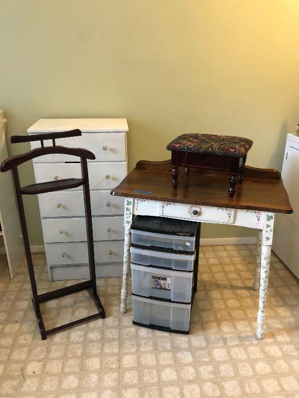 Narrow chest of drawers, desk, valet, footstool, and rolling cabinet
