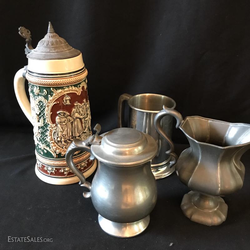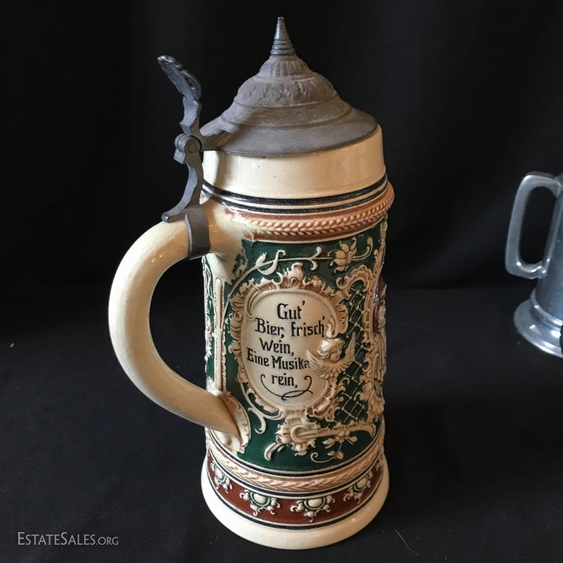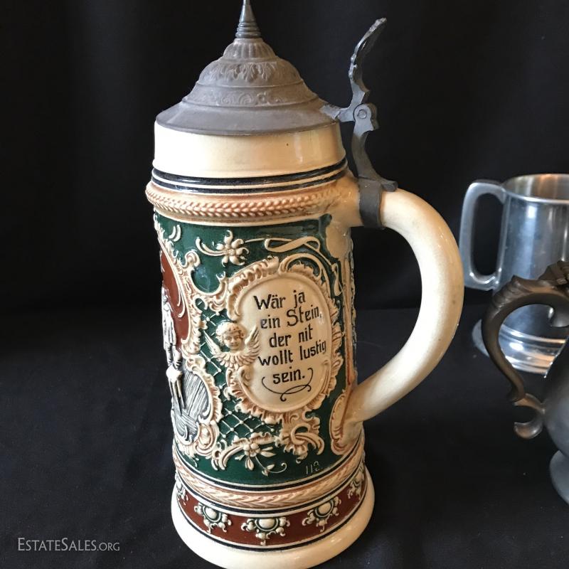 1-liter German stein. Fabulous scene. See photos for details. Other pewter pieces included. You can see marks in pic. Shipping available or local pick up in Flat Rock, NC.