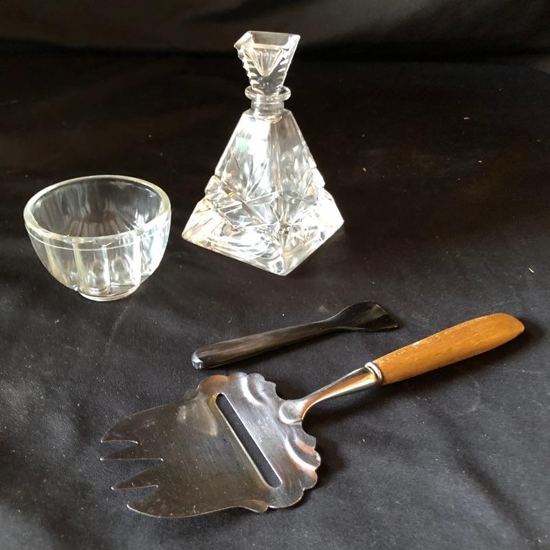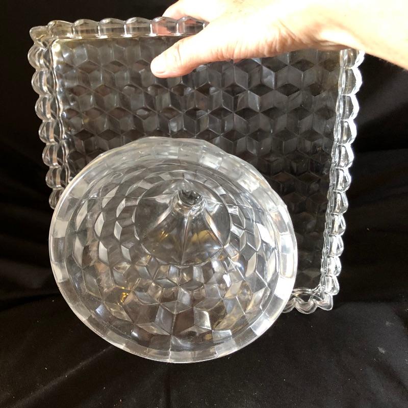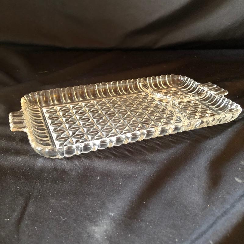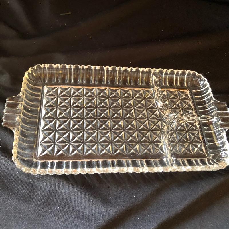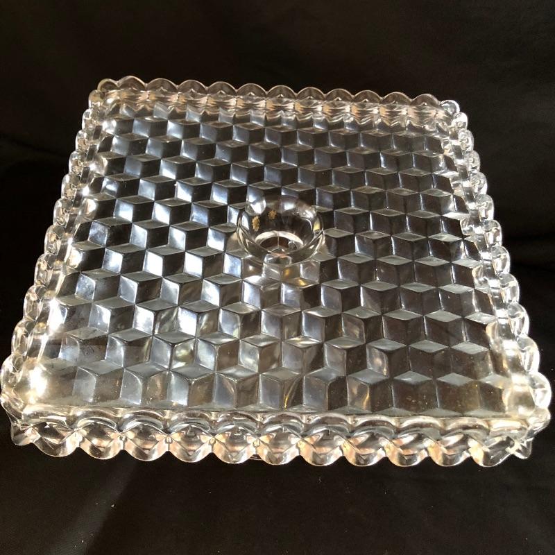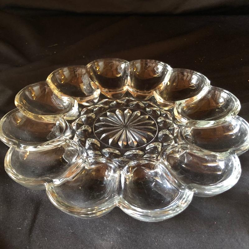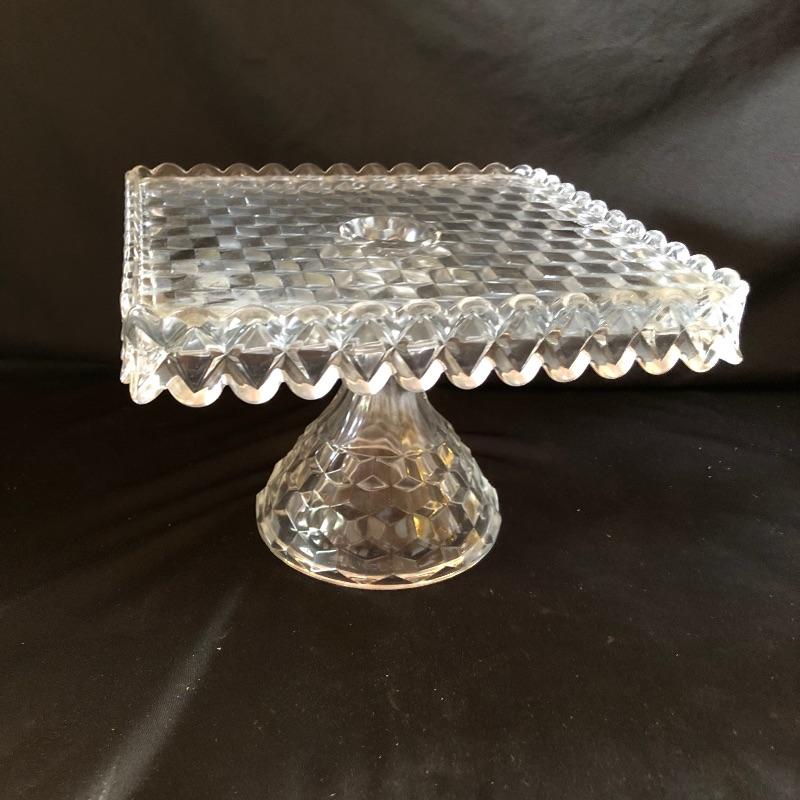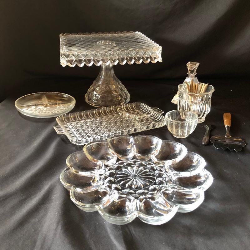 Lots of great glass pieces for the classy dinner table in this lot! The largest piece is an elegant cake stand that stands 7” tall with a 9.5” square top. Also included is an deviled egg tray plus various other trays, glasses and more.