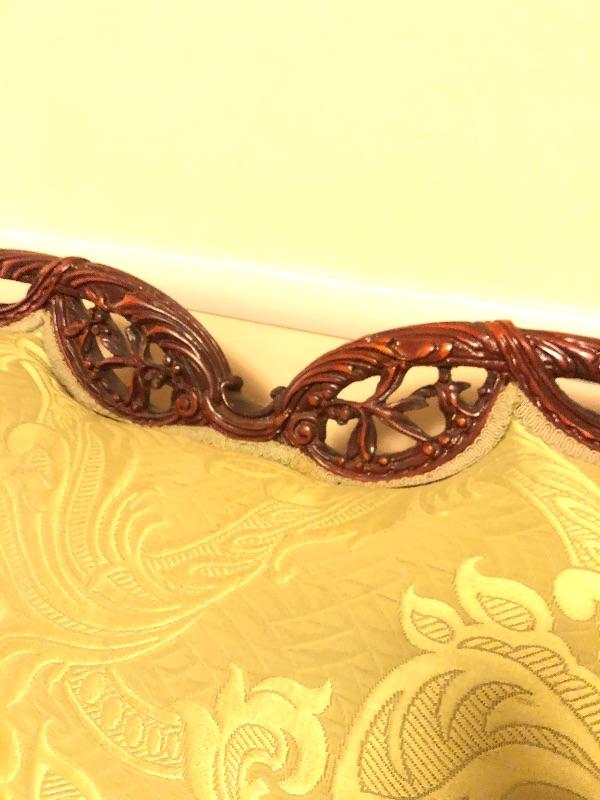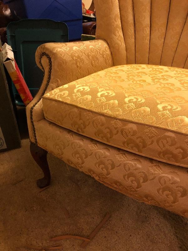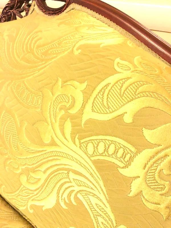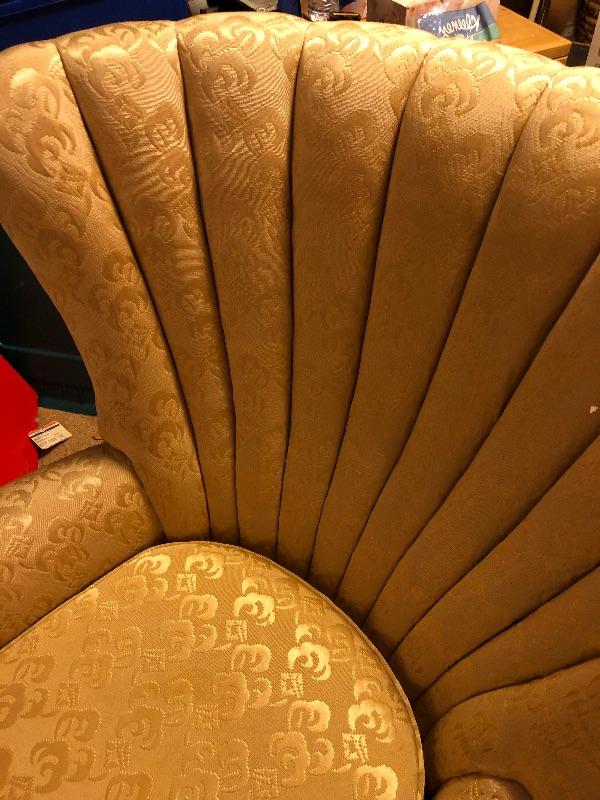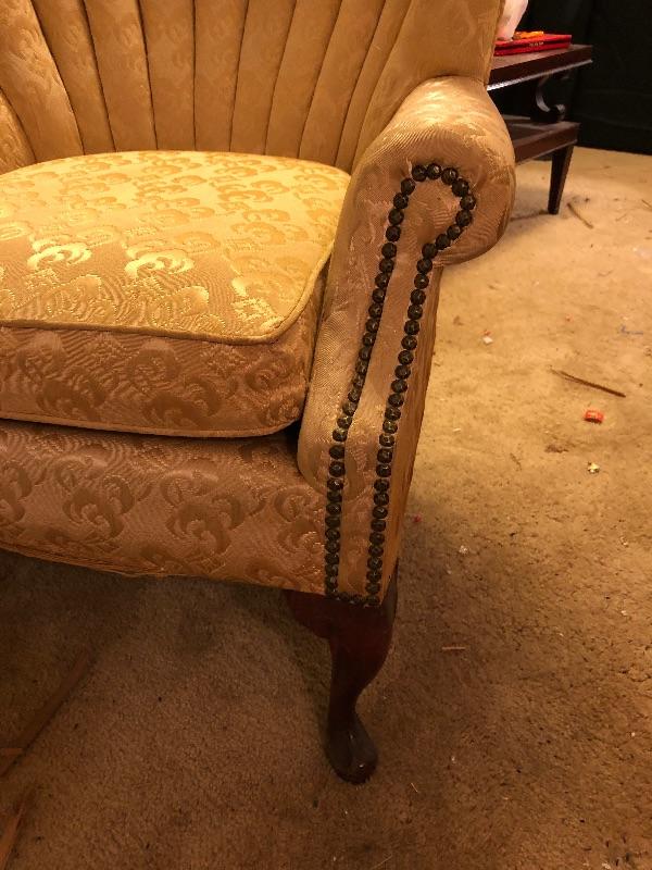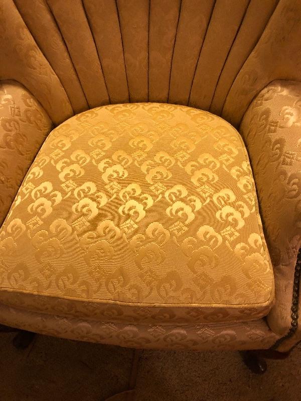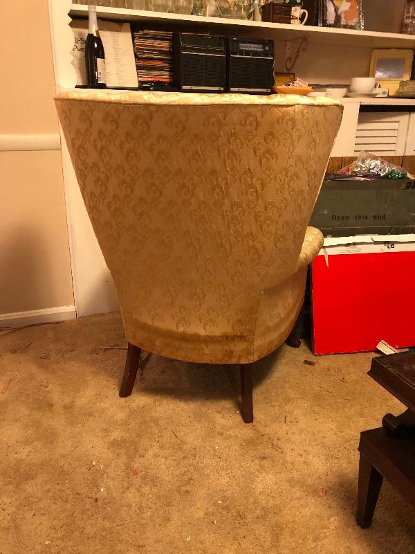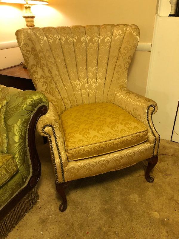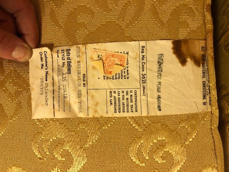 Upholstered chair is made by Chesterfield and custom made in USA by John Wanamaker, New York. Custom Color is June Gold.