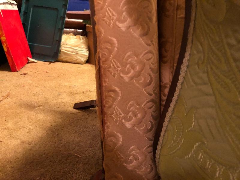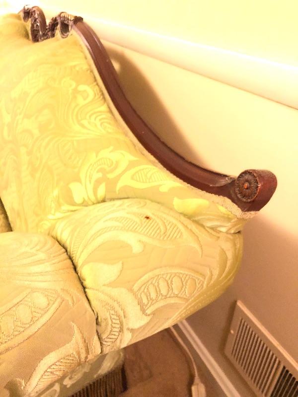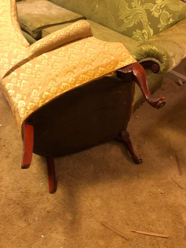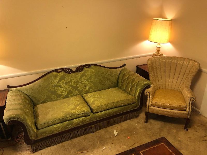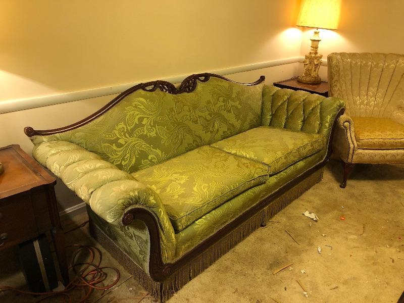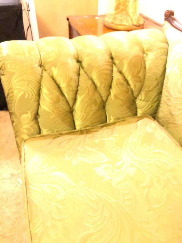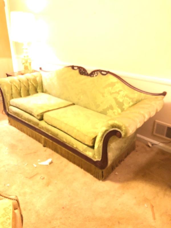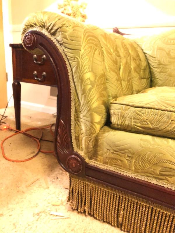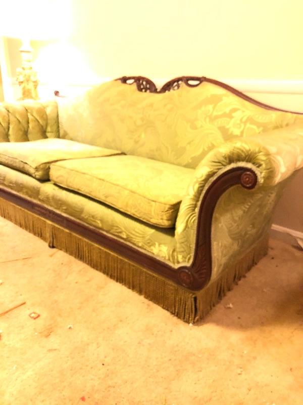 Hecht Co. Green Sofa - with fringe bottom. Custom made - Made in USA. Some damage on front and back as shown in picots.
