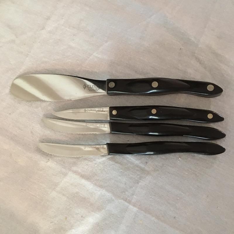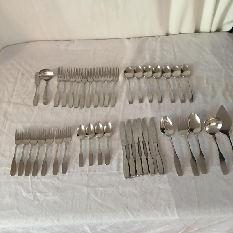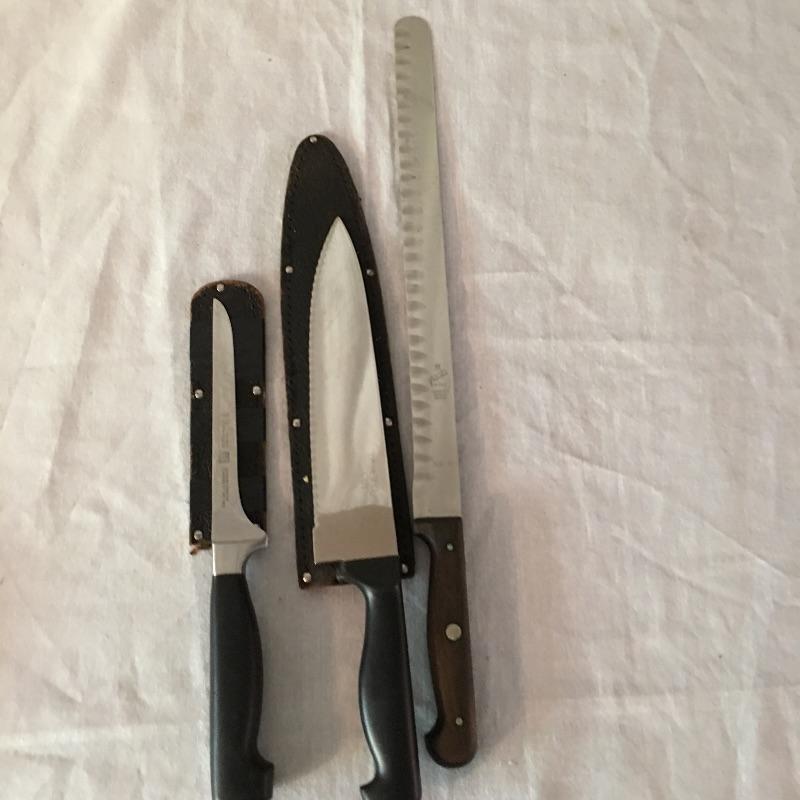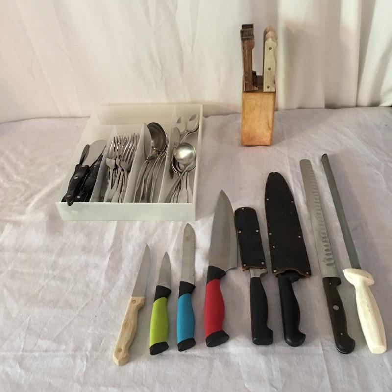 Knives and more includes Henckels, Farberware, Dansk, Diamond Cut, Friodur, Cutco and five piece, four place setting Community silverware with extras.