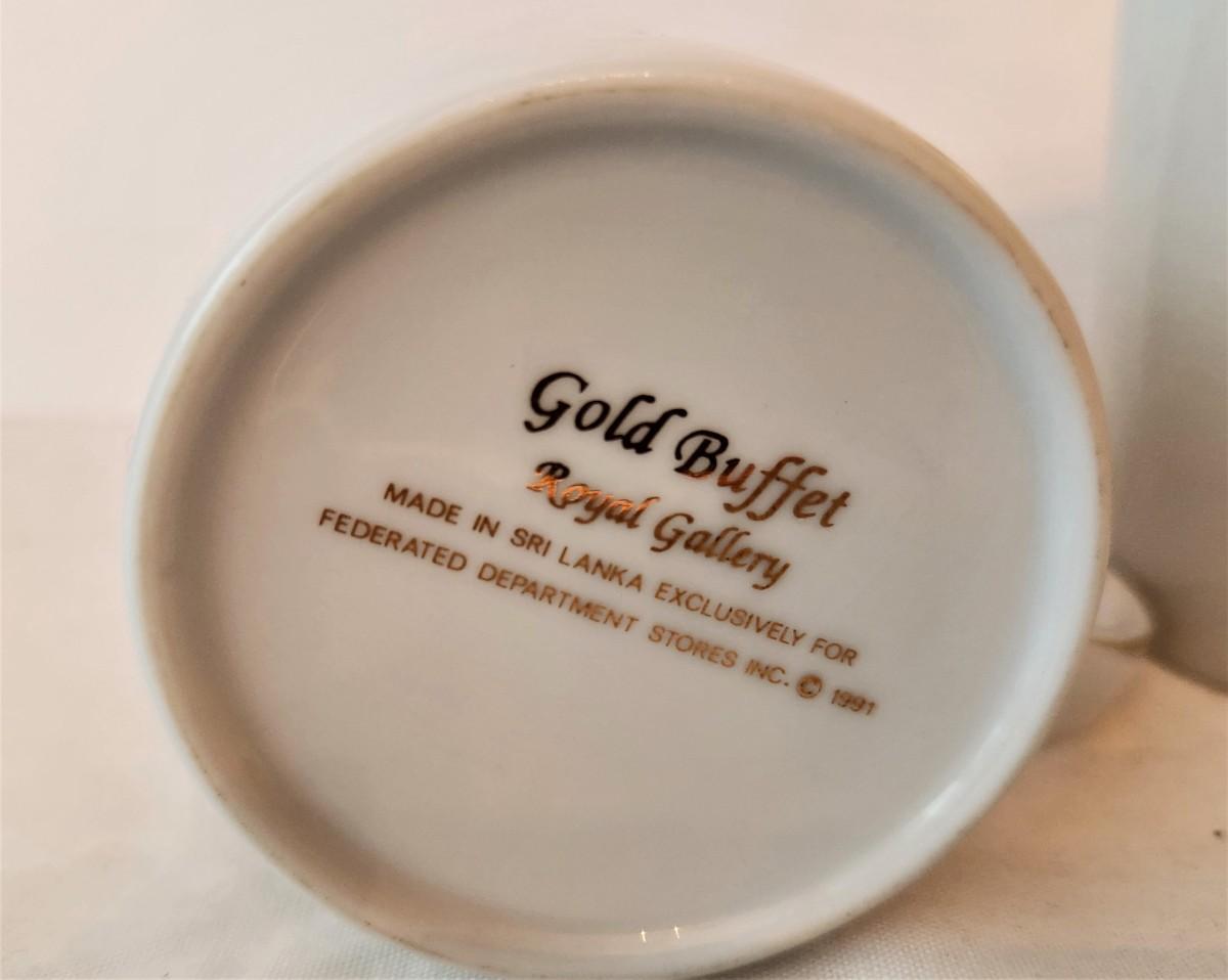 Made by Regal Gallery in 1991 (Federated Dept Stores) - Gold Buffet Faberge Eggs - lot of 4 coffee mugs. Each 3.75" tall - good condition, no box.