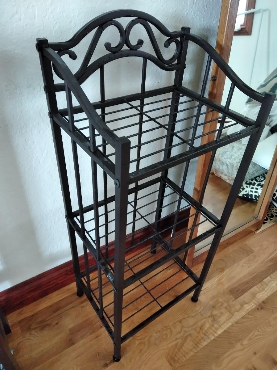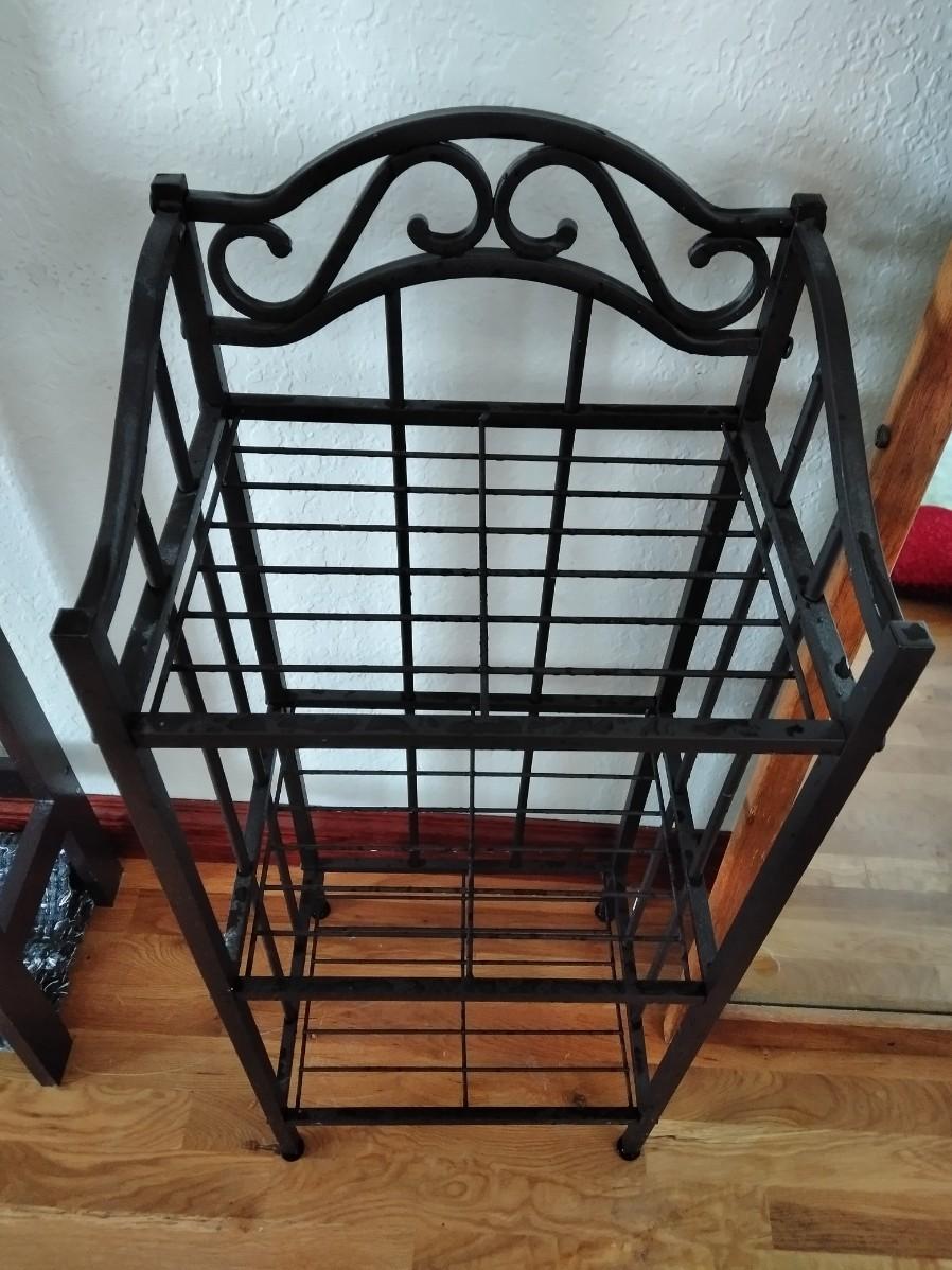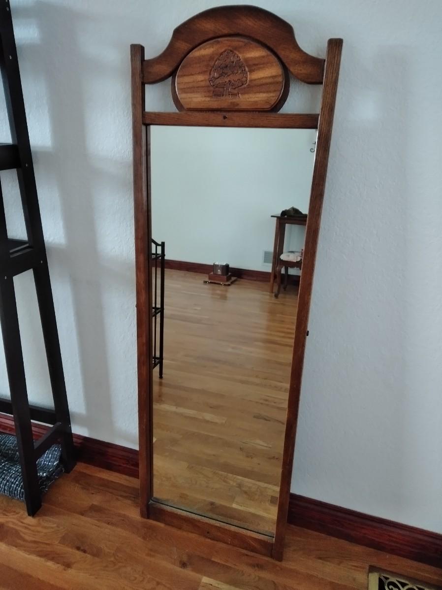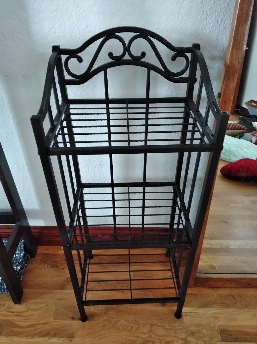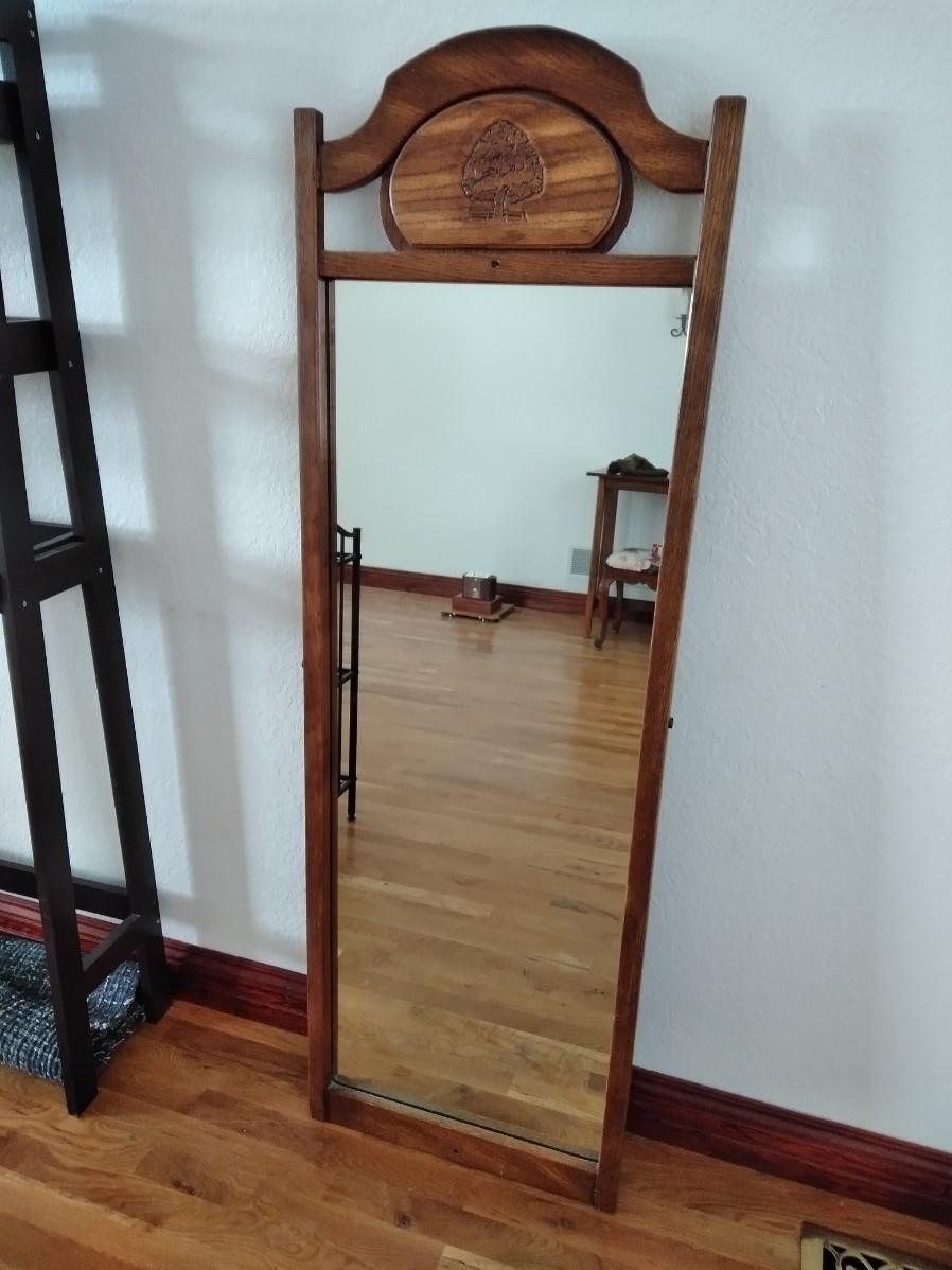 METAL SHELF 36" X 14.5" X 11" WITH WALL HANGING 59.5" TALL MIRROR WITH DECORATIVE TOP 19.5" WIDE.