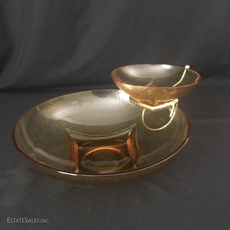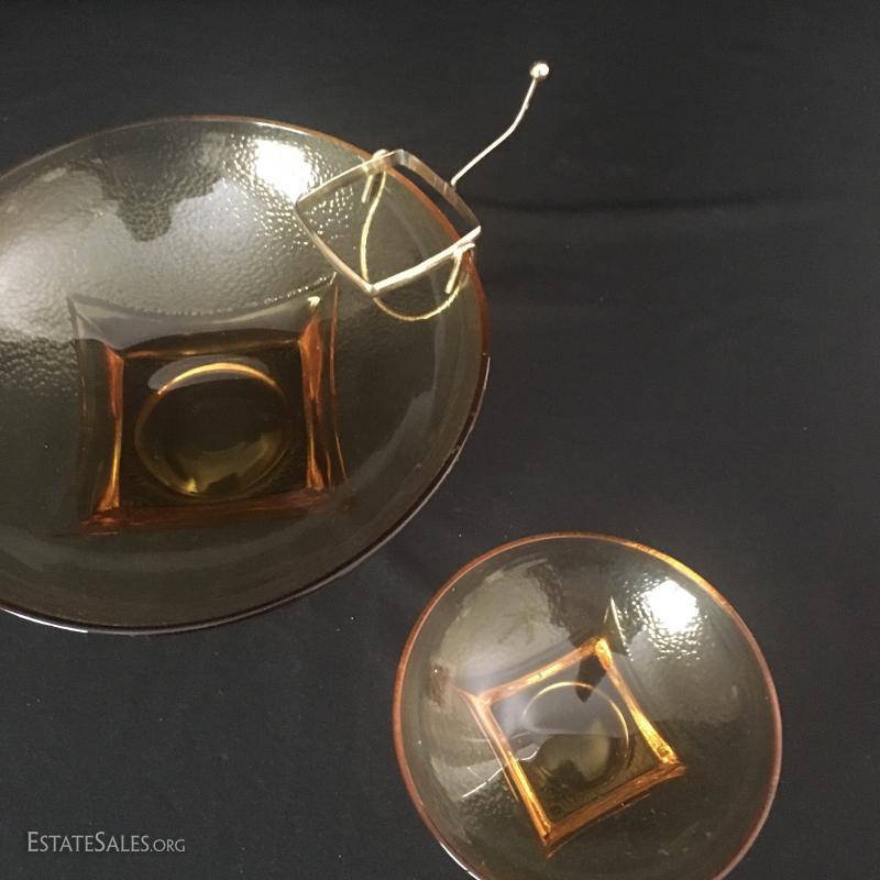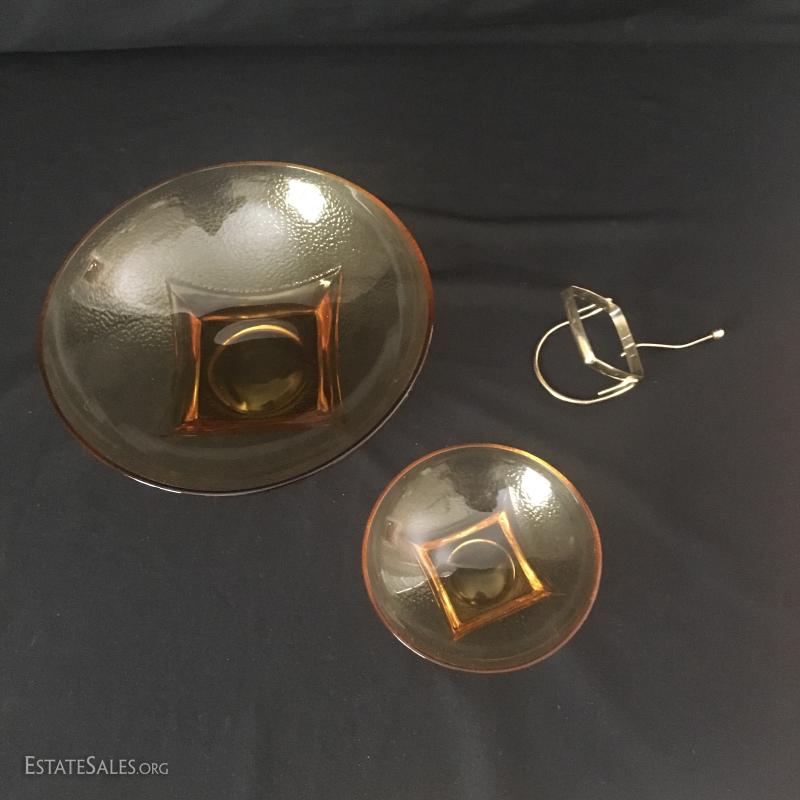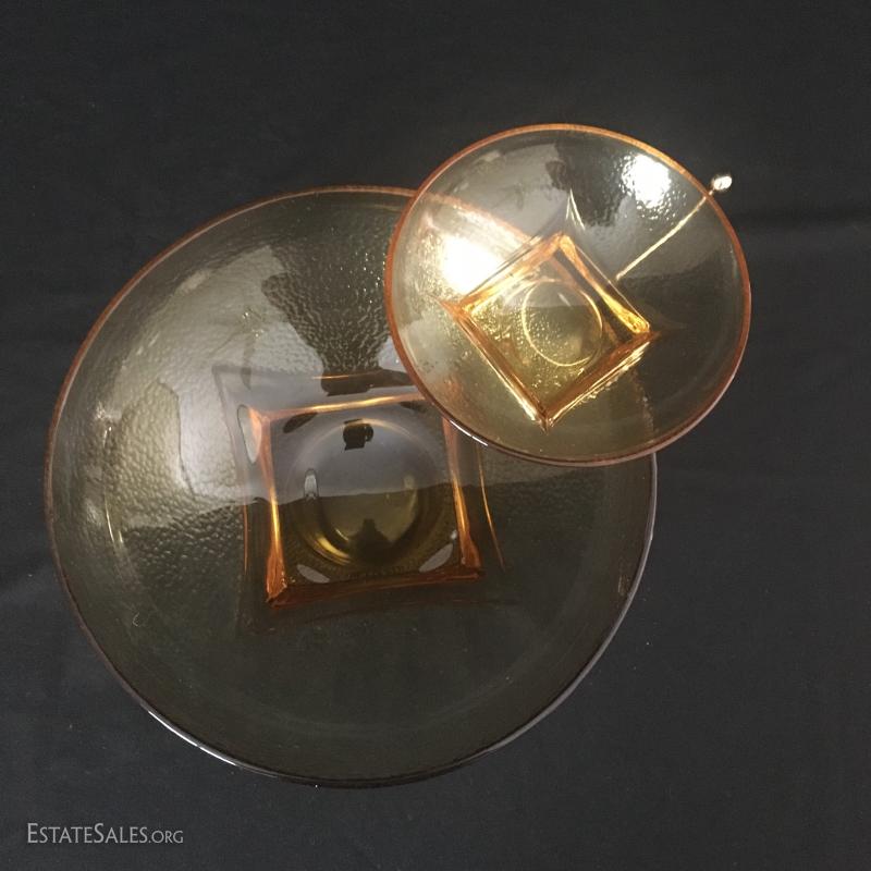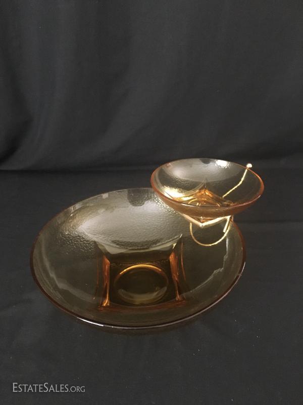 Yellow pattern glass with stand to hold small bowl on larger one. Fun piece with no damage apparent. This lot is available for shipping or local pick up in Asheville, NC.