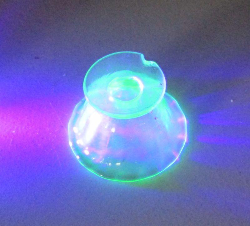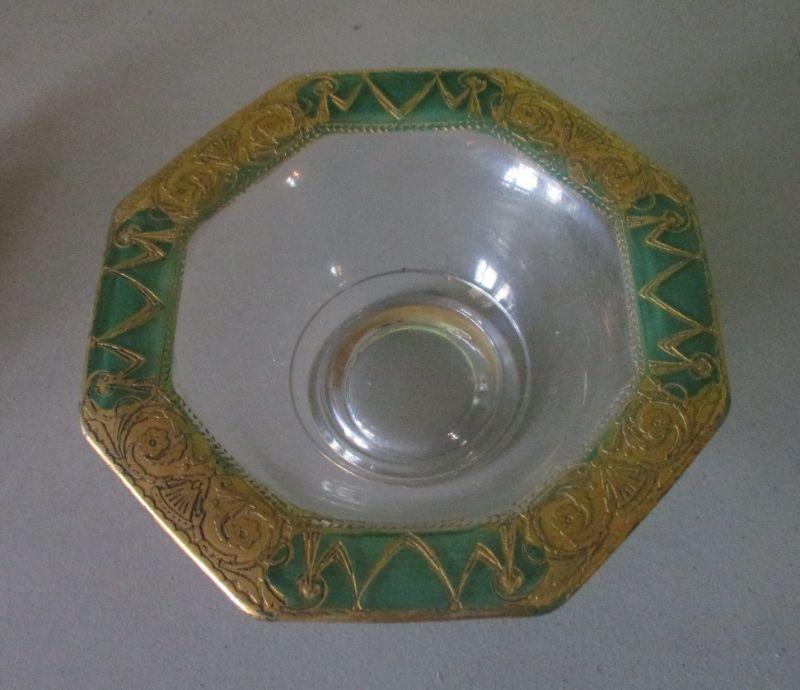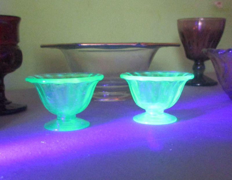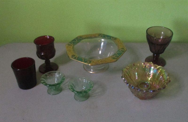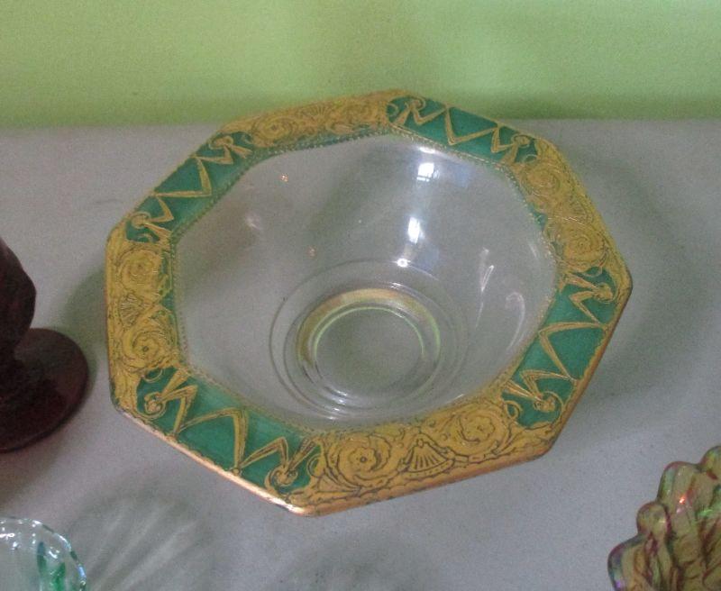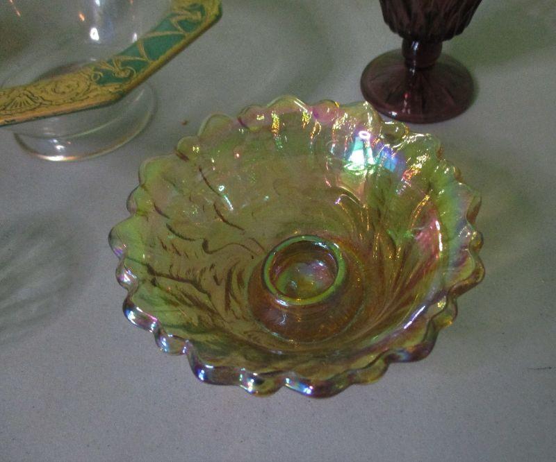 The mayo bowl (green and gold trim) is in excellent condition. The two salt cellars are uranium glass and one has a chip on the base. The carnival glass candlestick holder I believe is by Indiana Glass and the Wild Rose Pattern.