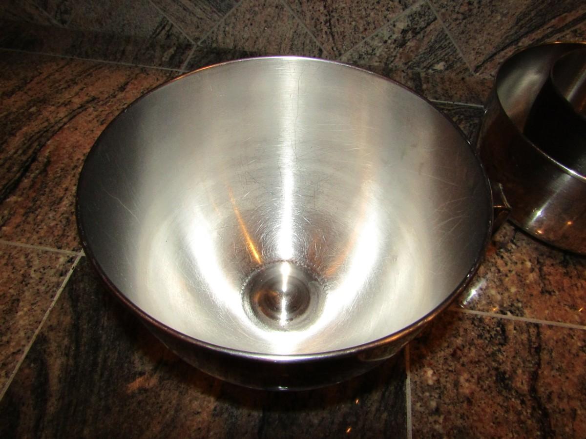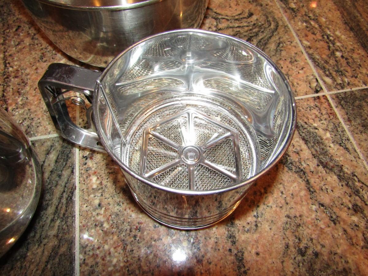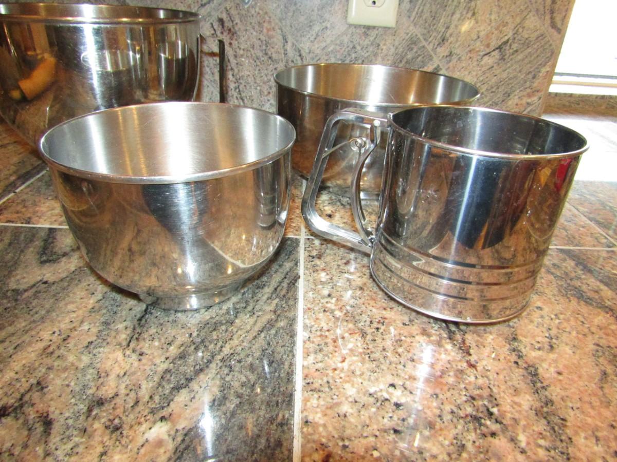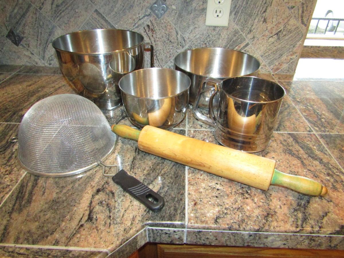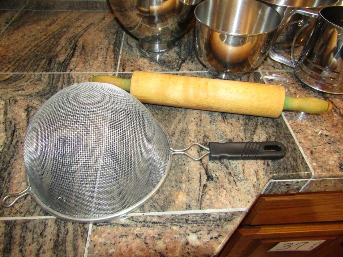 LOT 63 MIXING BOWLS, ROLLING PIN AND METAL STRAINER