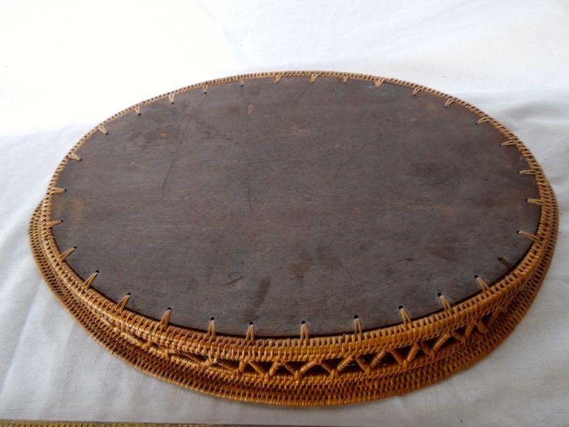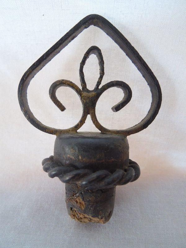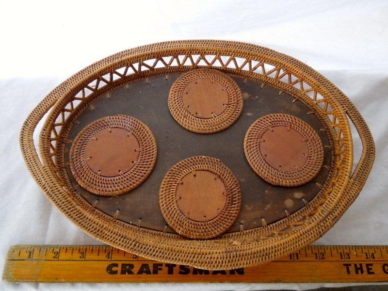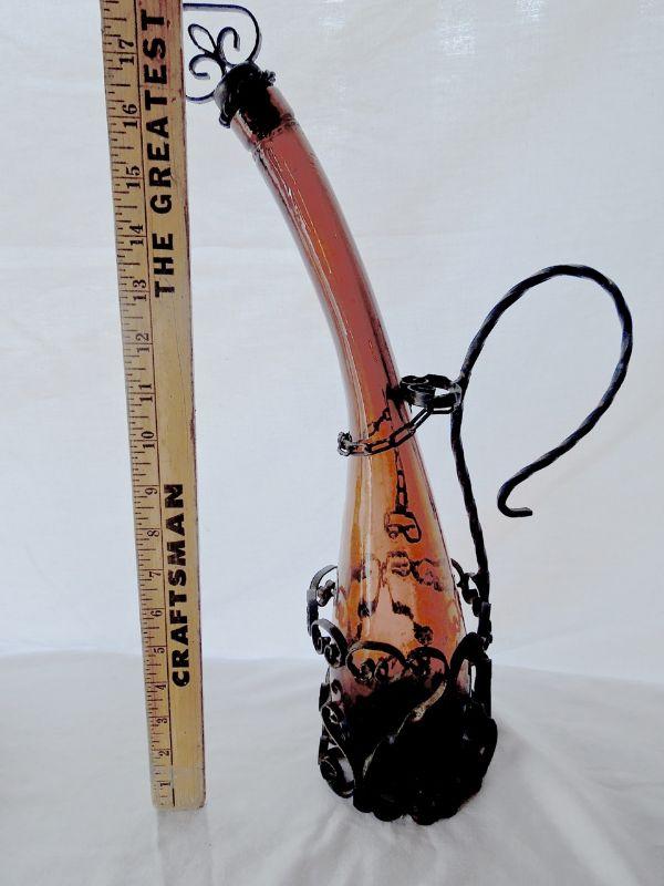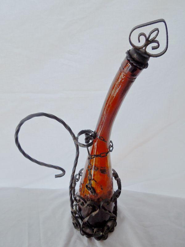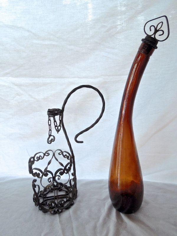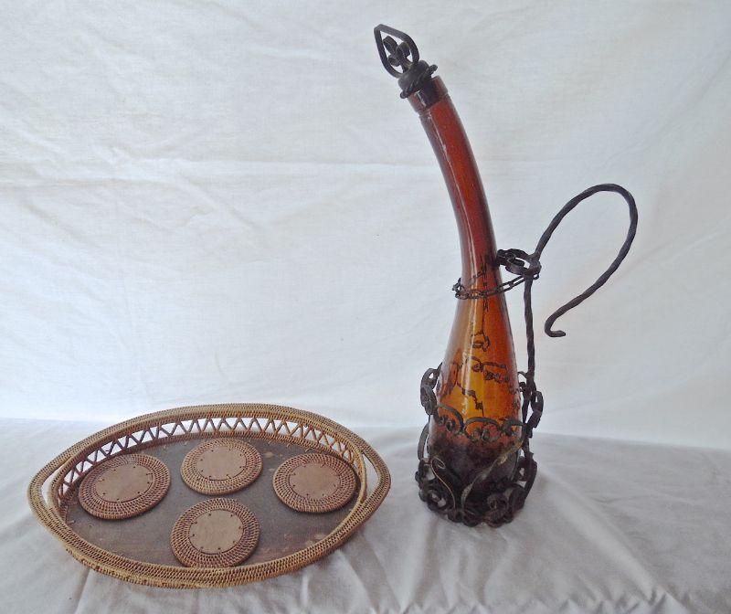 Unusual wrought iron holder with filigree work on it holds 18" amber glass decanter with finial cork stopper. Decanter is held into stand by a chain. Nice woven grass serving tray with wood bottom. Some small stains on bottom of tray. No other damage to either piece.