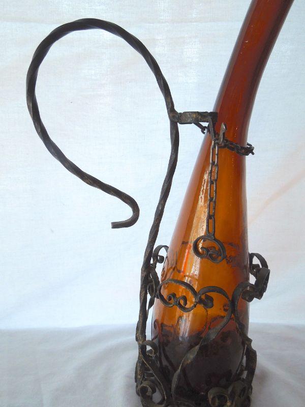 Lot 63: Moroccan Amber Glass Decanter with Iron Stand and Grass Serving Tray