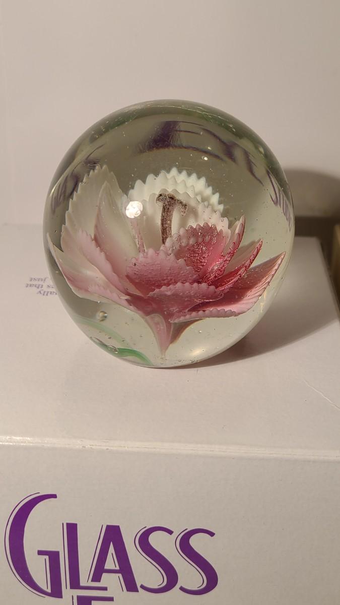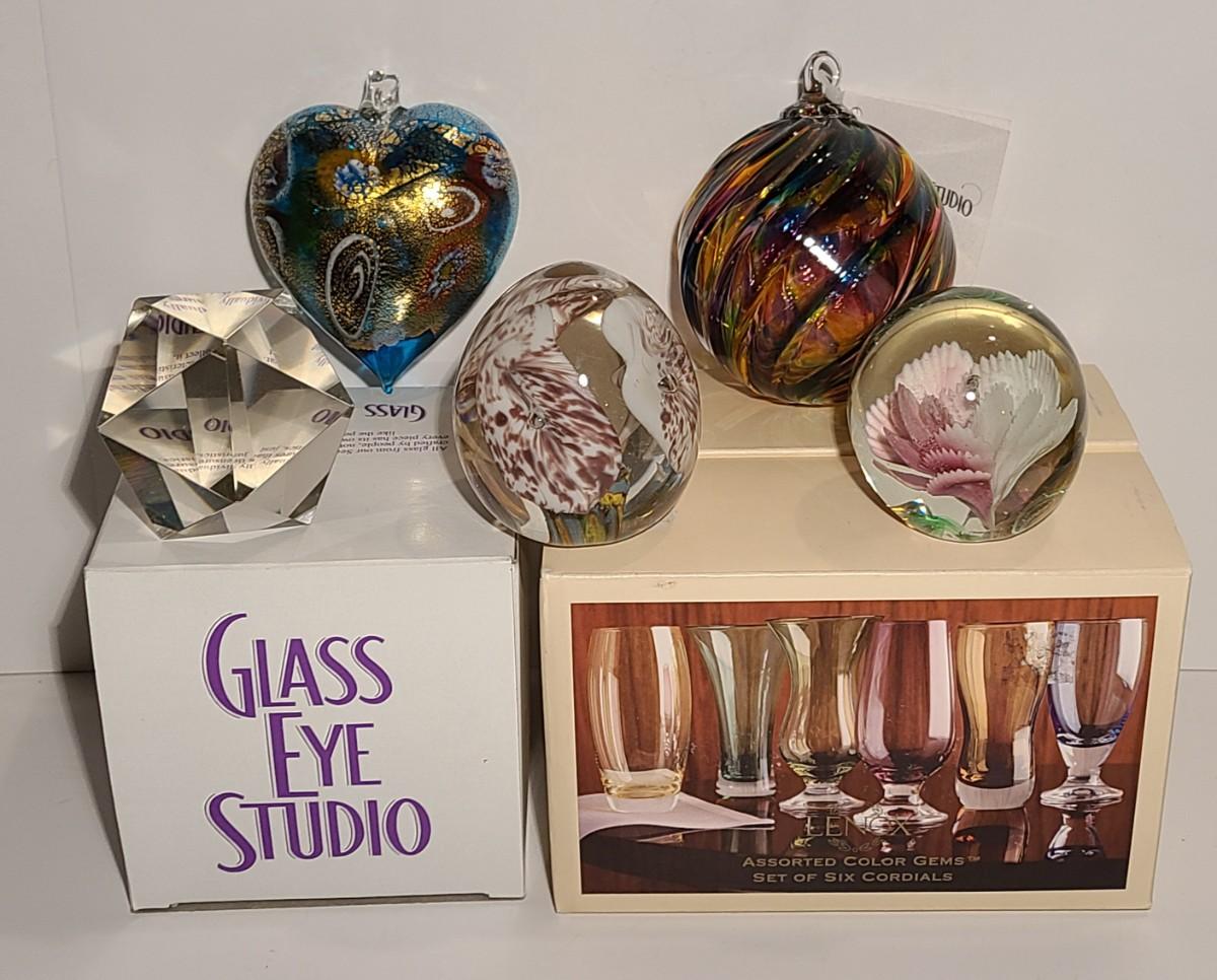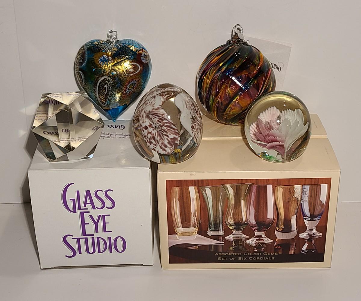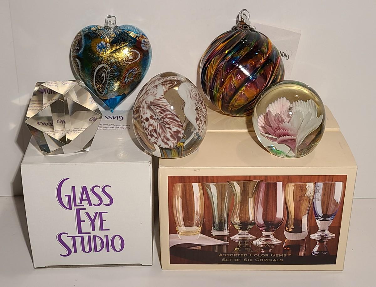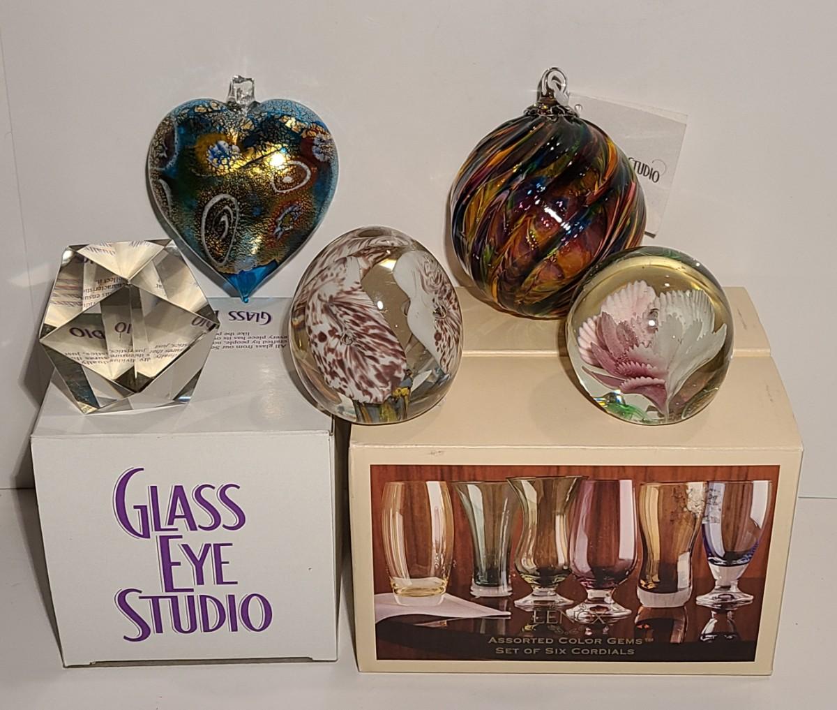 Murano Glass Heart Ornament or Suncatcher, Glass Eye Studio Hand Blown Ornament/Suncatcher, Two floral paperweights, and Lenox Color Gem Cordials. Please see all pictures for content of the lot, condition of the lot, and measurements if taken. Pictures are the best representation of the items listed and items are untested unless indicated in description. Thank you for looking and have fun bidding!