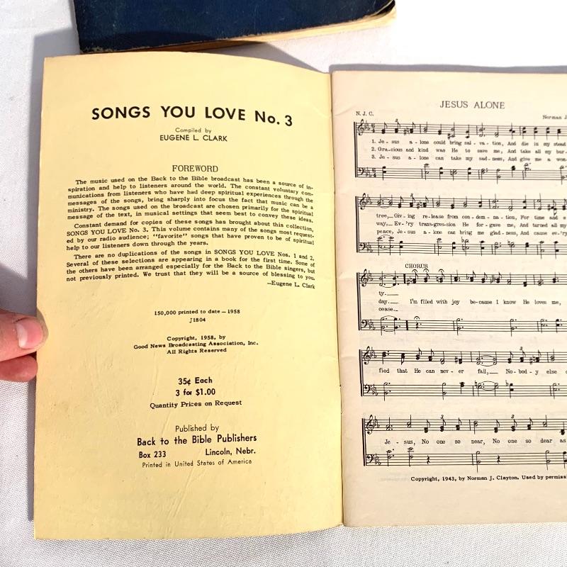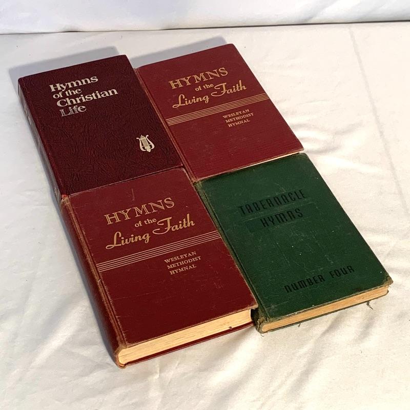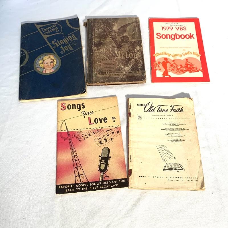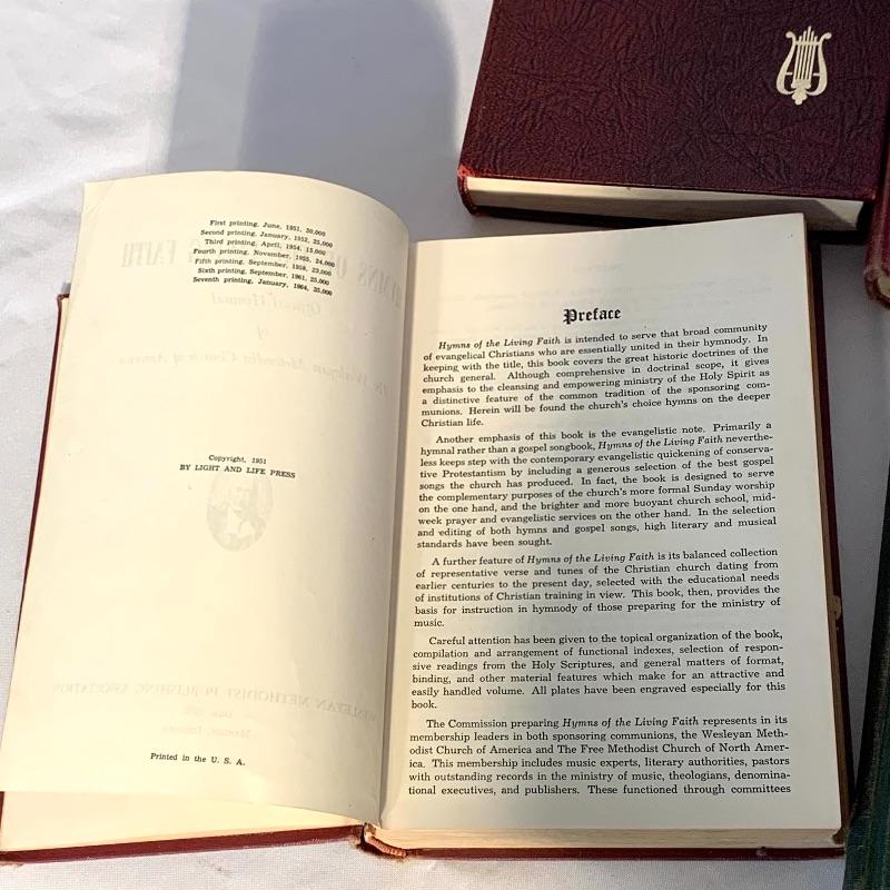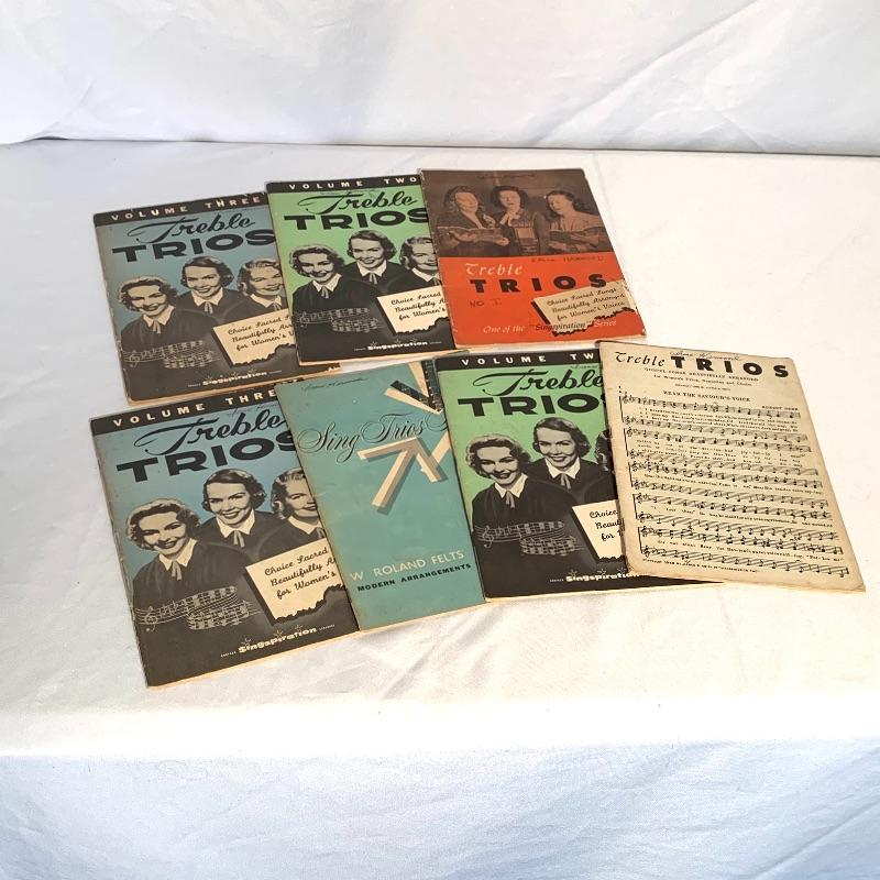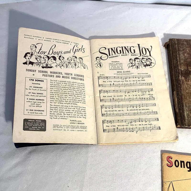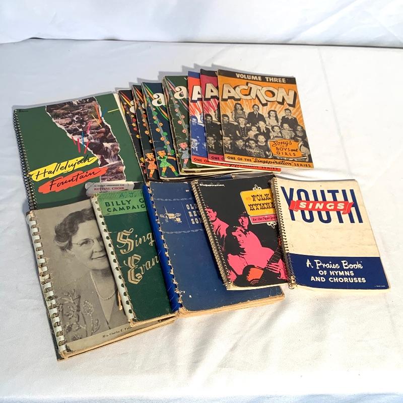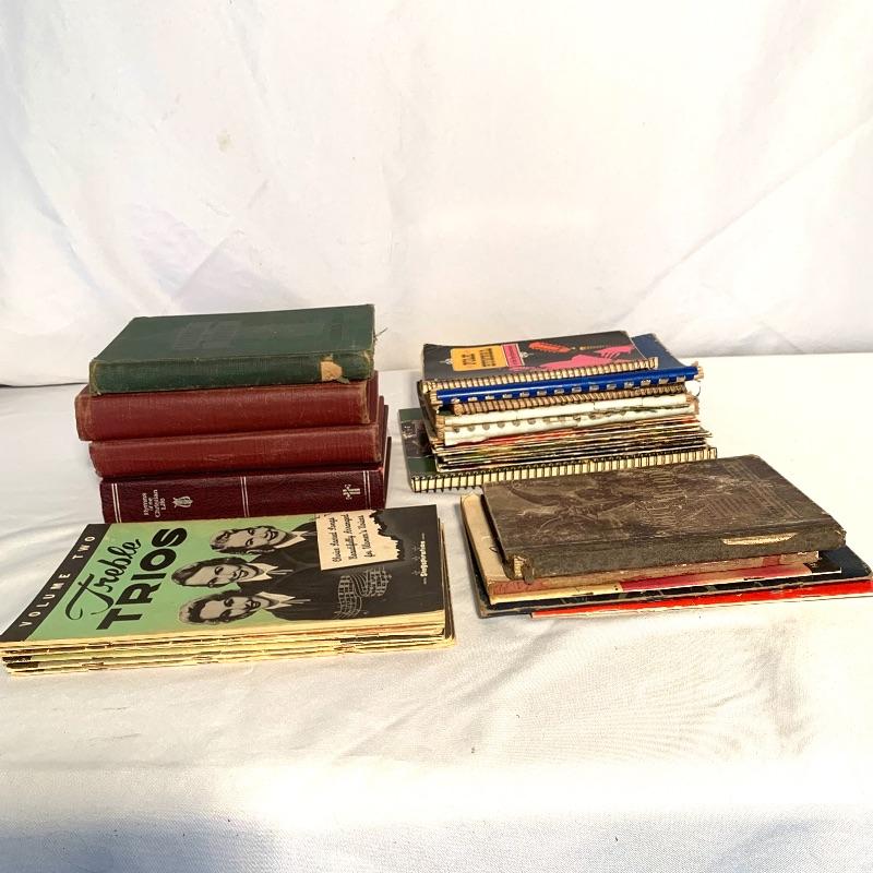 This lot includes a variety of musical books and hymnals. There are four hardcover hymnals, a few spiral-bound books, and some paperback songbooks. There are multiple volumes of “Action” and “Treble Trios” from the “Singspiration” series. Shipping available.