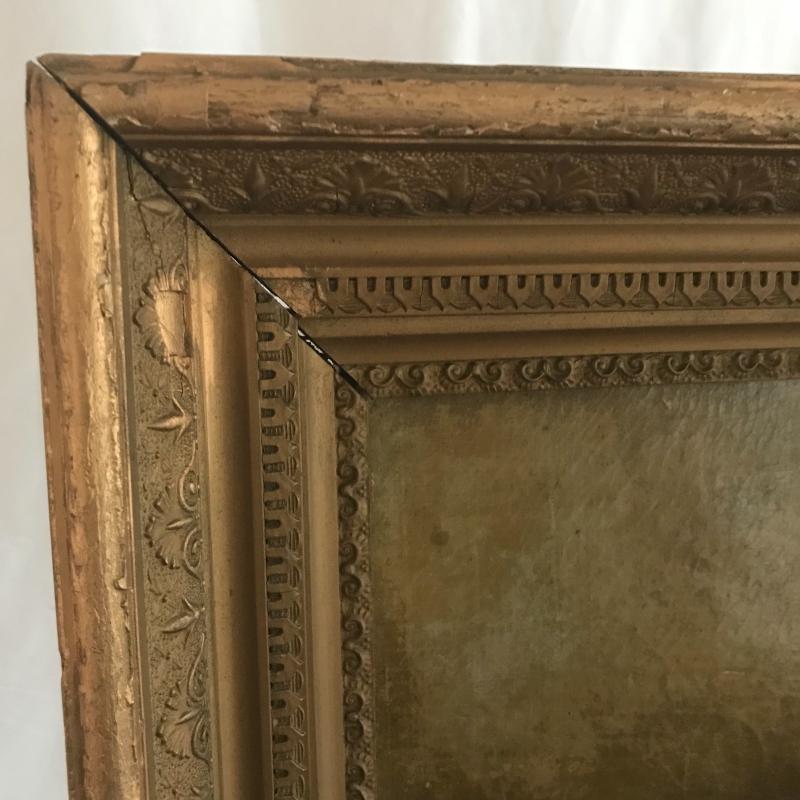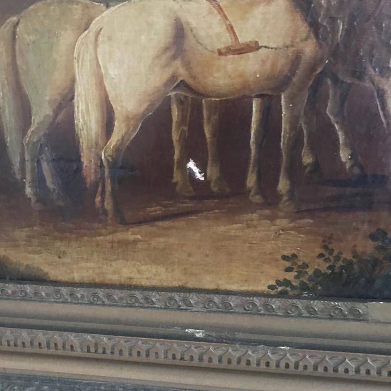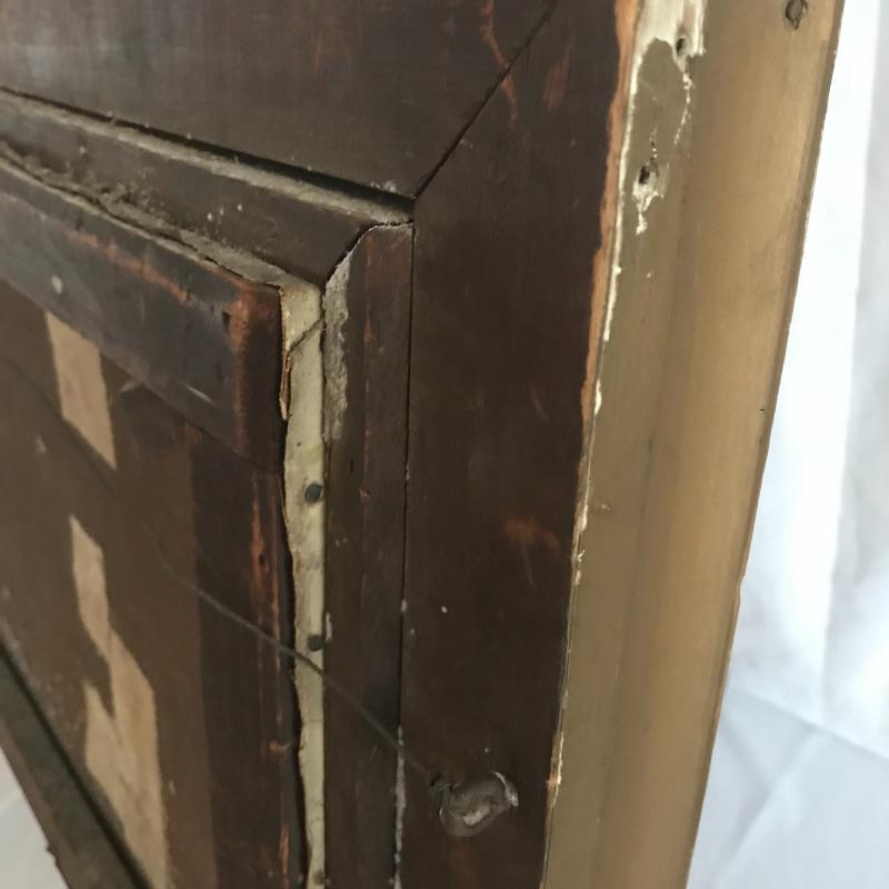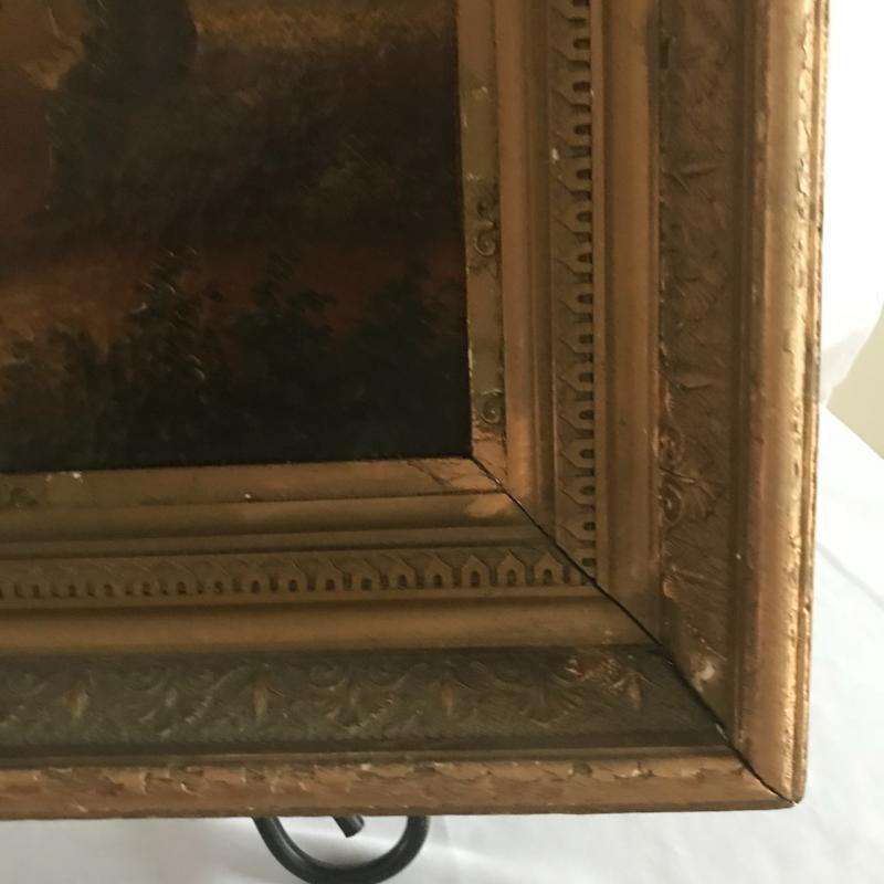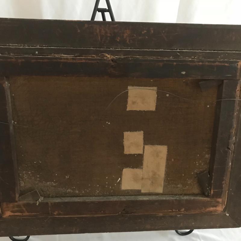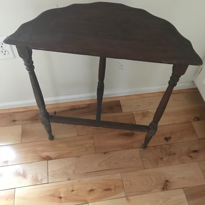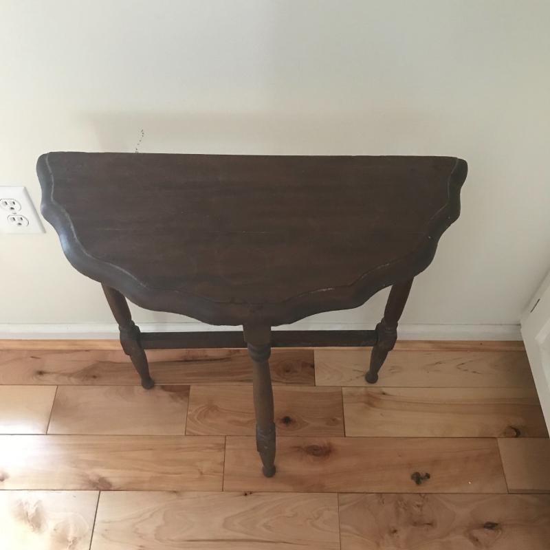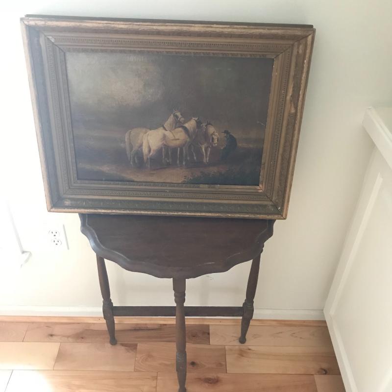 Small walnut colored ornate wall table, measures 22” x10” x25”. Oil painting Is likely old and has an ornate frame. Overall dark colors with repairs made and one small tear. See photos for details. No artist signature found. This lot is avaialable for local pick up in Asheville, NC only.