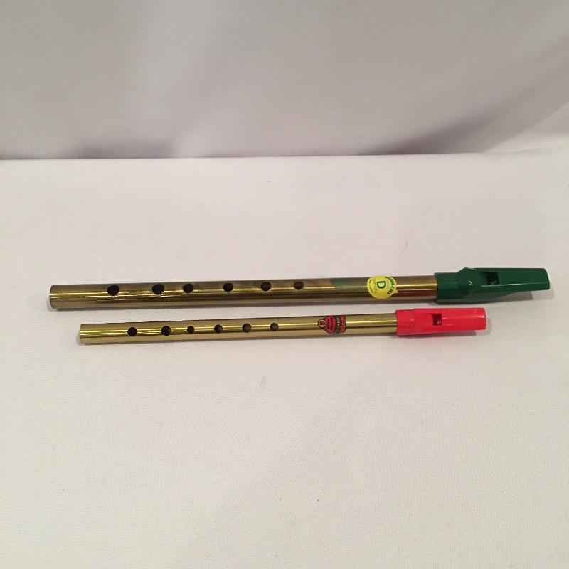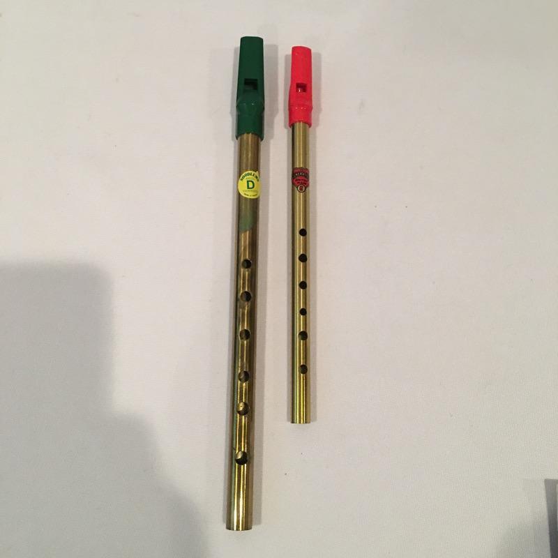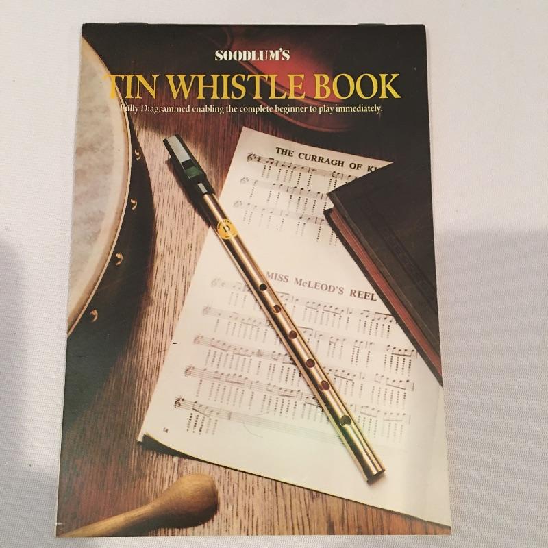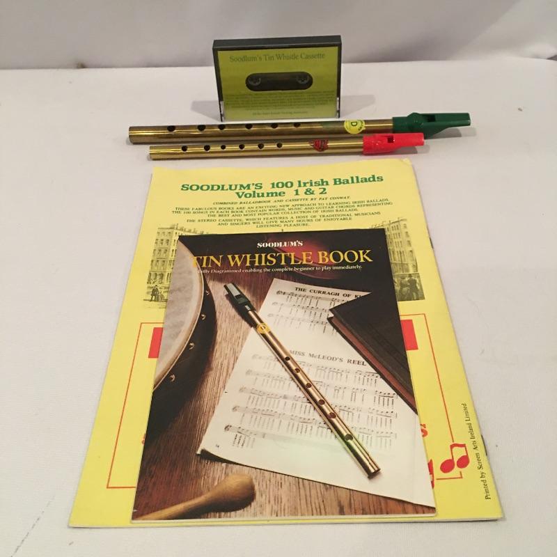 Pair of tin whistles with two books. Smaller one is British made by Generation and larger one is made in Ireland by Soodlums.