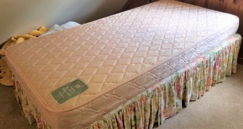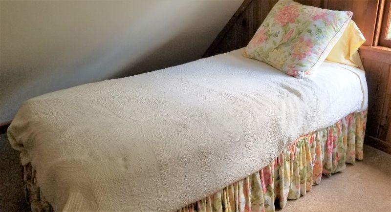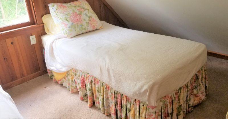 These two twin beds were in the guesthouse loft - you get both beds, mattresses, box springs, and all the matching bedding. Mattresses are older and well used. I would suggest putting these in a kid's room. Beds are 73" long, 38" wide and 21" tall. Price is for both beds.