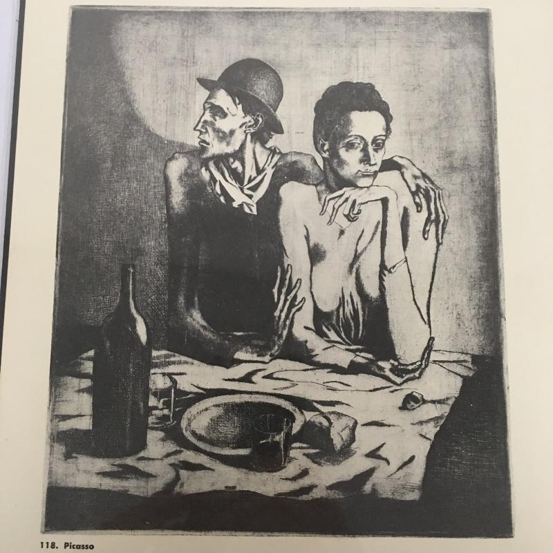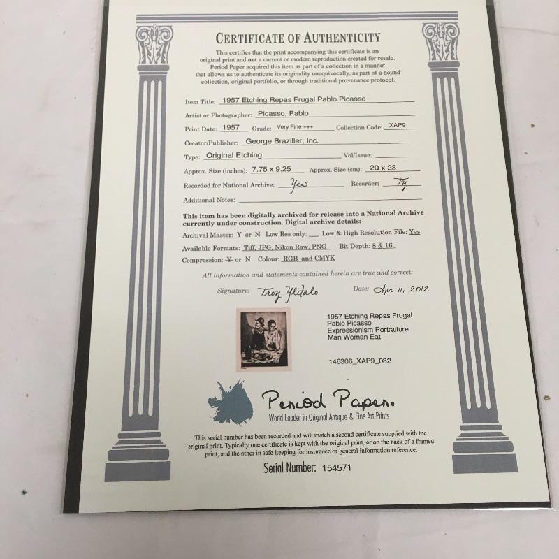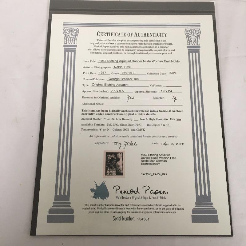 This pair of Period Paper prints includes a Picasso print titled “ Man Woman Eat” and a Nolde print with a dancer nude woman and German man. Both prints come with COA. Unframed.