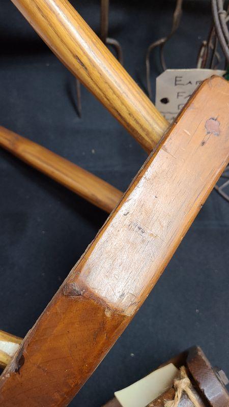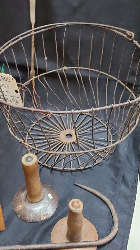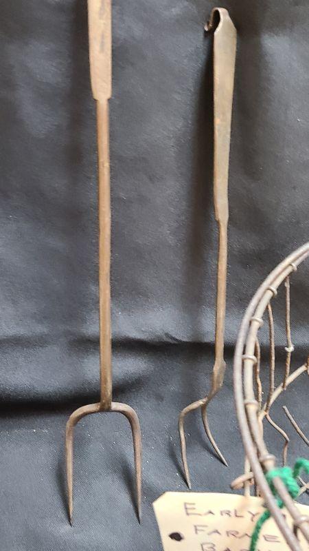 Vintage Farm items. Metal egg basket as is, primitive farm stool, Hooks, forks etc. Please see all pictures for condition of the items listed and what is included in the lot. Pictures will also show any measurements if taken and is the best representation of the items. Thank you for looking and have fun bidding! We appreciate Treasure Hunters!