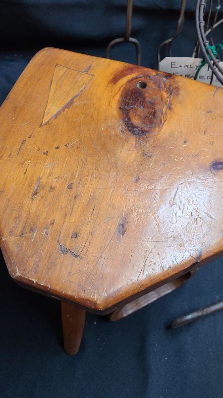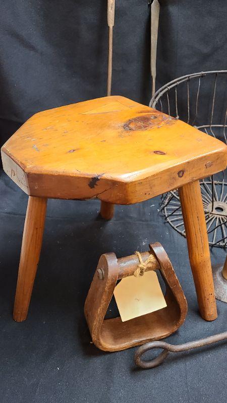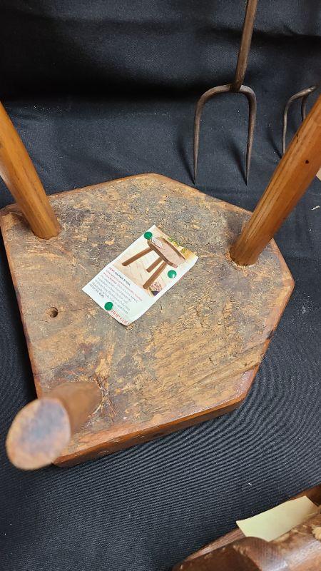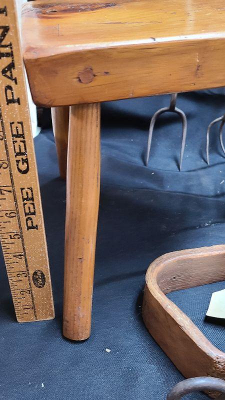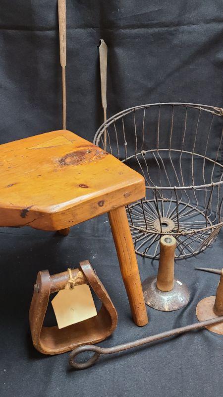 Lot 63: Primitive Milking Stool/ Egg Basket and More