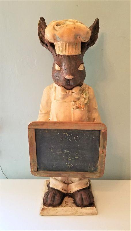 Contemporary kitchen decor - Standing Rabbit dressed as a chef holding a chalk board menu placard. Marked "Fleur di Lis 1998". Stands 25" tall. Used condition.