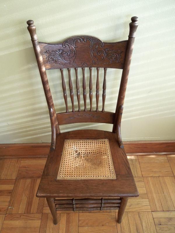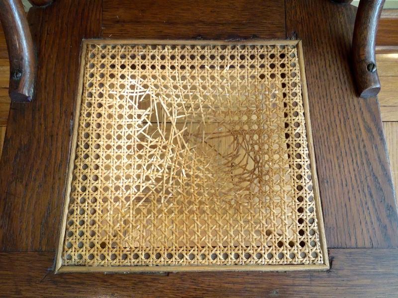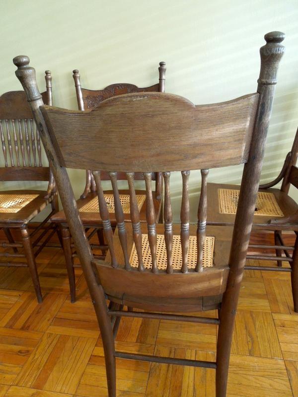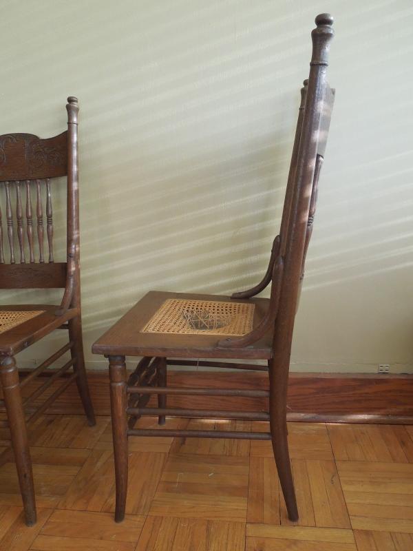 All caning on seats needs replacing. One seat is intact. Structurally chairs are in very good condition with no loose slats or legs. Some wear to varnish. Chairs measure 18" W x 19" L x 40" H.