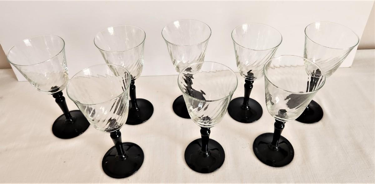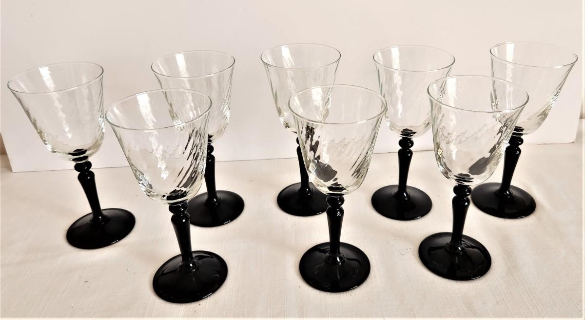 Set of 8 Wine Glasses with black base - these match the set in Lot #51 - each stands 6.5" tall. All in good condition. These would go well with the MIKASA china set offered earlier in the sale.