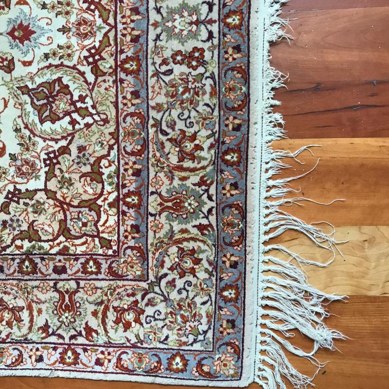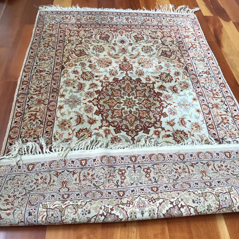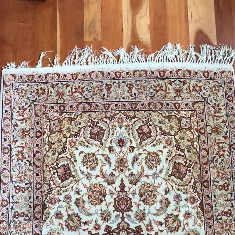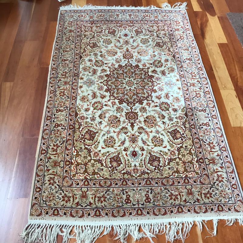 Stunning area rug with reds, oranges and greens over ivory. Rug is thin and measures 70” x 43” before tassels. Tassels and ends are worn, see photos. This rug’s ornate pattern and coloring hides any present staining. No shipping.
