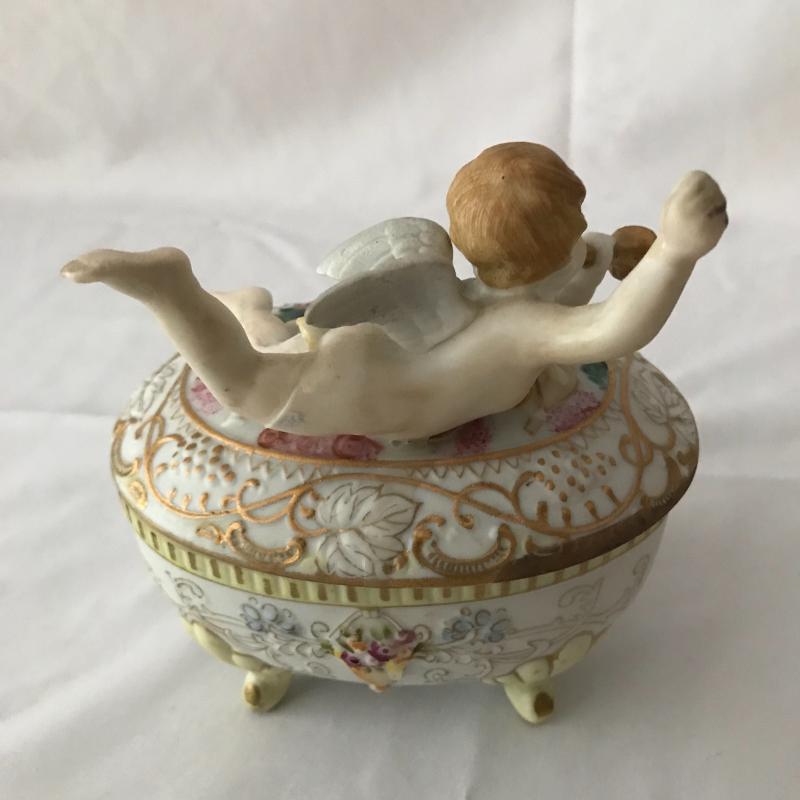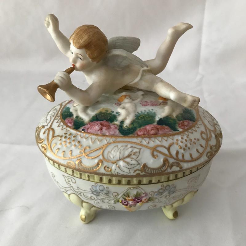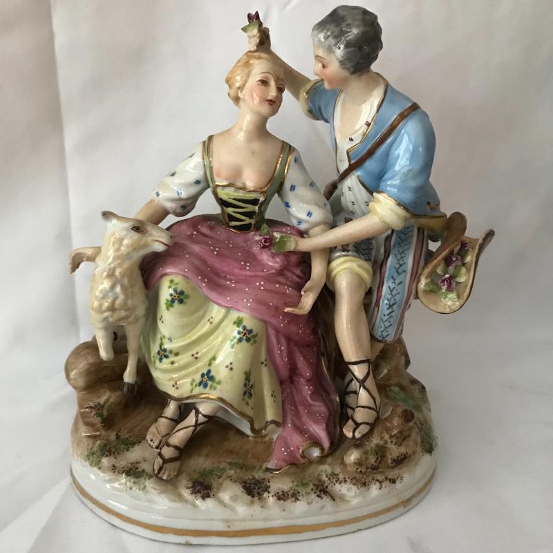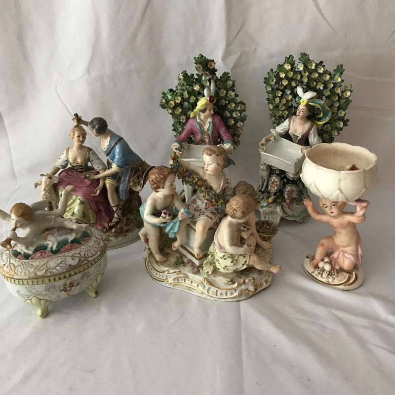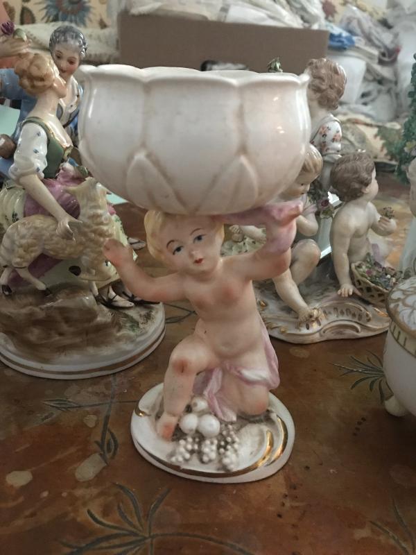 Six large figurines or small statues. The tallest two are matching and approx. 10” tall. Markings on back of these two resemble an anchor. Angel figurine with wings is a candy dish. Markings read “UCAGCO China Made in occupied Japan”. Statues of man with woman and four kids have similar markings. See pics. Shipping available or local pickup in Asheville, NC.
