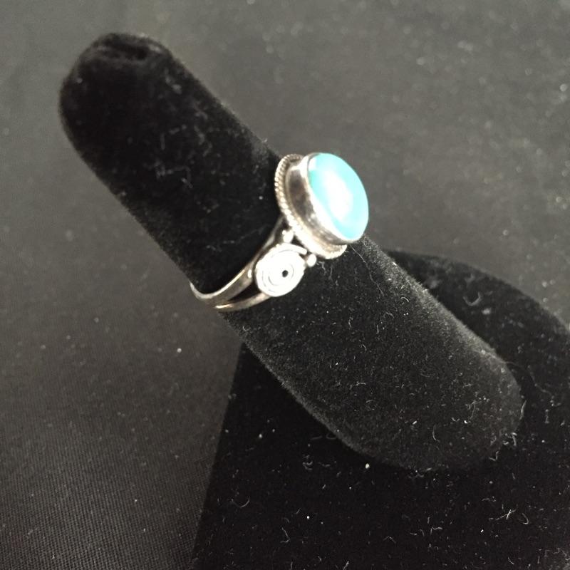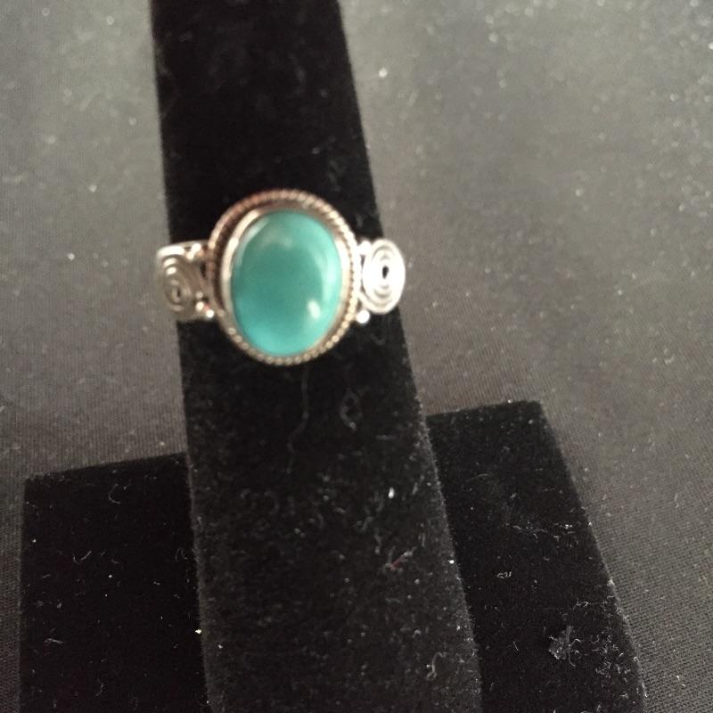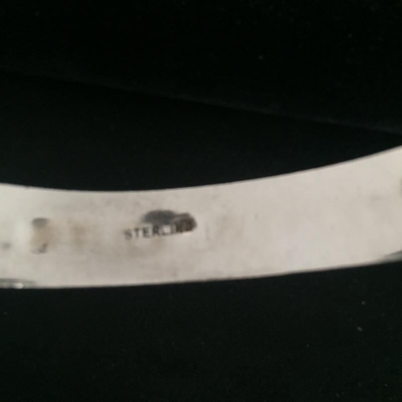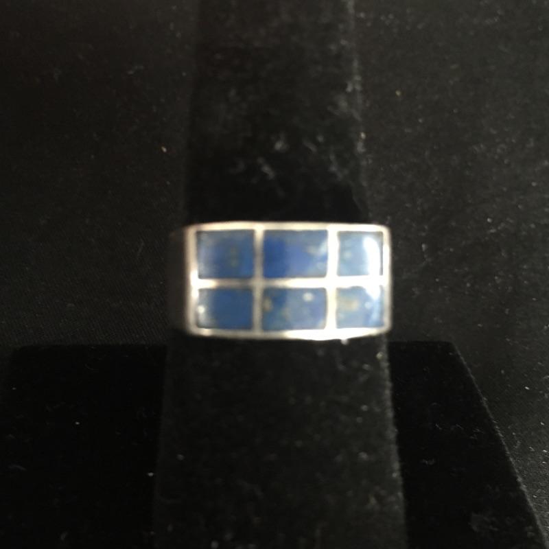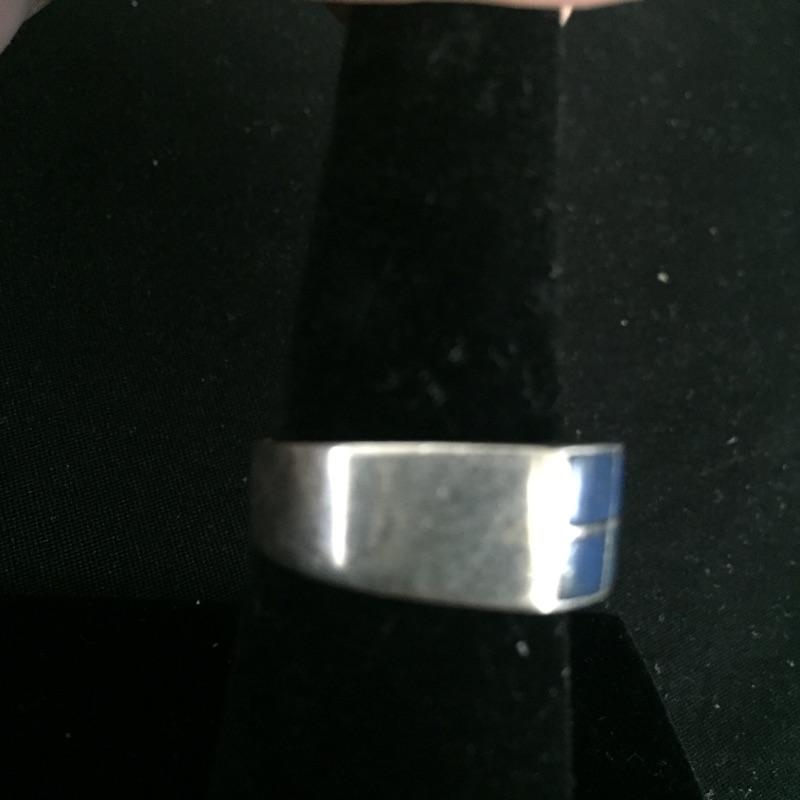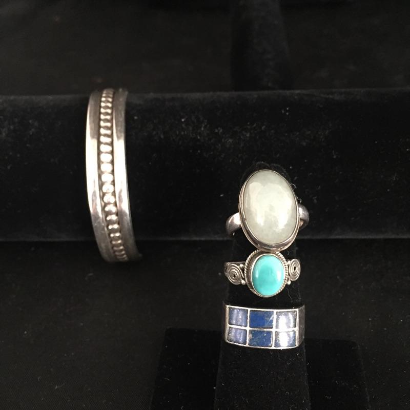 Trio of rings and bracelet. Ring with oval stone is size 6.75 and has markings. Ring with blue stone is size 5.5 and marked 925. Ring with square stone design is size 8.5 and marked 925. Bracelet is marked sterling. Treat yourself to some lovely Rings and bracelet.