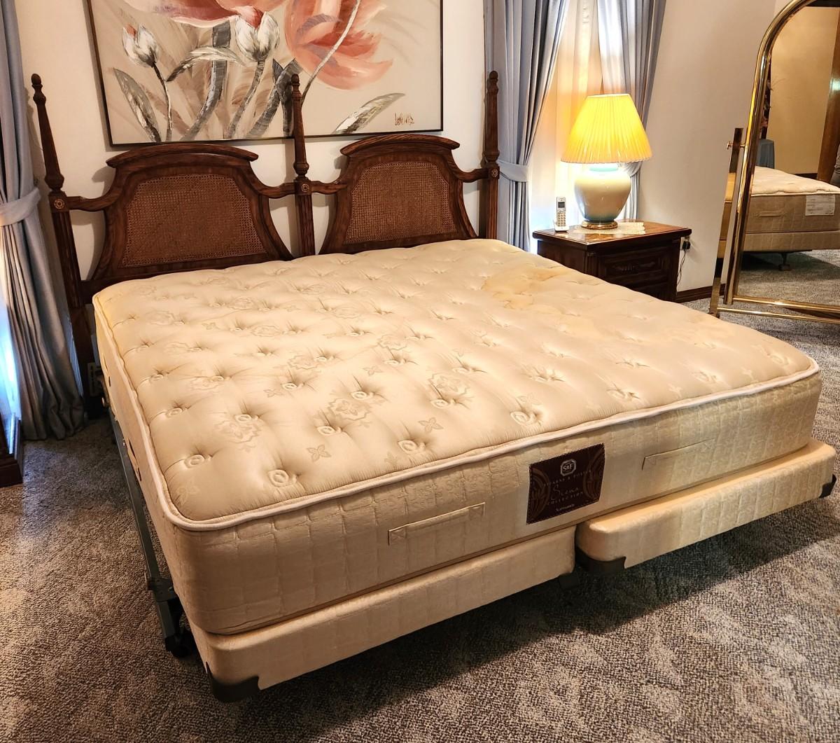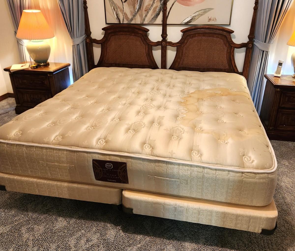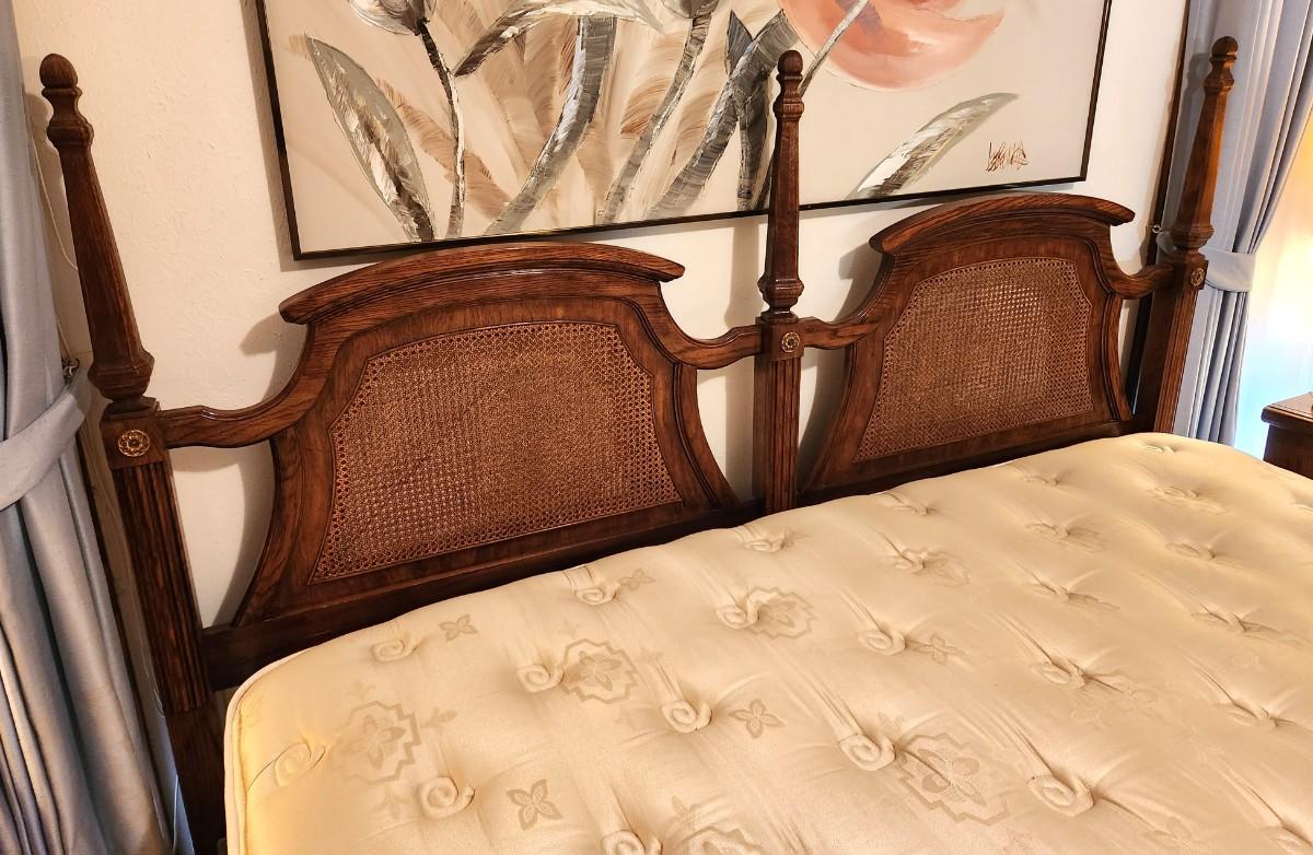 Nice attractive Caned headboard (good condition) - Stearns & Foster king mattress/box springs. Some stainage to mattress. Headboard 55" tall, 81" across. You can take headboard and frame and leave the rest behind if you wish.