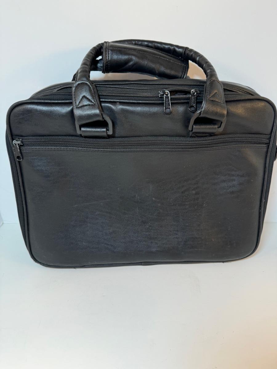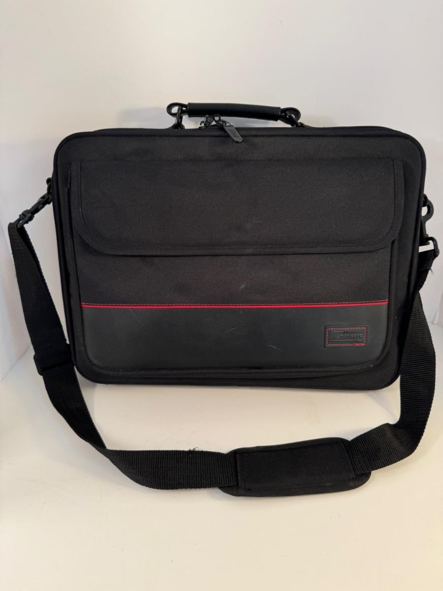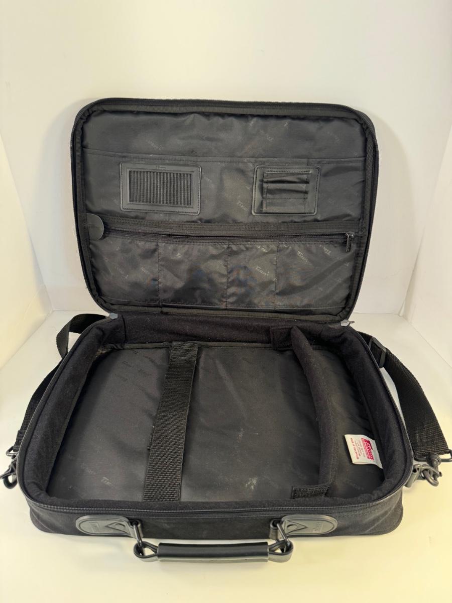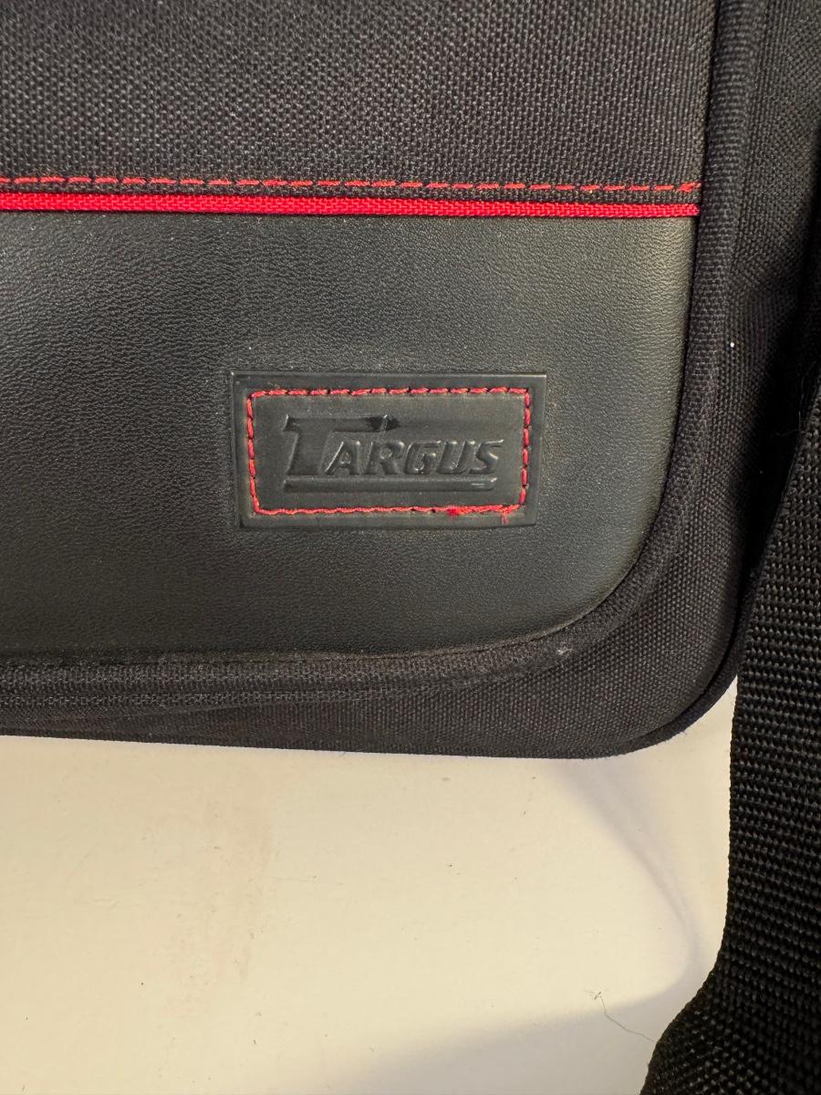 Targus laptop bag with front flap velcro pocket and a back pocket.