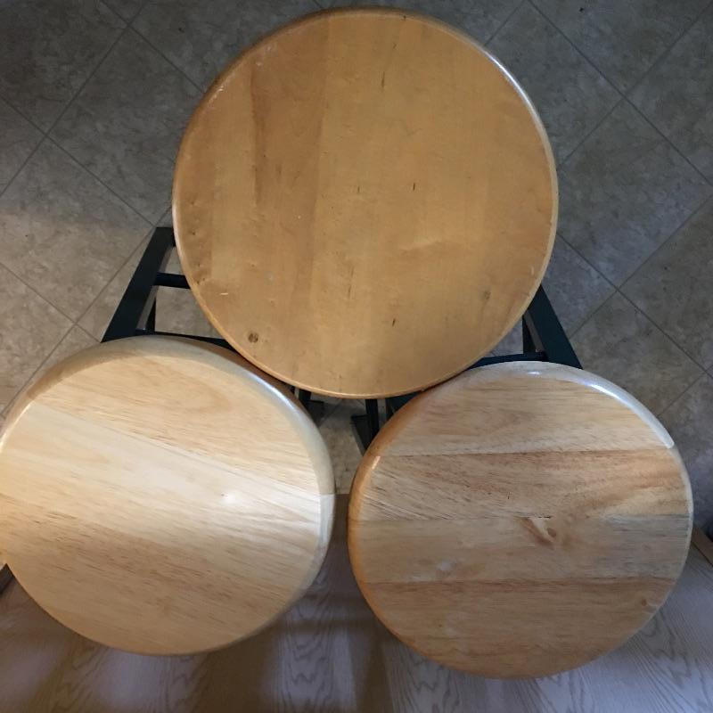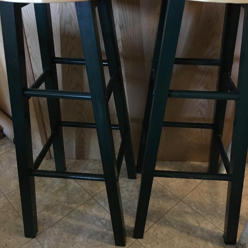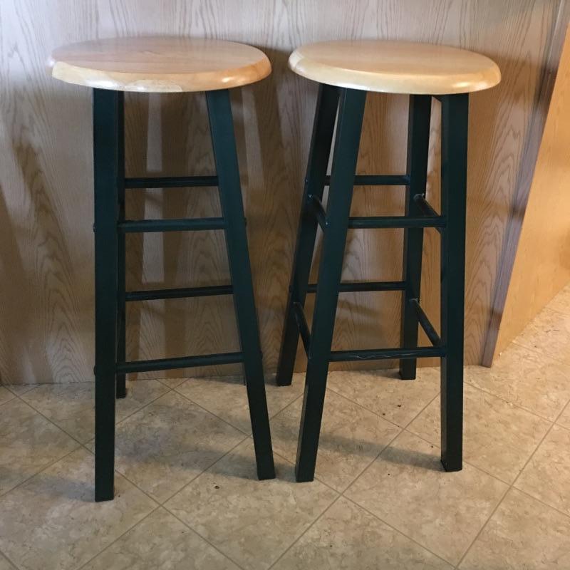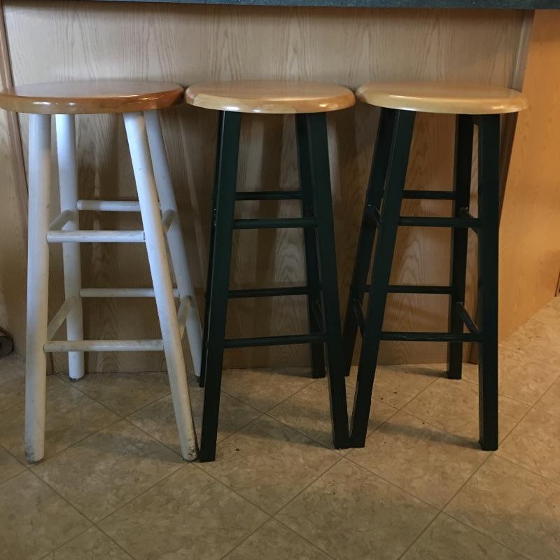 Three barstools. Lot includes two matching green metal based barstools and one white wooden based barstool all three have wooden tops. Barstools measure 29.5” tall.