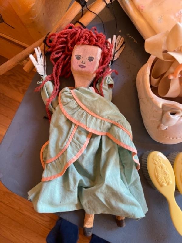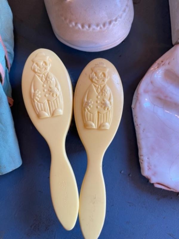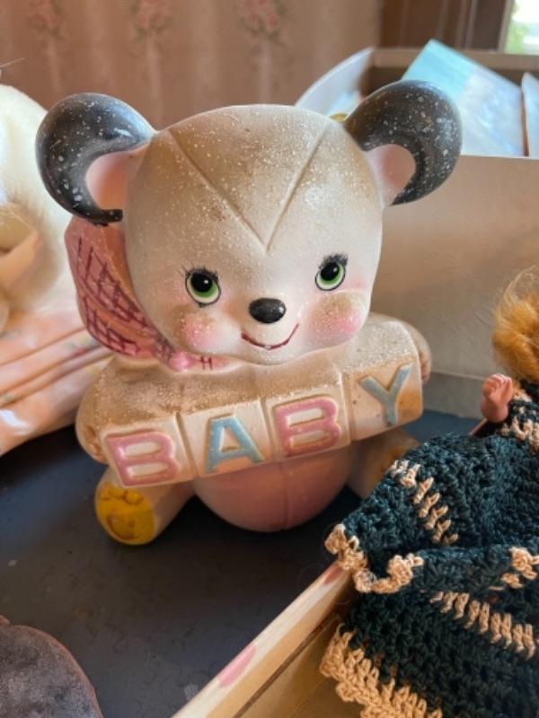 Lot 63. Vintage baby accessories; brushes, handprints in lay; 5 Storybook dolls and dresses; puppet, blanket, vases, vintage greeting cards (large assortment)--$50