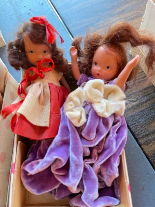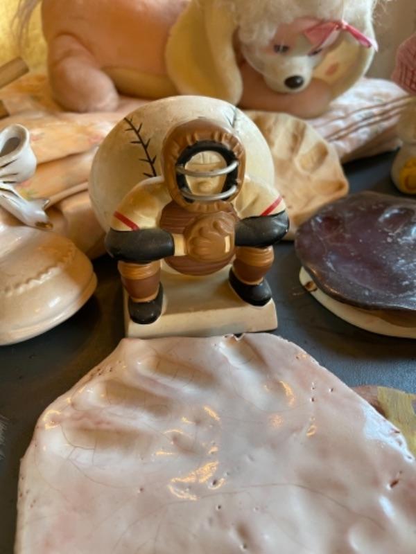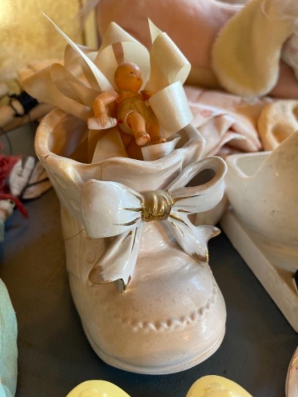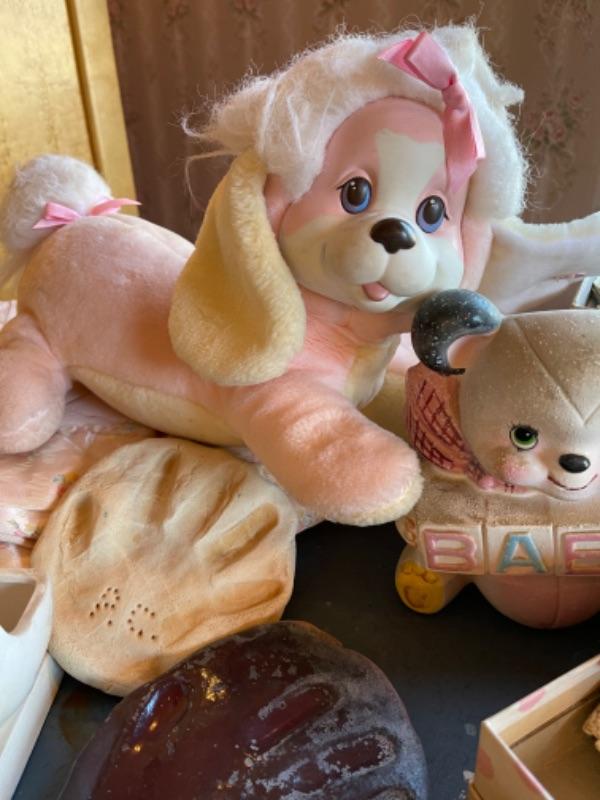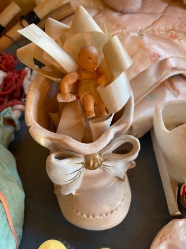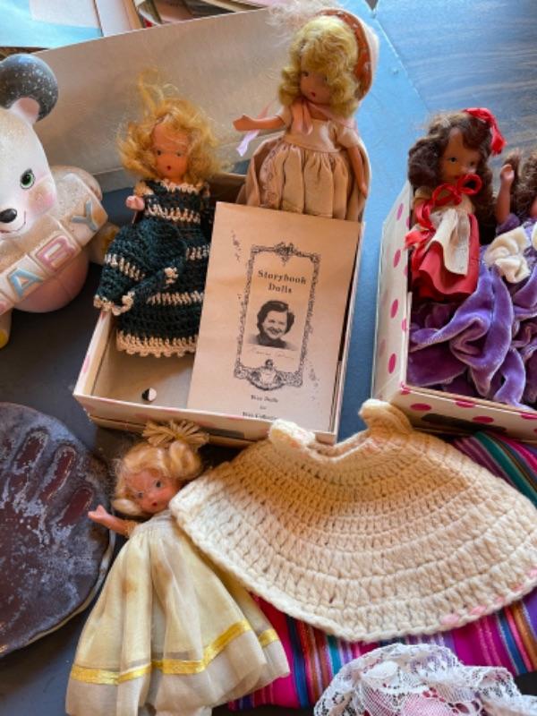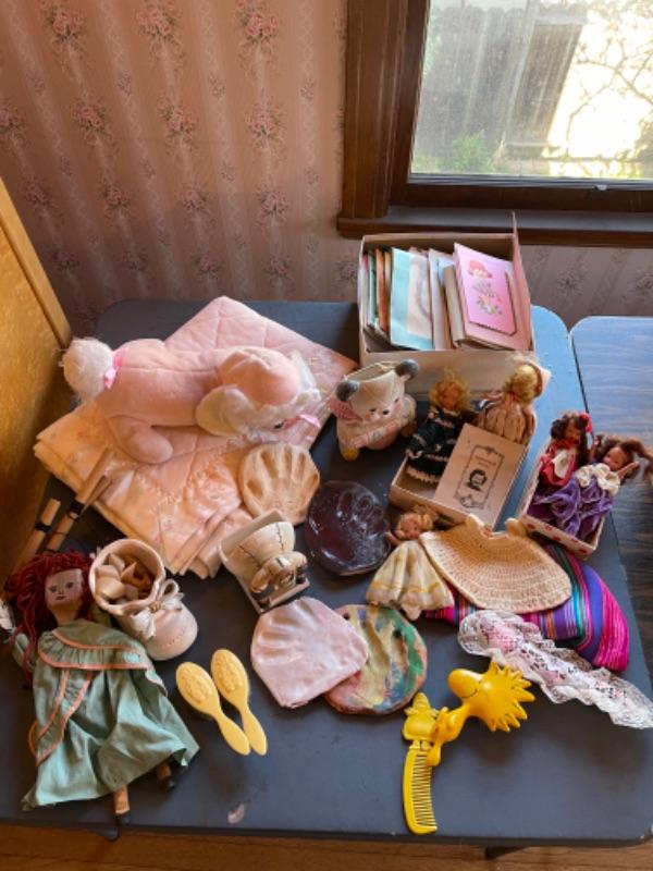Lot 63. Vintage baby accessories; brushes, handprints in lay; 5 Storybook dolls and dresses; puppet, blanket, vases, vintage greeting cards (large assortment)--$20