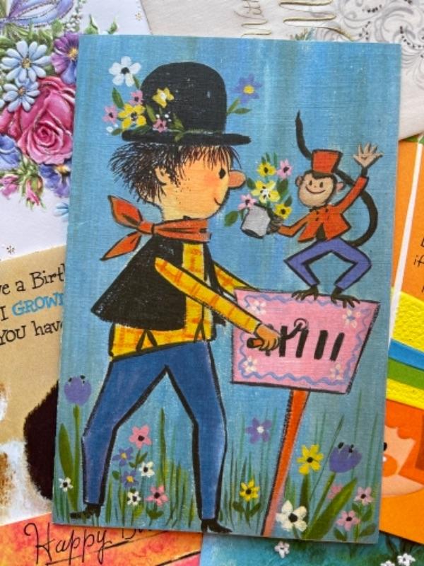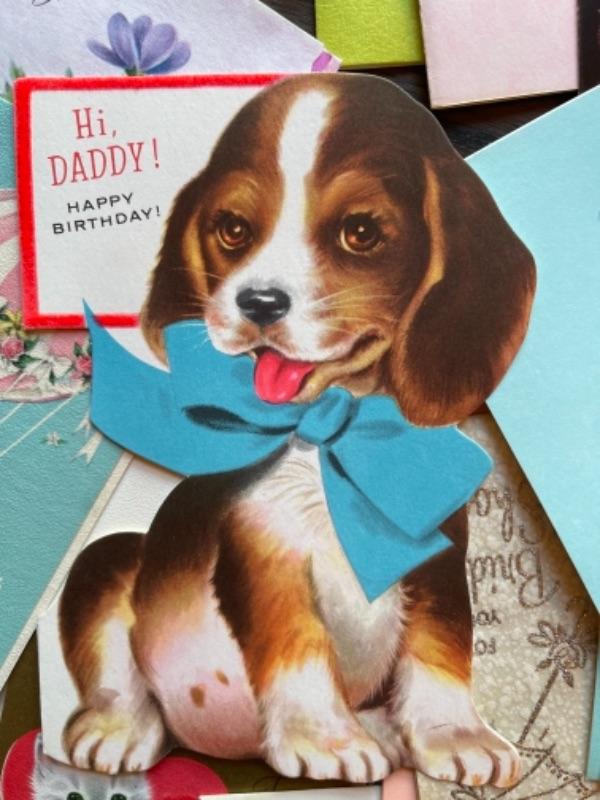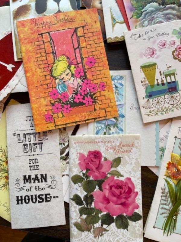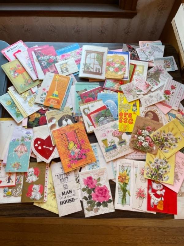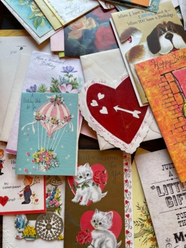 Lot 63. Vintage baby accessories; brushes, handprints in lay; 5 Storybook dolls and dresses; puppet, blanket, vases, vintage greeting cards (large assortment)-- Was $50 - - Now $20