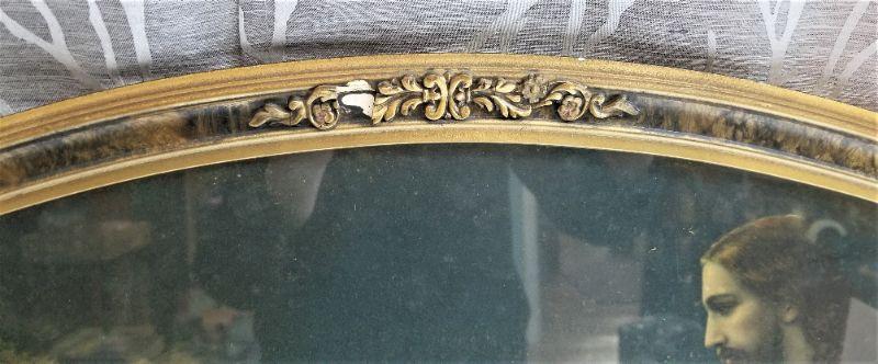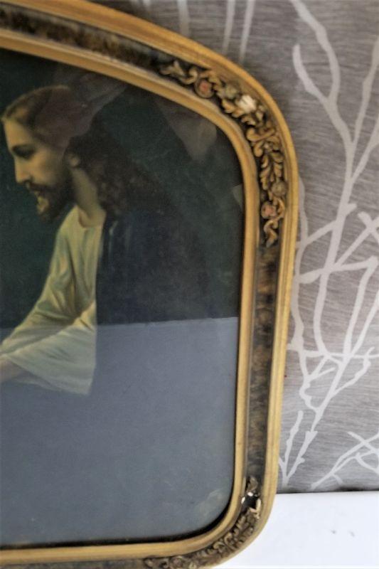 Classic Jesus in the Garden print in vintage frame. Some damage to frame, as shown. Print is fine. Measures 22" across, 18" tall at tallest point.