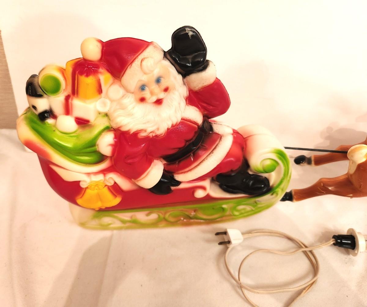 This is an attic find and how it survived up there I have no idea. Vintage Empire plastic (1970) Santa and 2 Reindeer Blow Mold with cord/light. Great shape. 23" long.