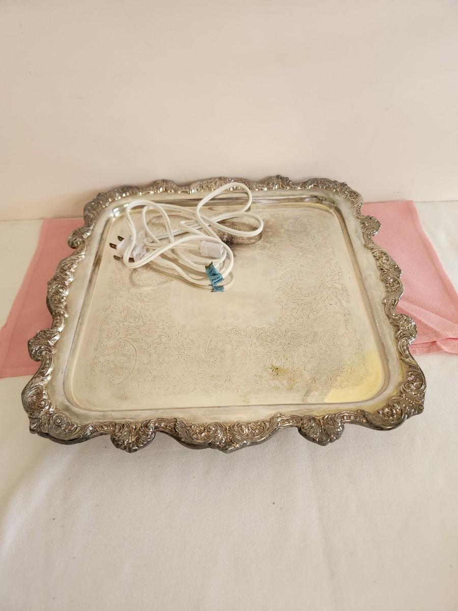 I've been doing sales for a long time but I've never seen one of these - heavy silverplate serving tray with built in heating element/cord for use as a warmer. 14" x 14". Could use a light polish on the front.