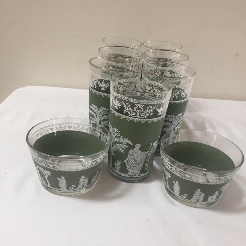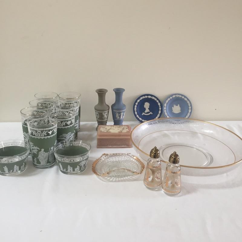 Wedgewood cameo , Incolay stone box , salt and pepper shakers, bowl , glasses and more. Bowl measures 12”D. See photos.