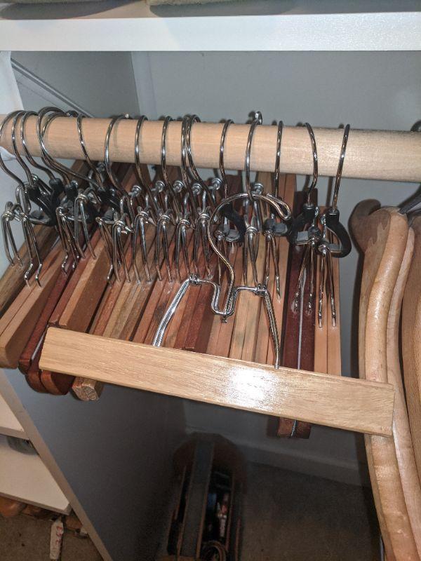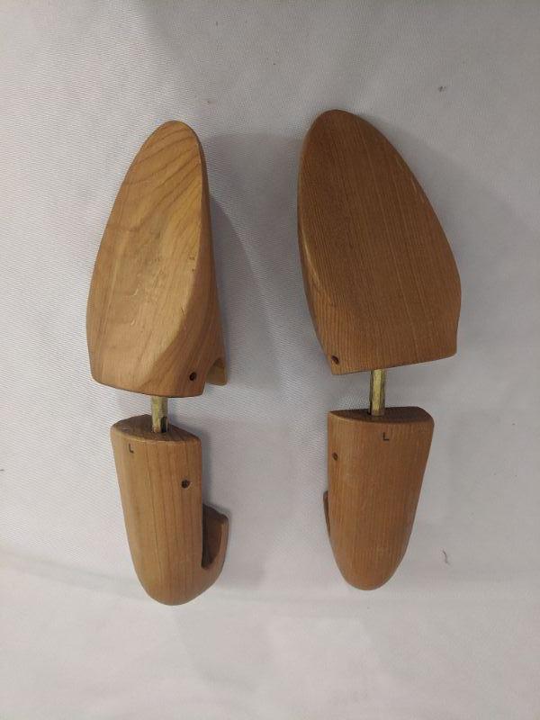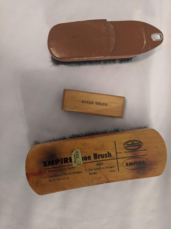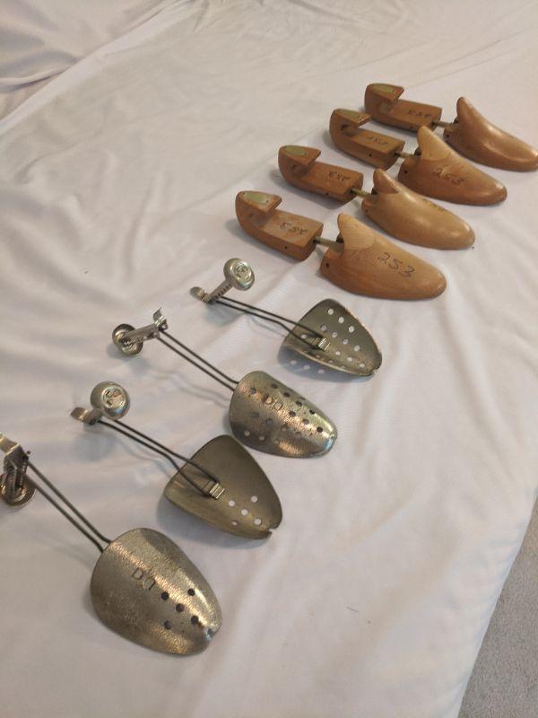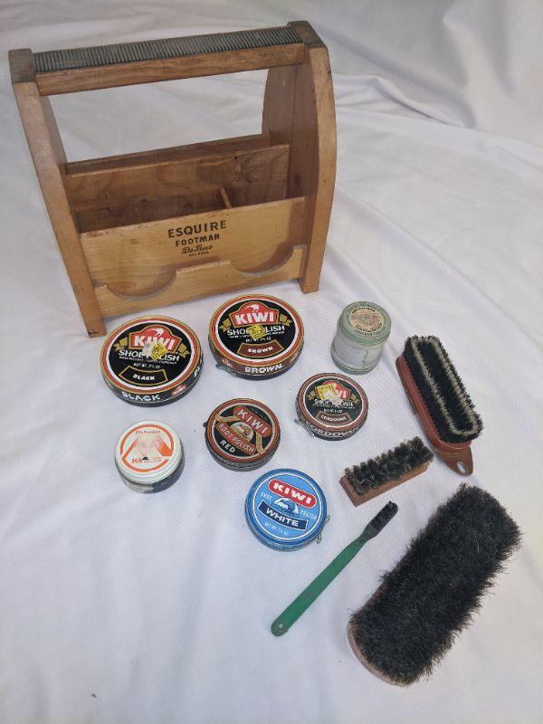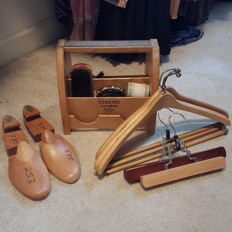 We have paired two kinds of hangers here that are both made out of wood and there are plenty of each! There are also two different kinds of shoe horns, both wood and metal, see images. This lot also includes a vintage shoe polish kit from Esquire Footwear that includes a handy wood carrying case, numerous brushes and polish.