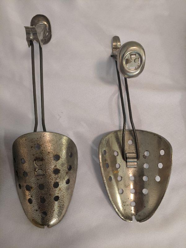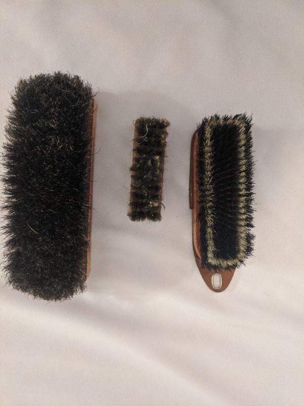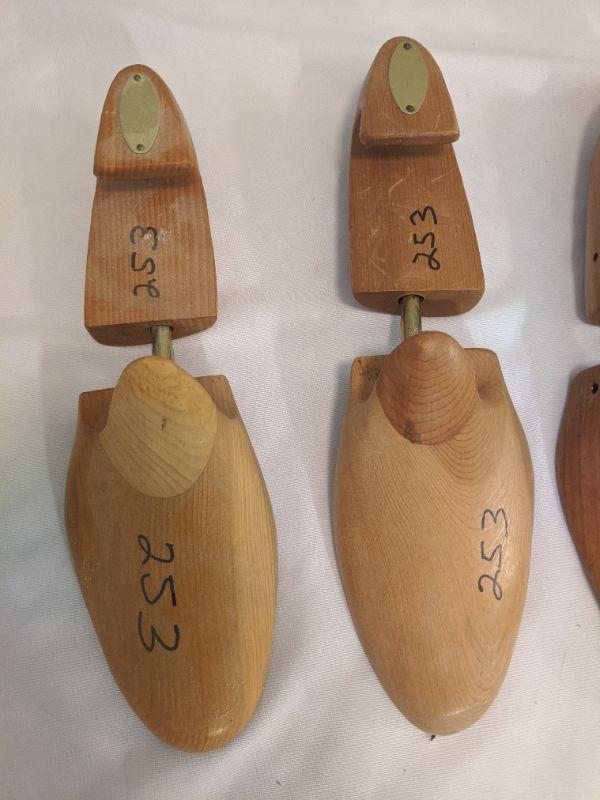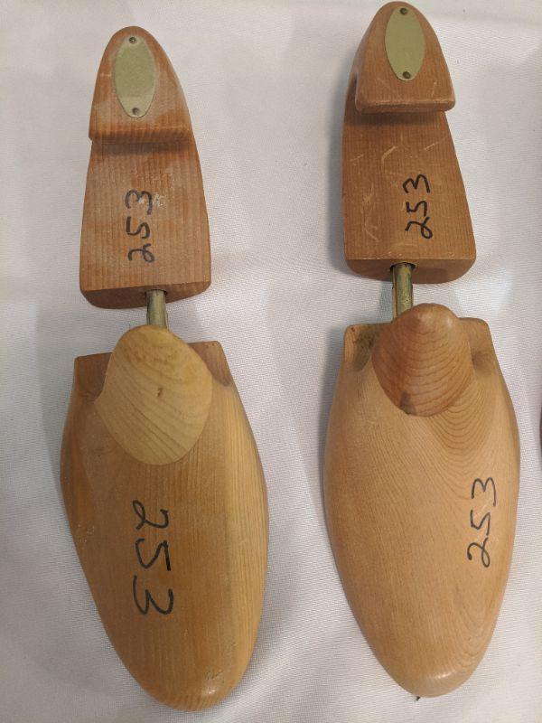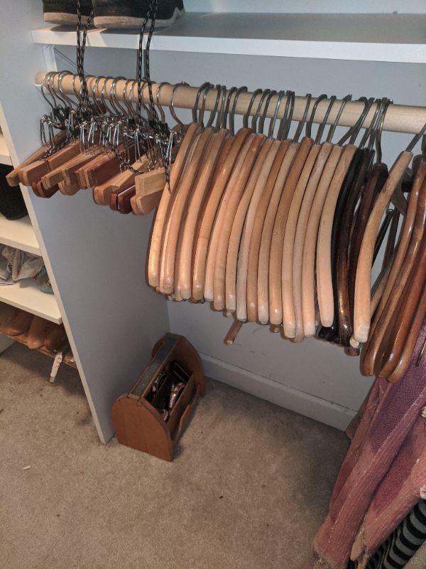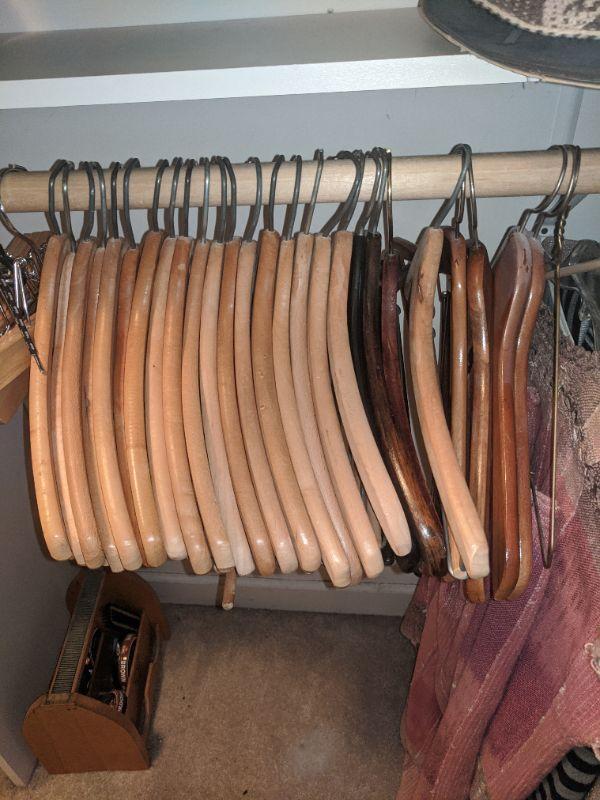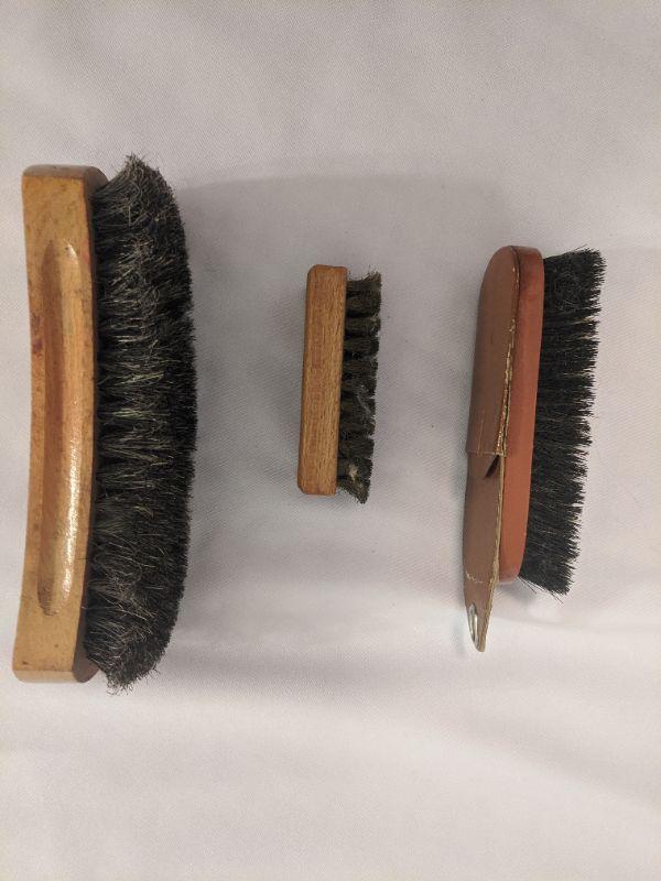 We have paired two kinds of hangers here that are both made out of wood and there are plenty of each! There are also two different kinds of shoe horns, both wood and metal, see images. This lot also includes a vintage shoe polish kit from Esquire Footwear that includes a handy wood carrying case, numerous brushes and polish.