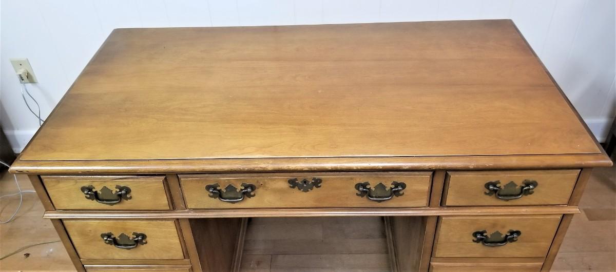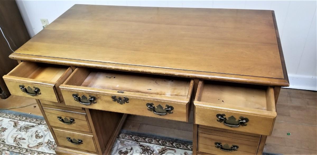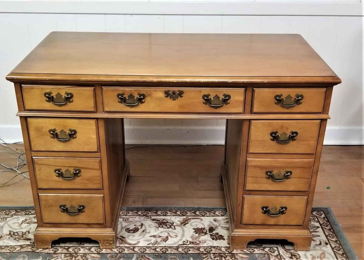 Solid wooden kneehole desk - oak finish - finished all the way around. 8 drawers (one is a double drawer). 44.5" across, 23.5" deep, and 29.5" tall. Good student desk - you may need it, since it looks like "virtual learning" may be coming back. Good vintage condition.