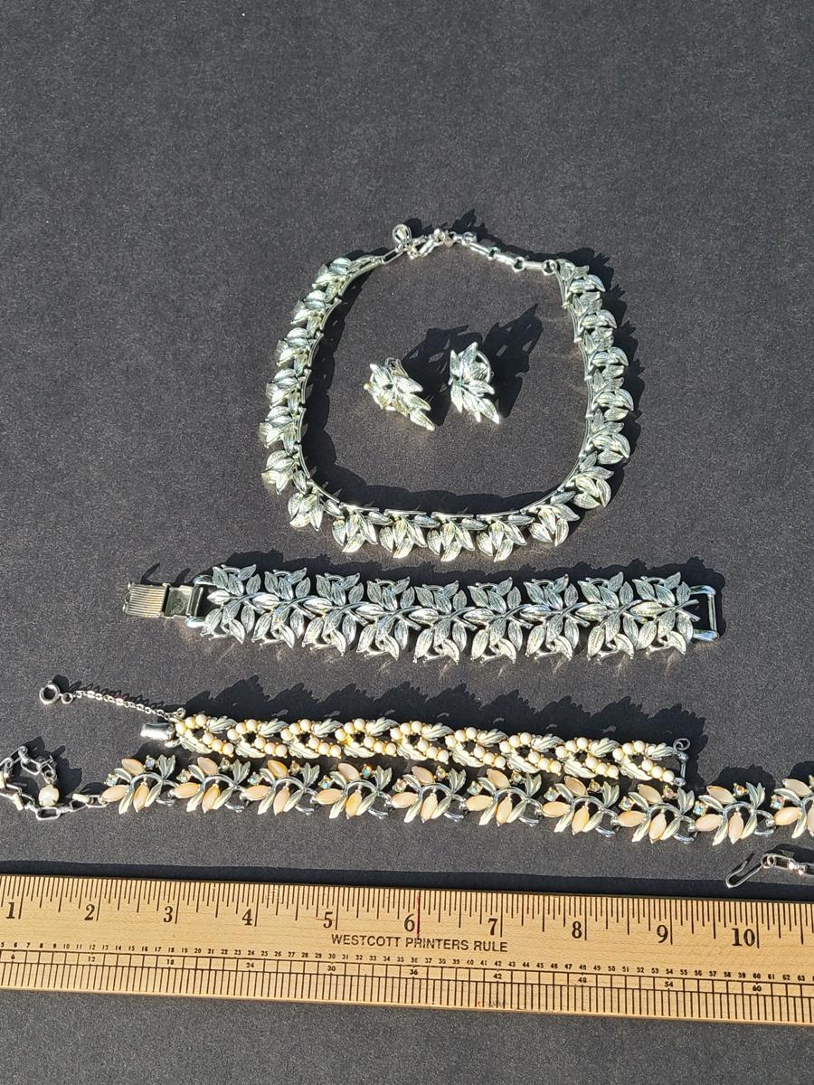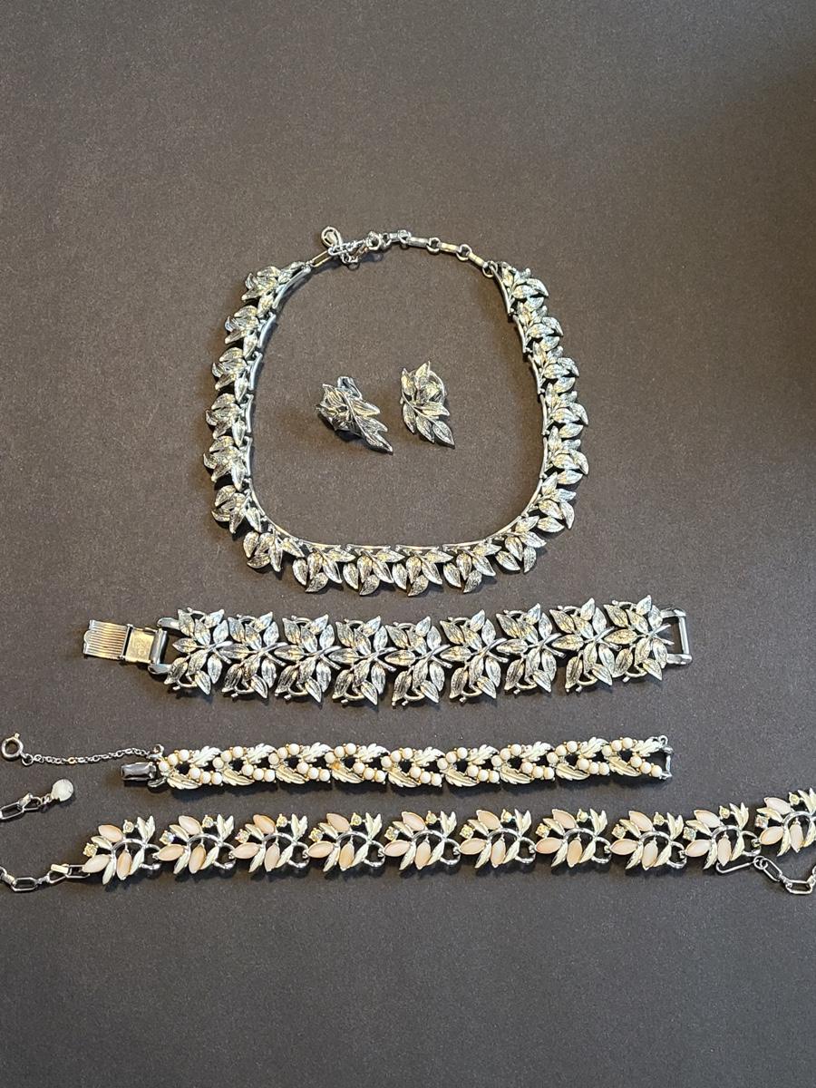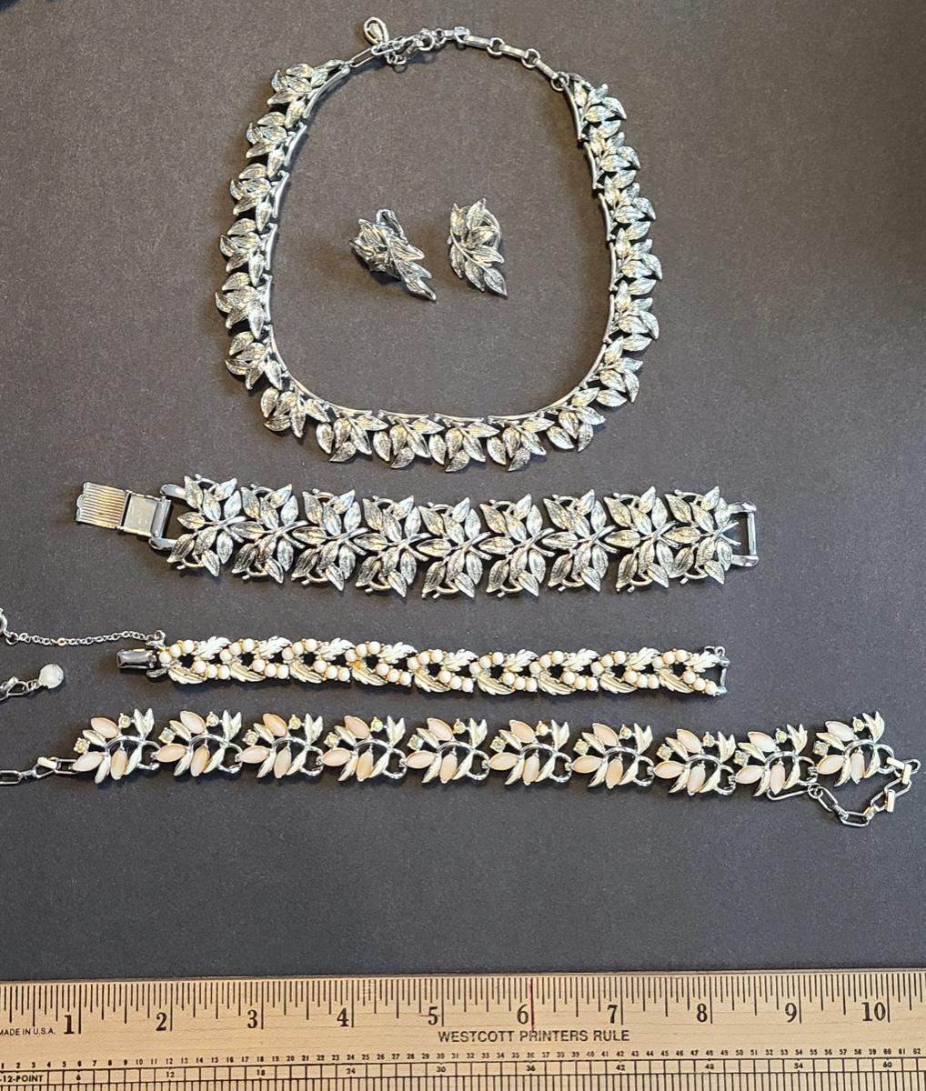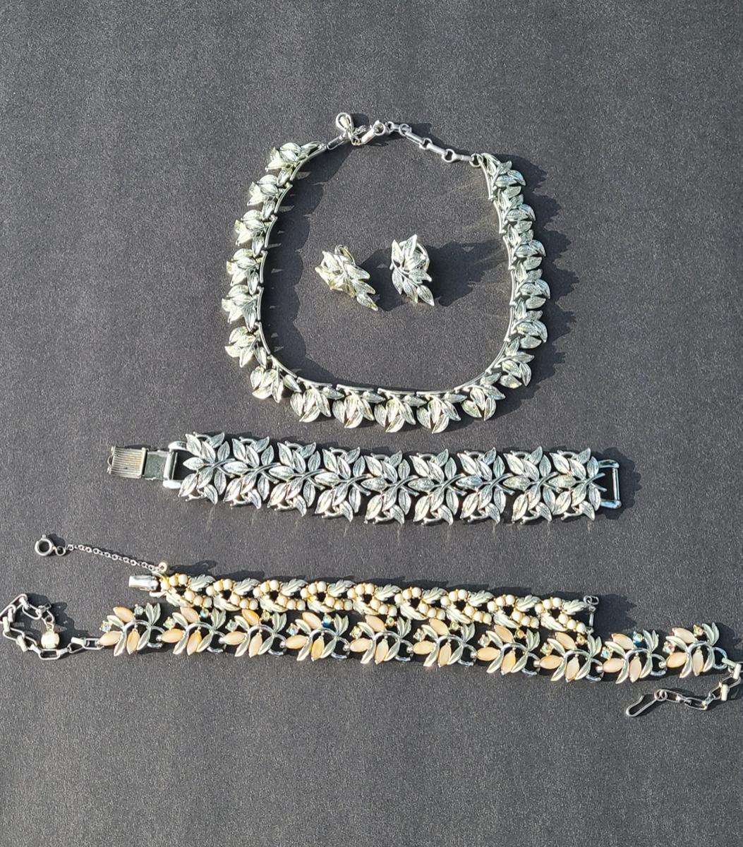 Gorgeous "chunky" Coro matching necklace, earrings, and bracelet set. These are marked. Also included are two unmarked vintage bracelets, one is a leaf motif pattern with faux pearl drops, and the other rhinestones and peachy pink accents. Please see all pictures as they are the best representation of the items. The pictures show condition, measurements if taken, and what is included in the lot. Due to the large amount that we photograph and the time frame, we are not always able to take measurements. All items unless noted, are pre-owned and have been used. If you purchased furniture, you must bring help. We do not allow one person to carry large furniture out on their own. Bring help, tools and a truck for the safety of our client’s homes, and your personal safety. Company policy. Thank you..