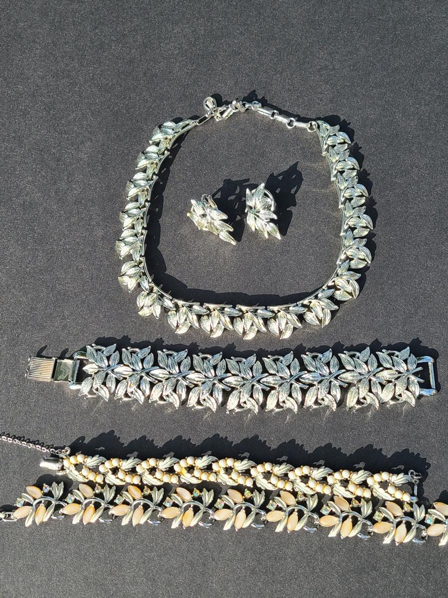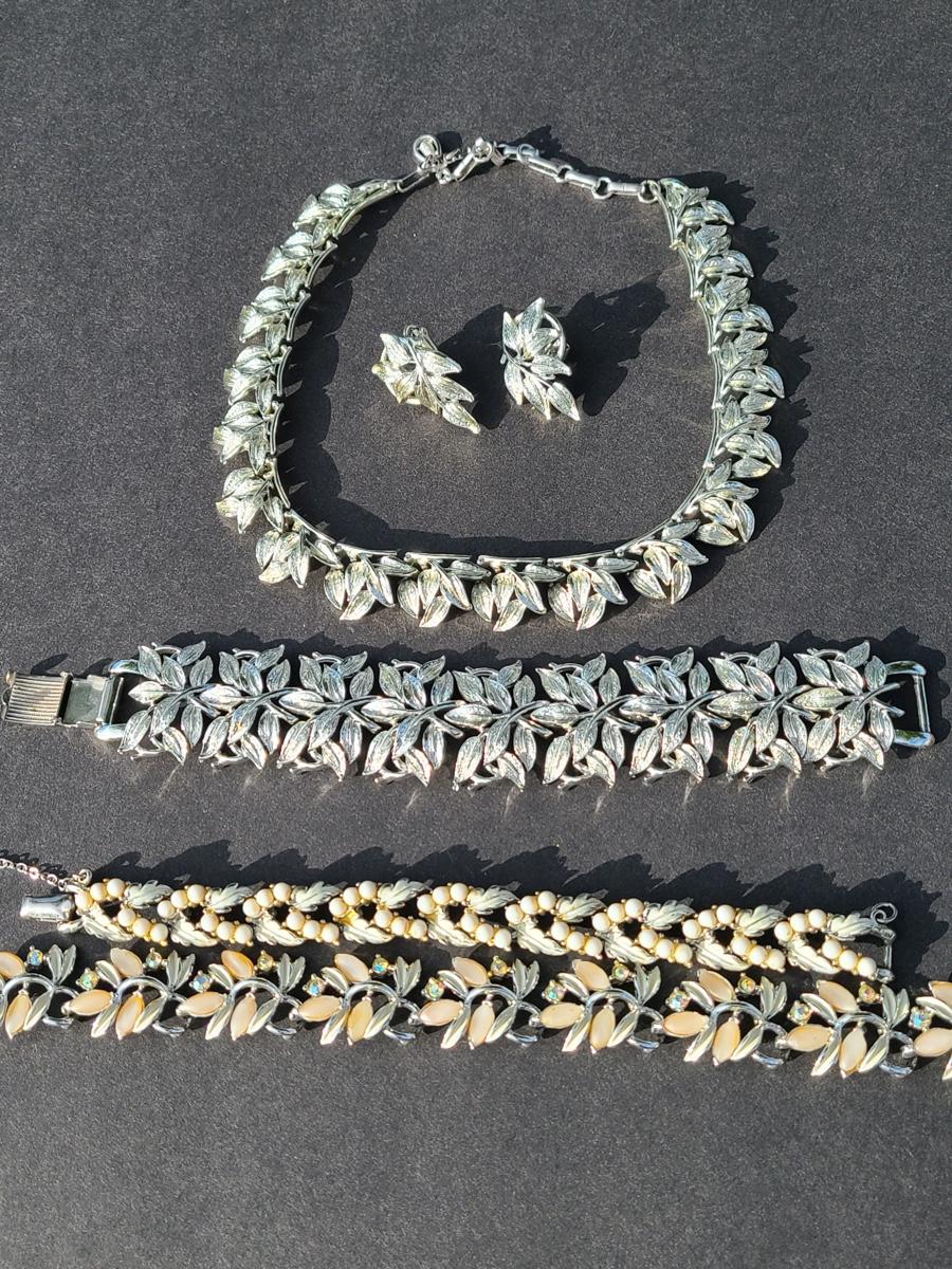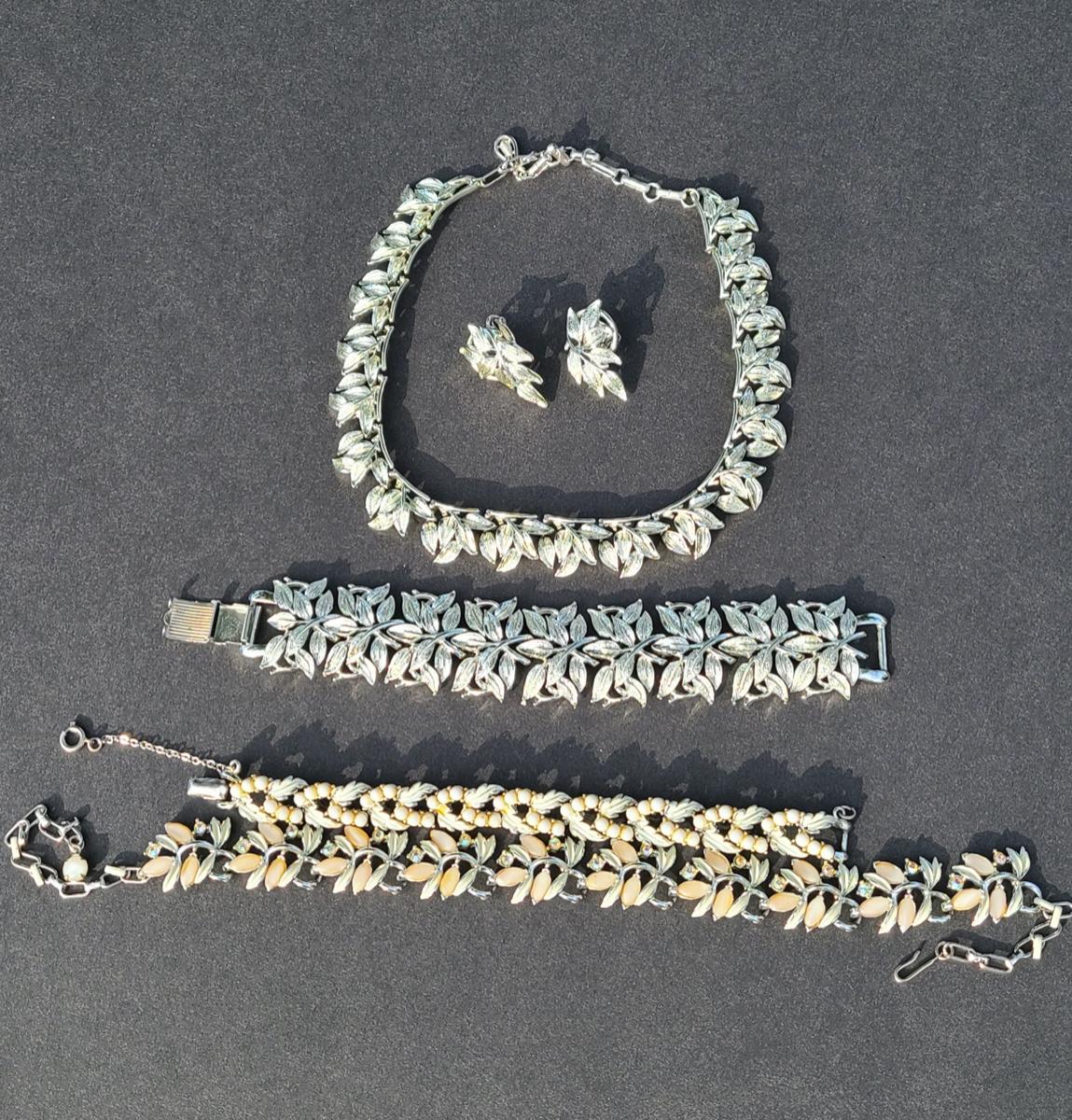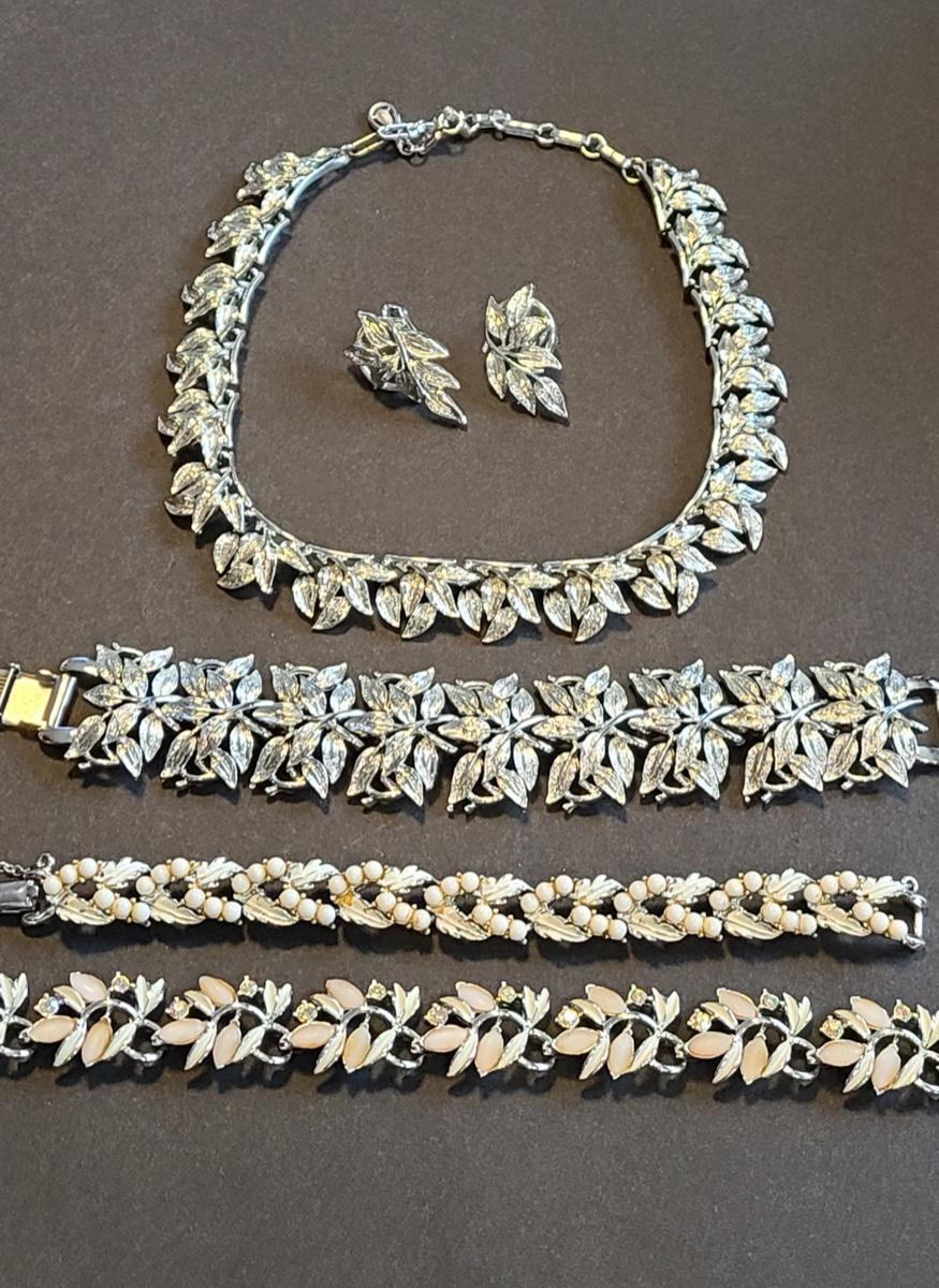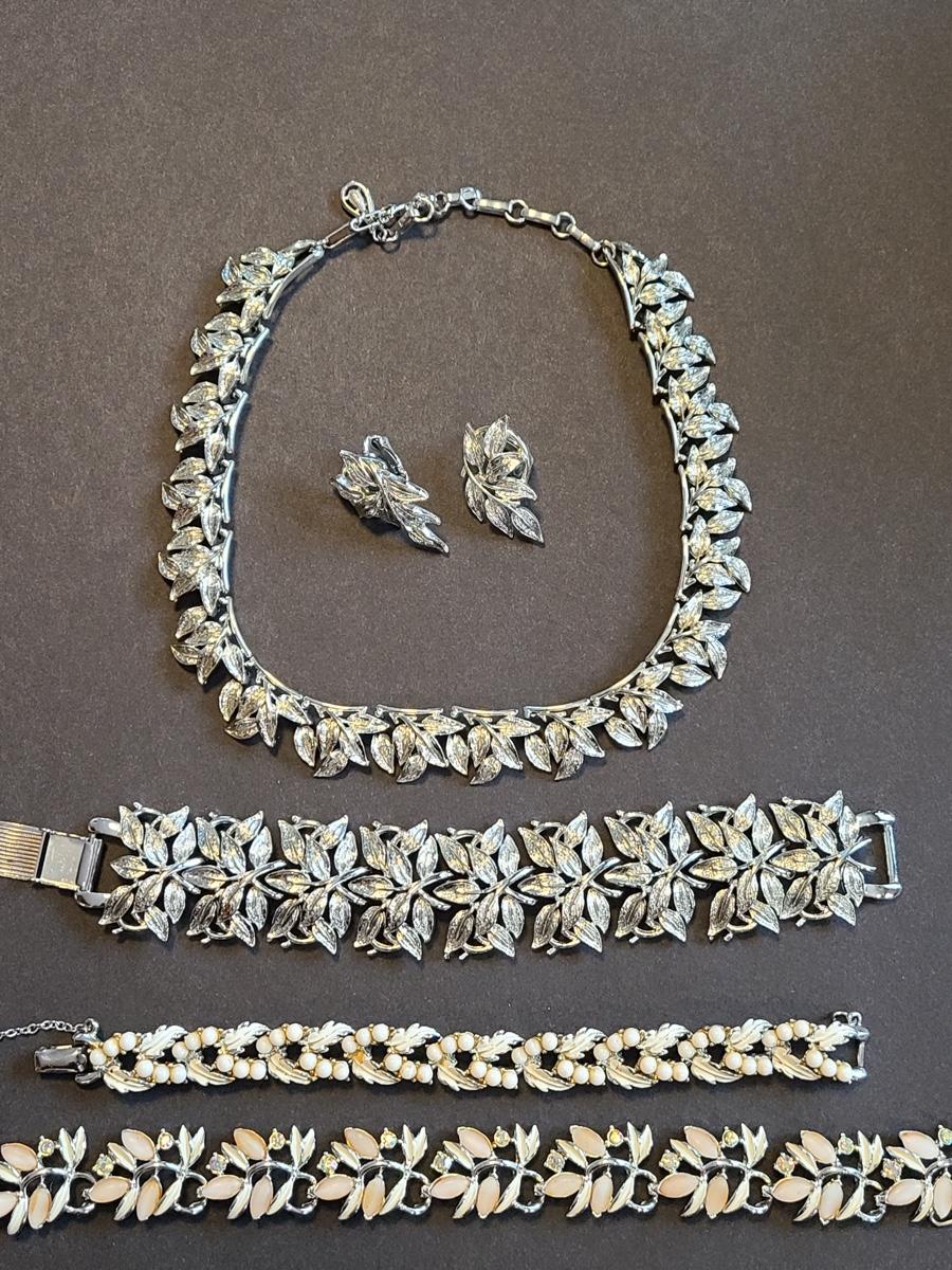 Gorgeous "chunky" Coro matching necklace, earrings, and bracelet set. These are marked. Also included are two unmarked vintage bracelets, one is a leaf motif pattern with faux pearl drops, and the other rhinestones and peachy pink accents. Please see all pictures as they are the best representation of the items. The pictures show condition, measurements if taken, and what is included in the lot. Due to the large amount that we photograph and the time frame, we are not always able to take measurements. All items unless noted, are pre-owned and have been used. If you purchased furniture, you must bring help. We do not allow one person to carry large furniture out on their own. Bring help, tools and a truck for the safety of our client’s homes, and your personal safety. Company policy. Thank you..
